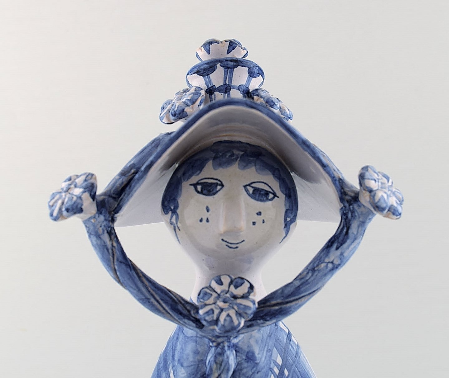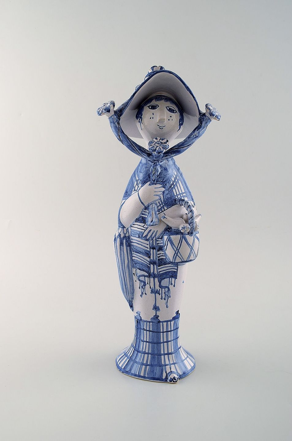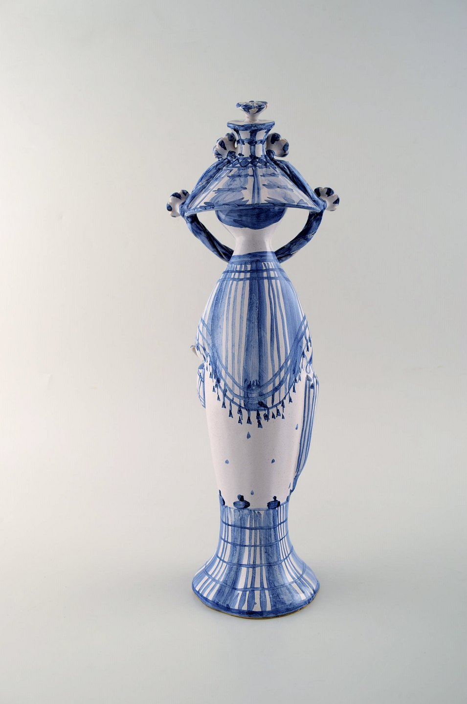 Bjørn Wiinblad unik keramik figur. "Efterår" i blå "Årstiderne" fra 2002. Signeret og dateret. Måler: 33 x 12 cm. I perfekt stand. Alle 4 figurer fra "Årstiderne" på lager.
