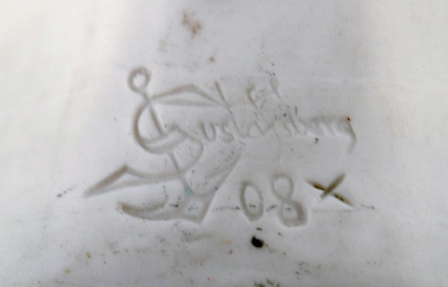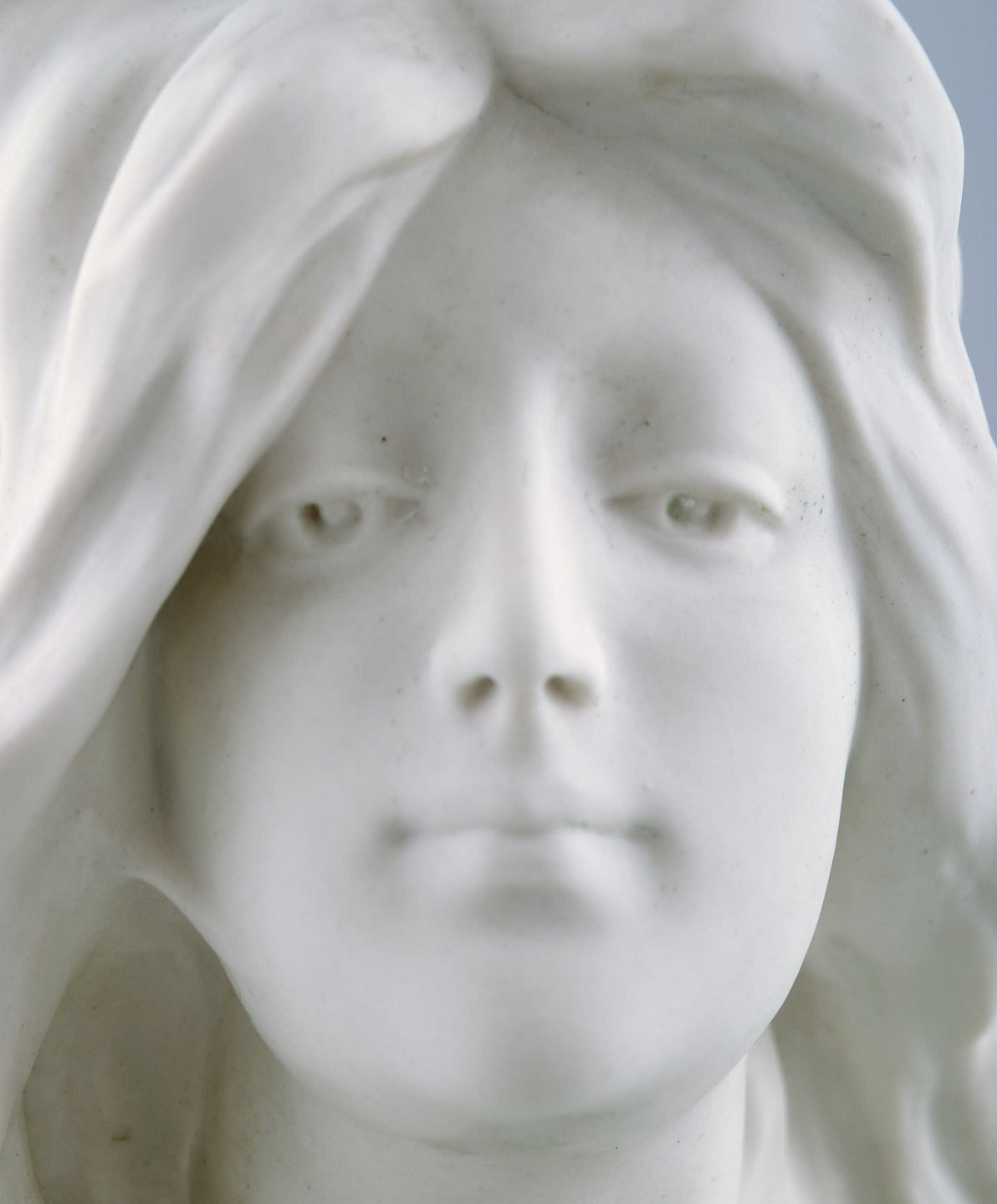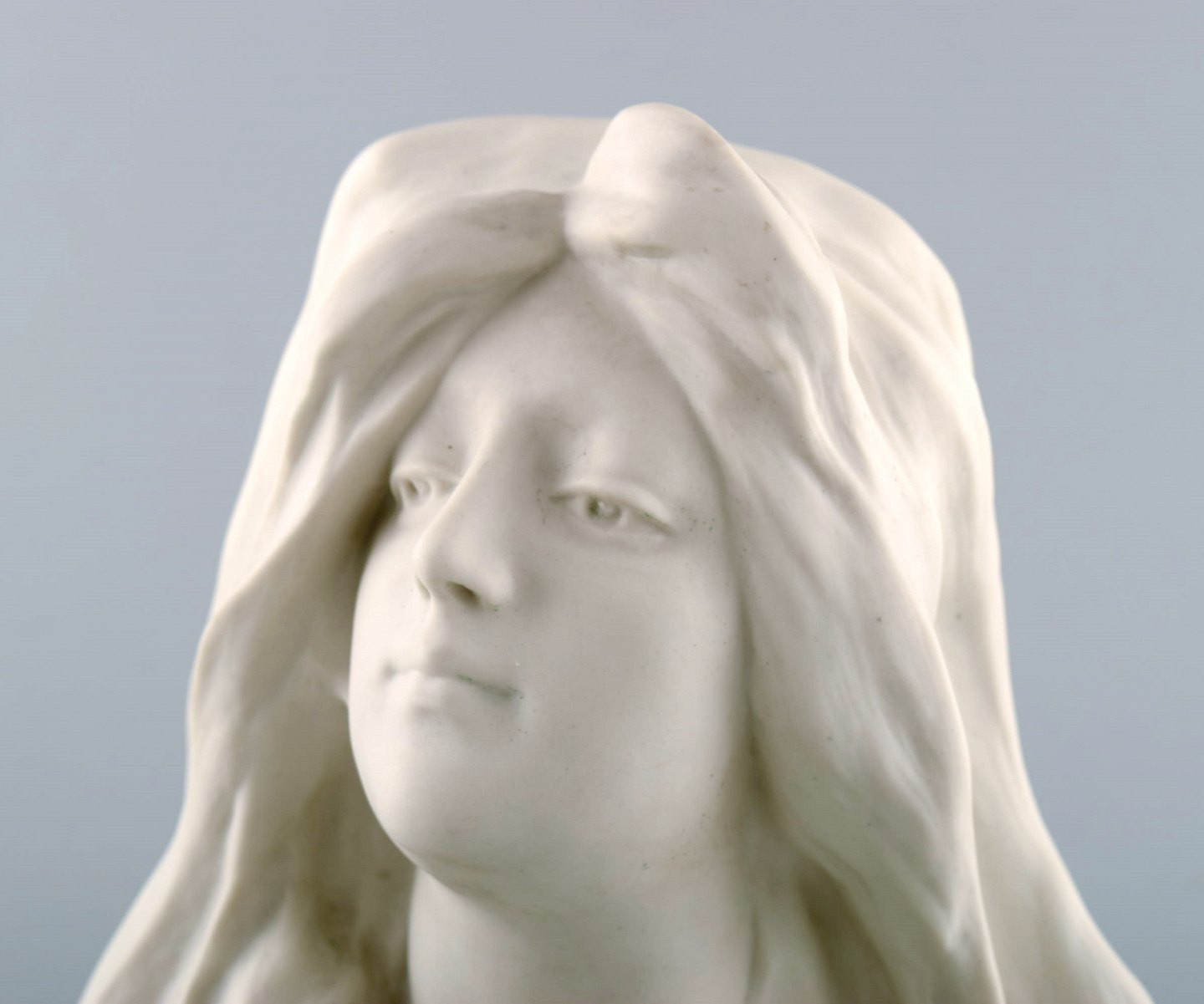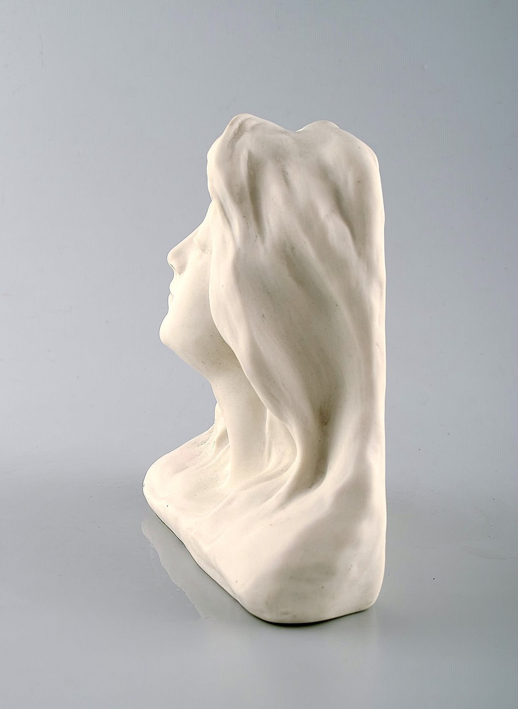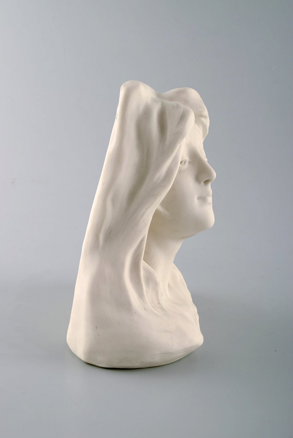 Gustavsberg buste af ung kvinde. Art nouveau skulptur i biscuit dateret 1908. Måler: 18 x 17,5 cm. I perfekt stand. Stemplet: Gustafsberg 08.
