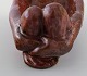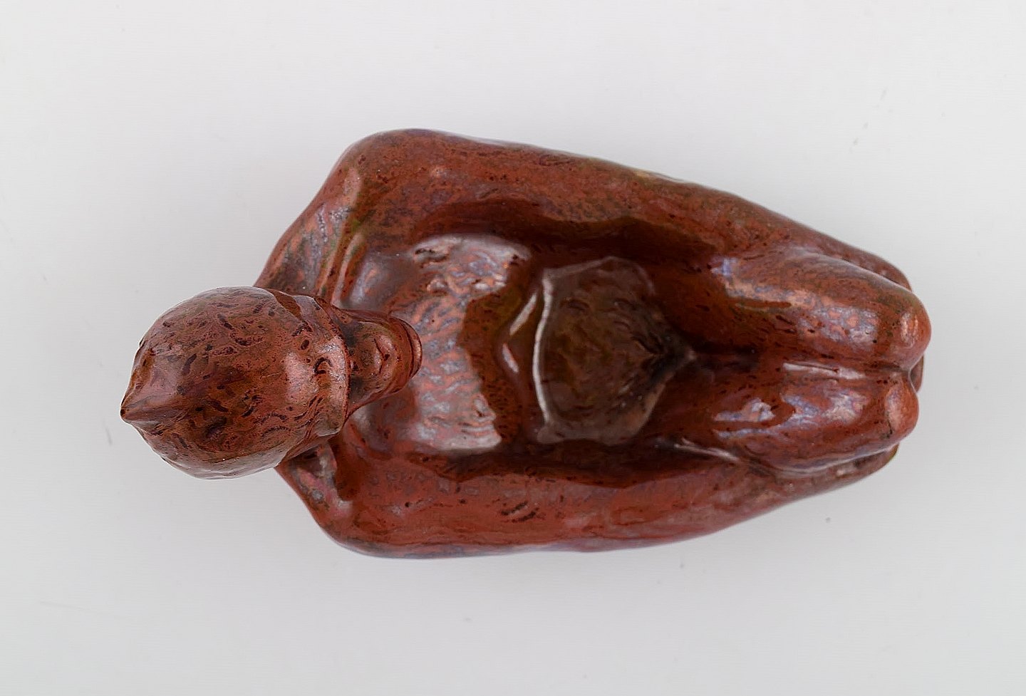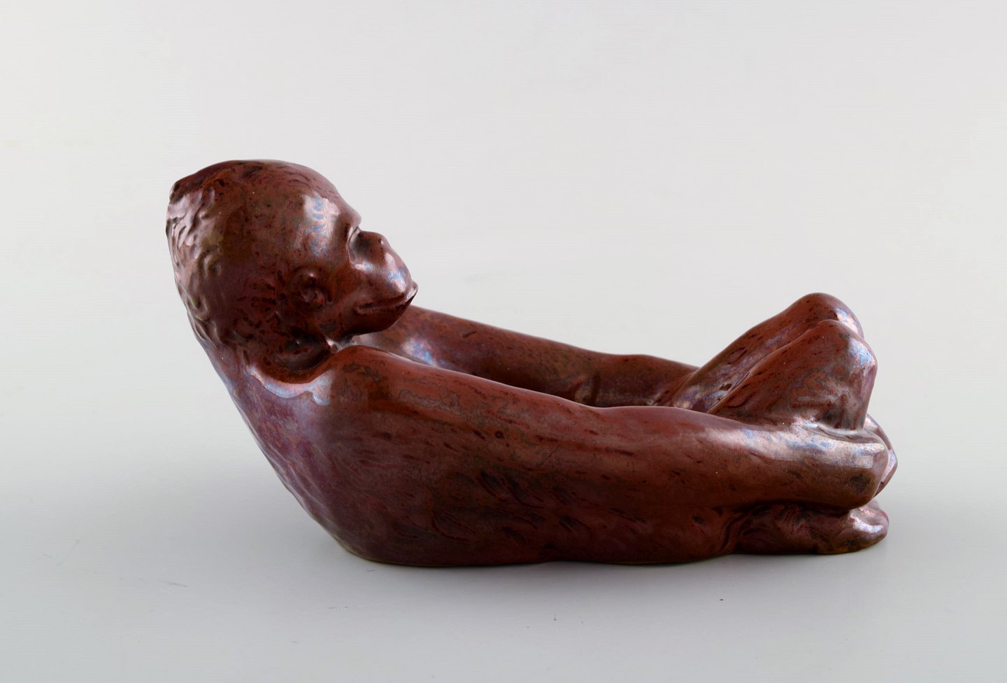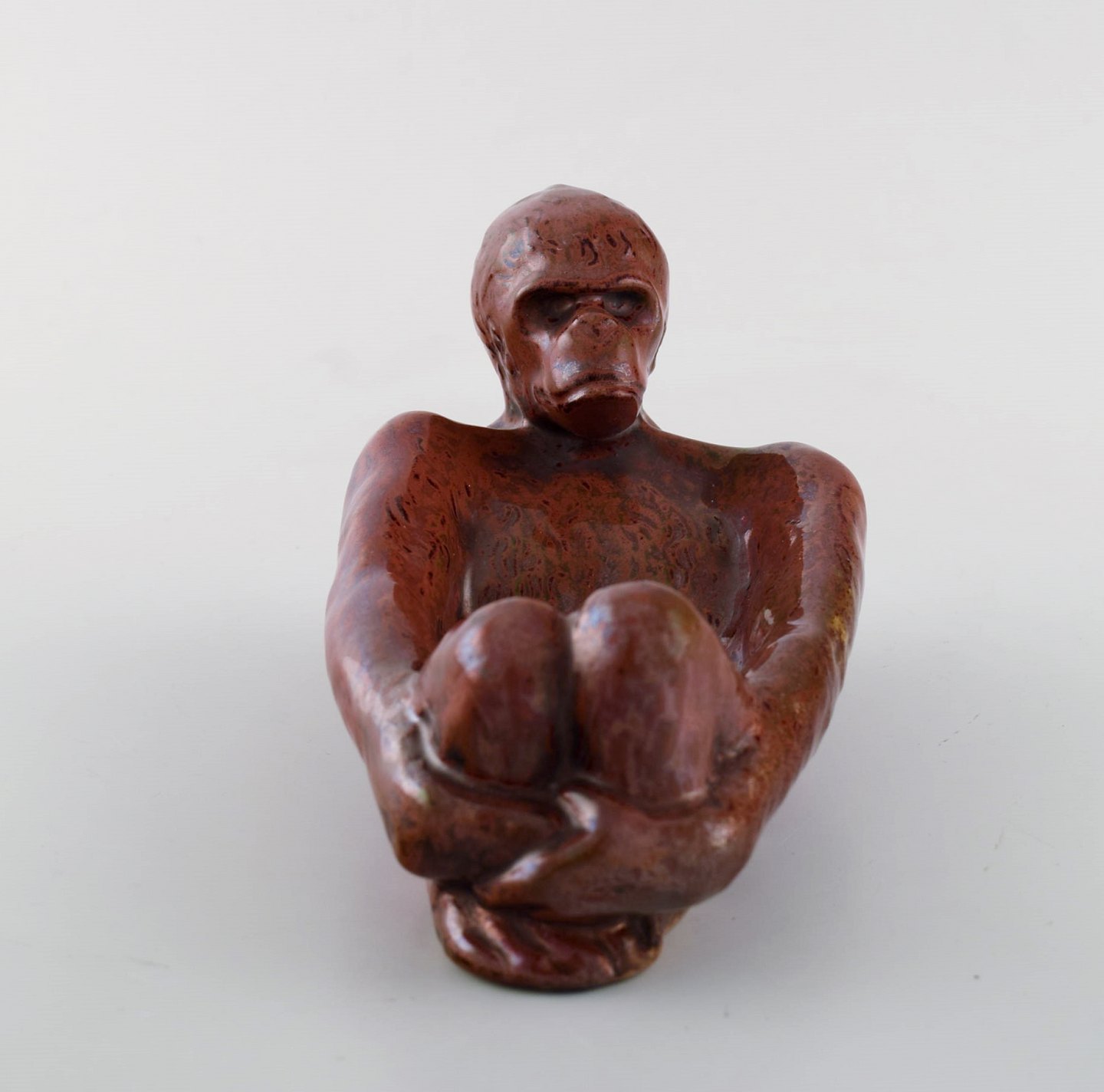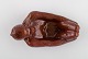 Hjorth (Bornholm) glaseret stentøjsfigur. Liggende abe. 1940'erne. Smuk lustre glasur i røde nuancer. Modelnummer 717.