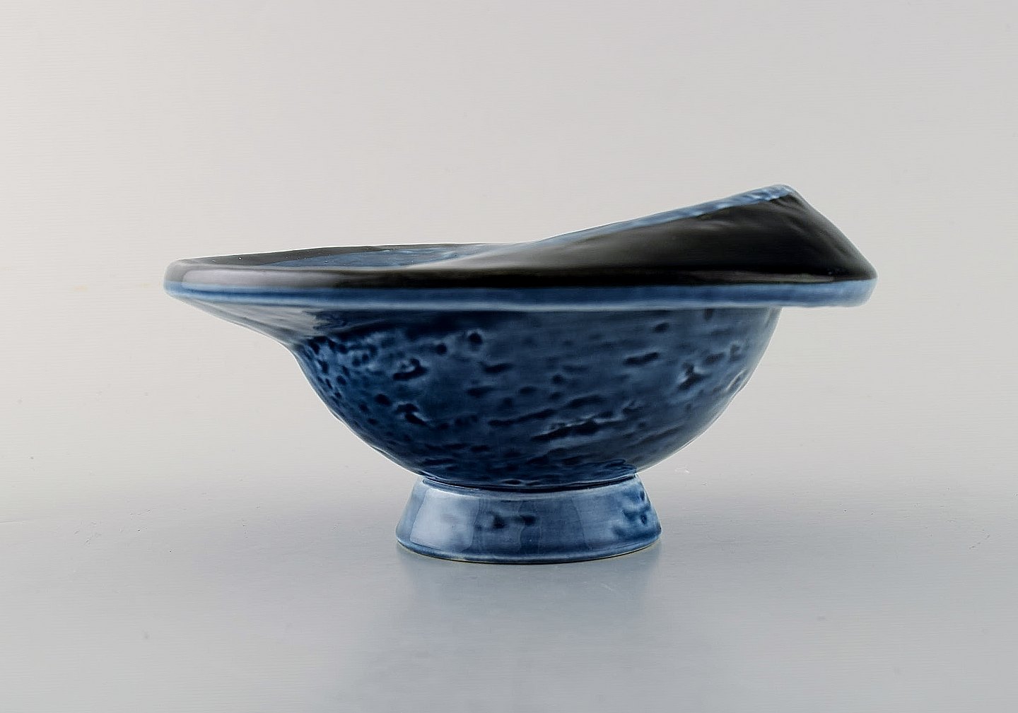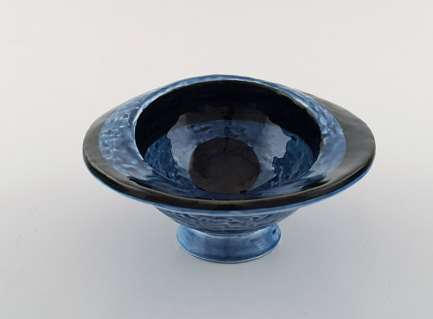 Vilhelm Bjerke Petersen (f. 1909, d. 1957) for Rörstrand. Sjælden "Abstrakta" keramik skål på fod. Smuk glasur i blå og sorte toner. Surrealistisk design, 1951-54.