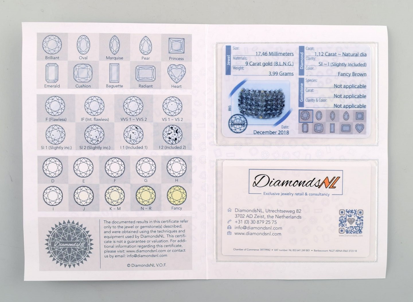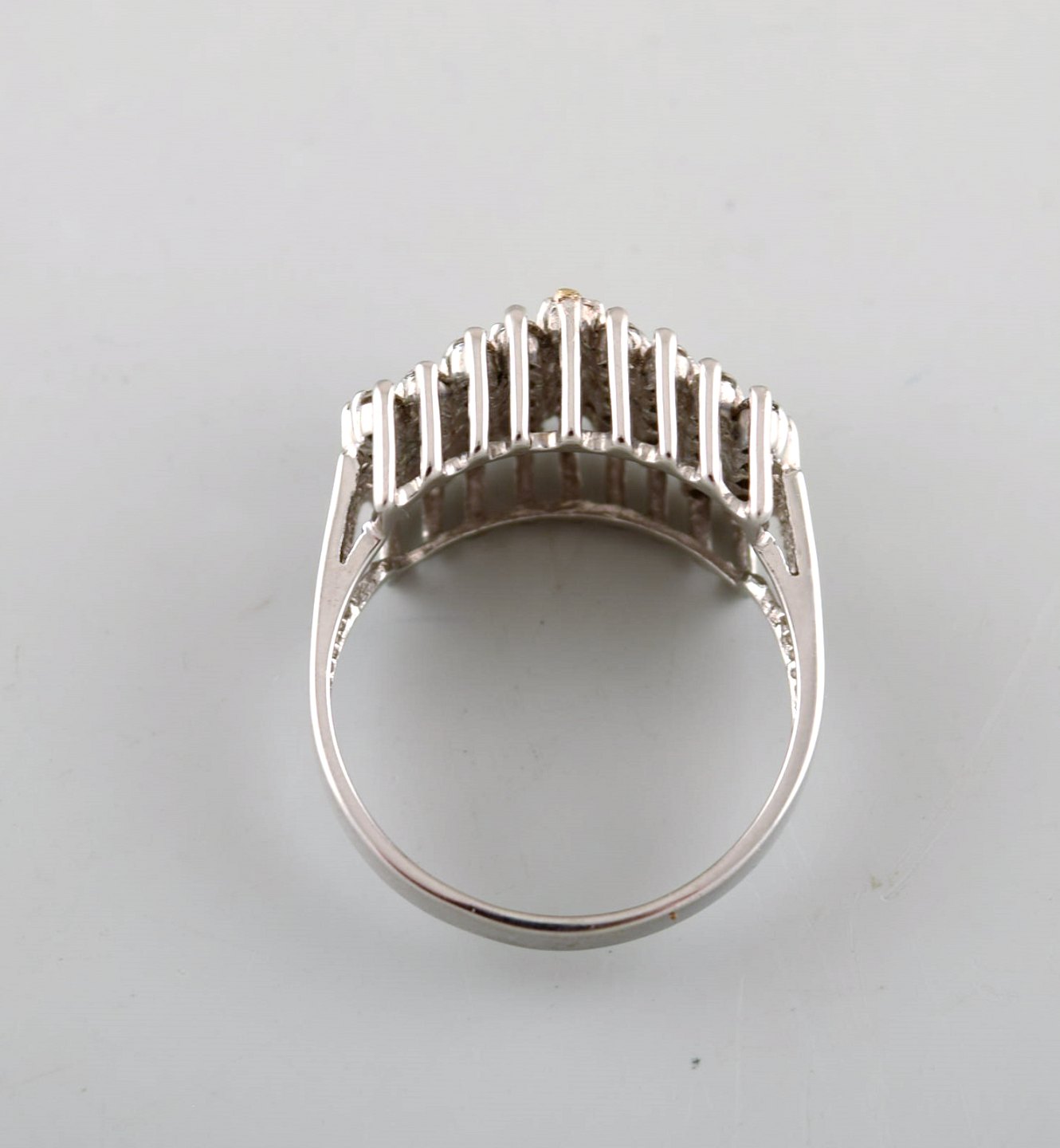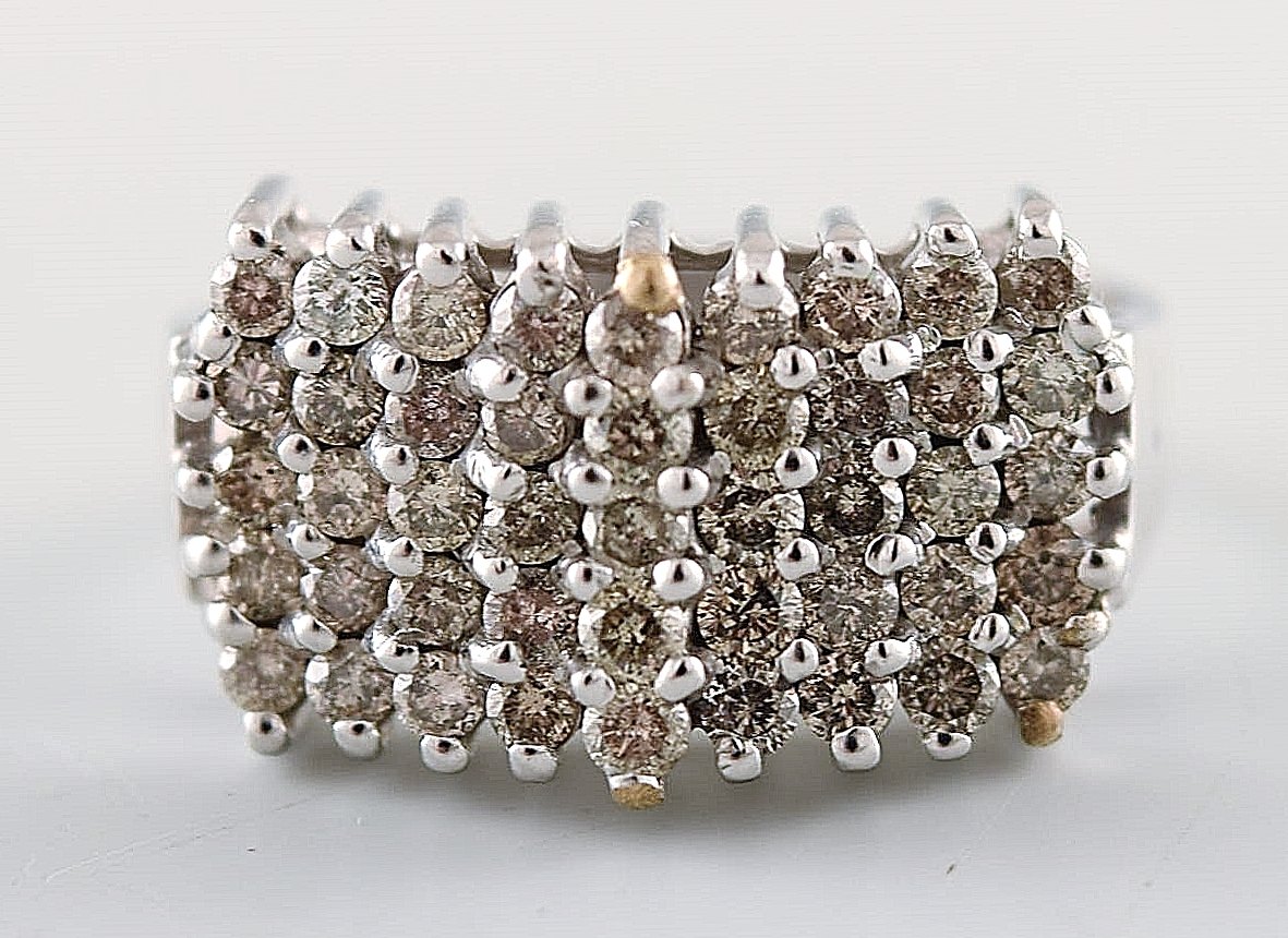 Stor art deco ring i 9 karat hvidguld med talrige diamanter. Certifikat medfølger. I flot stand. Karat: 1.12. Klarhed: SI. Farve: Fancy brown. Vægt: 3,99 gram. Måler: 17,46 mm.