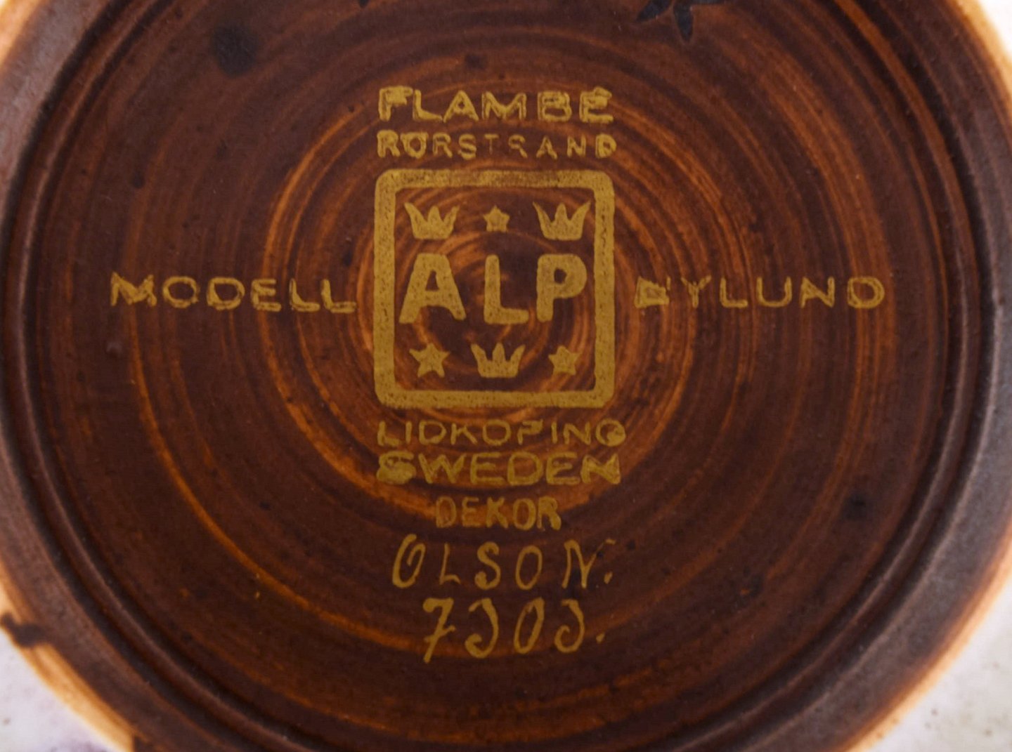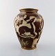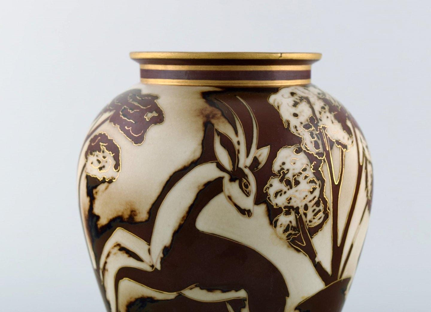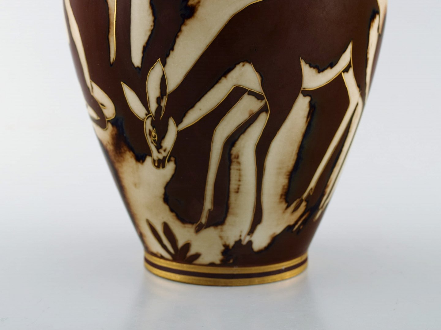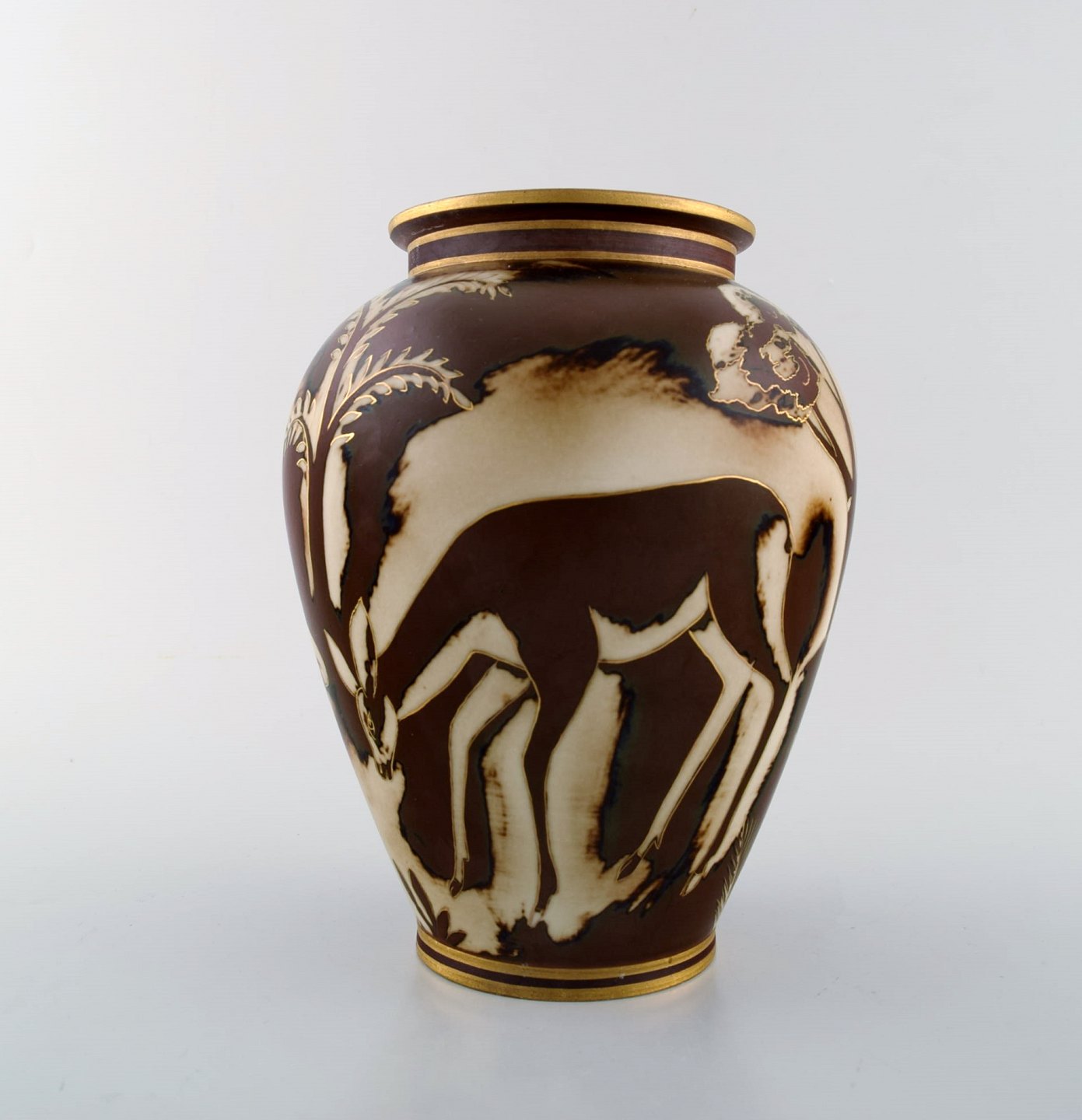 Gunnar Nylund for Rørstrand / ALP Lidköping. Unique hand-drawn art deco Flambé vase with deer. Gold Decoration. 1930's. In very good condition. Stamped. Decorator: Olson. Measures: 20 x 16 cm.