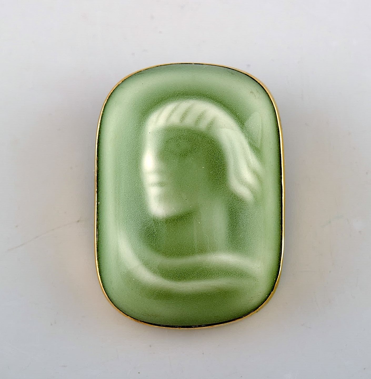 Jais Nielsen for Royal Copenhagen. Broche / vedhæng af celadonglaseret porcelæn indfattet i forgyldt sterlingsølv udført af Dragsted. 1930'erne