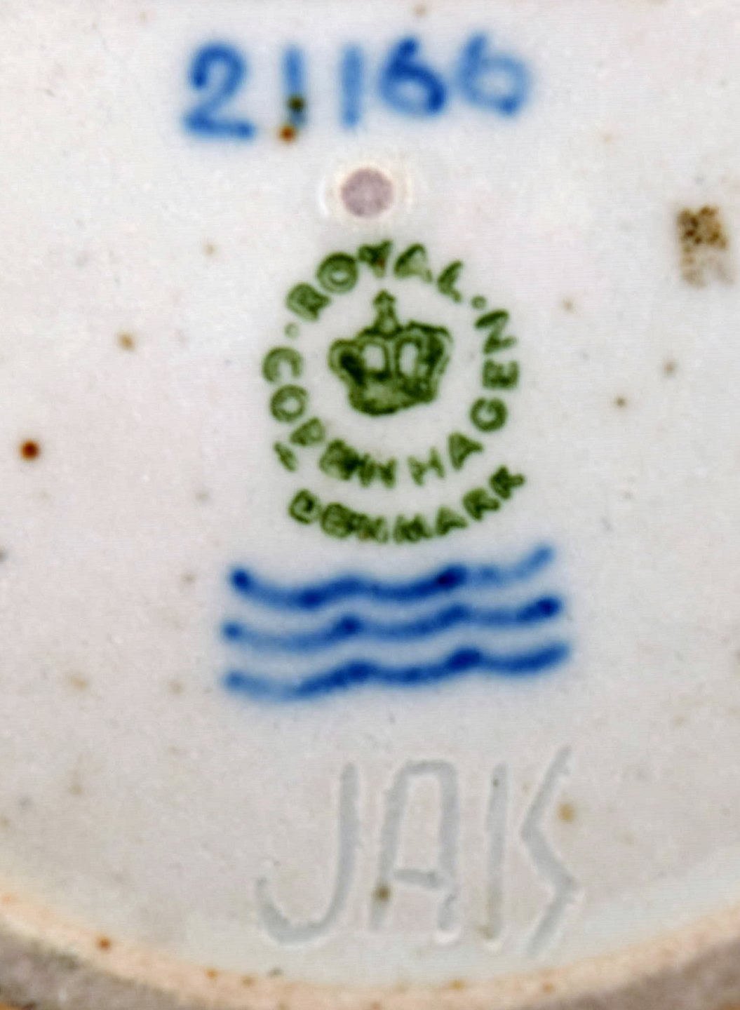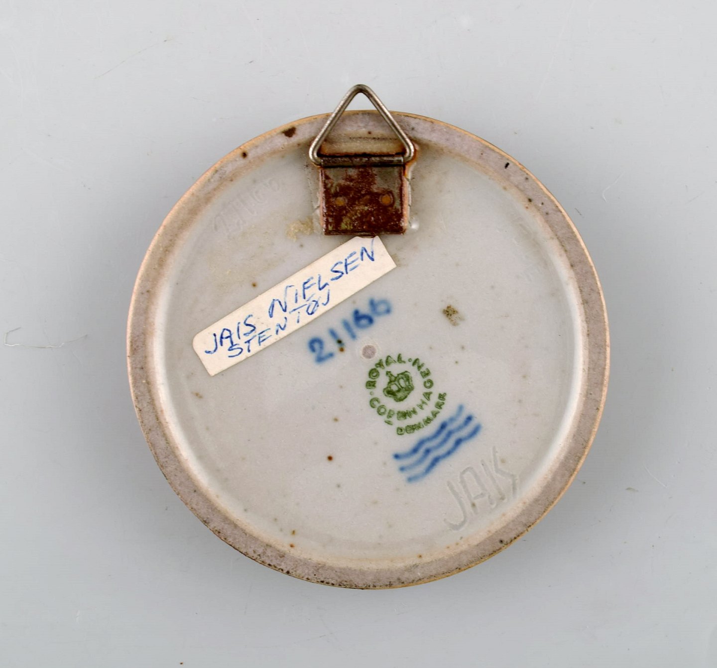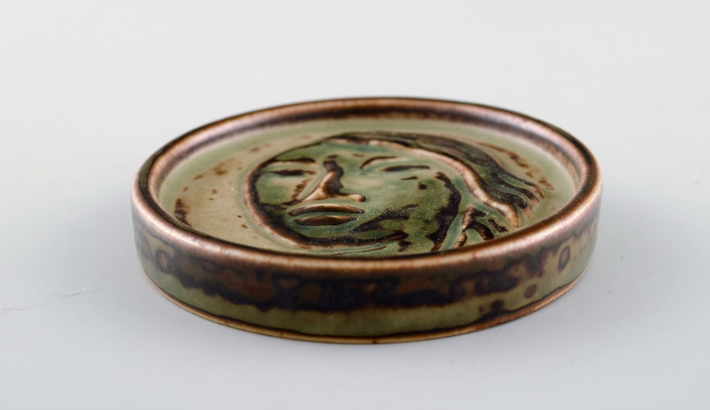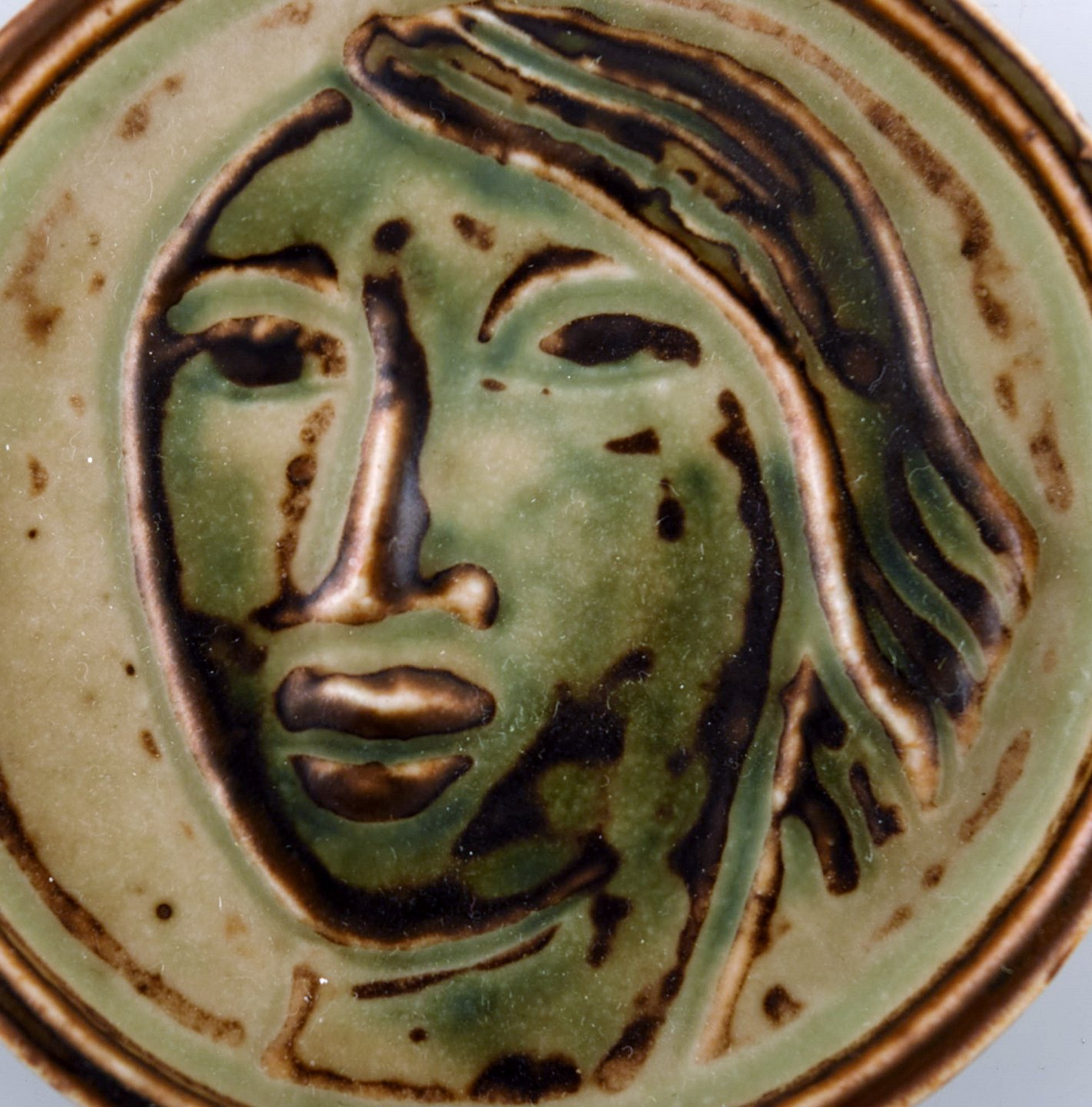 Jais Nielsen for Royal Copenhagen. Keramik plakette med ansigt i smuk sung glasur. 1930'erne. I flot stand. 1. sortering. Måler: 8 x 1,5 cm Modelnummer : 21166.