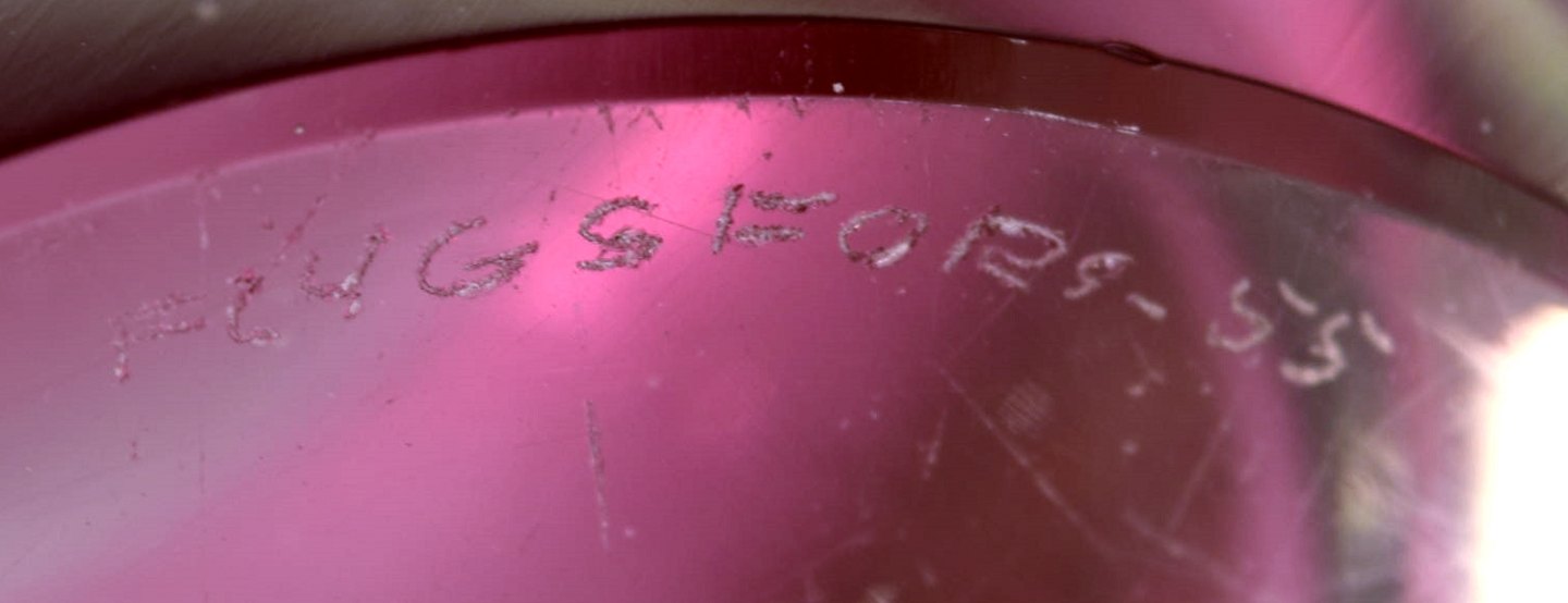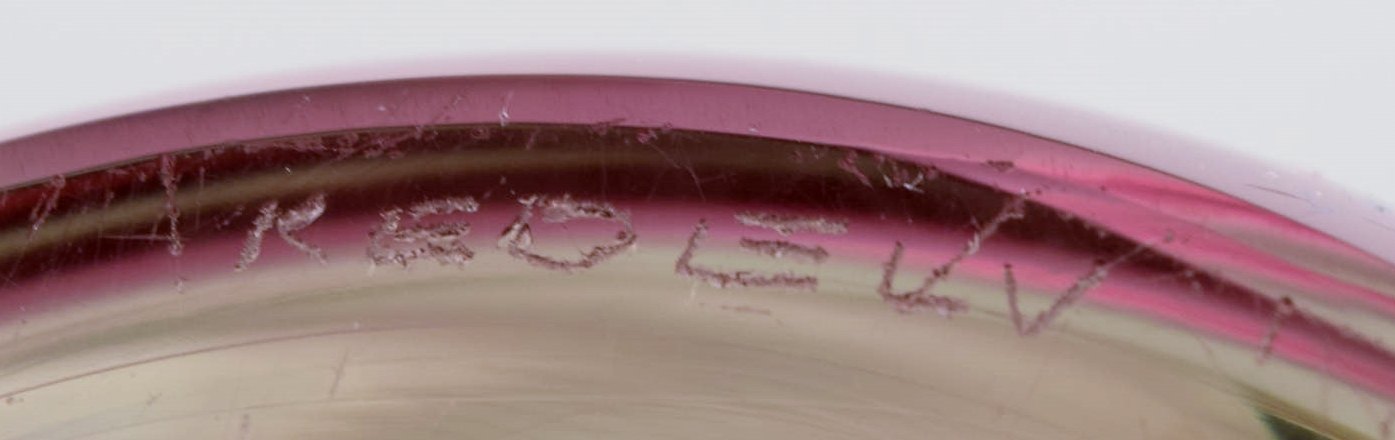 Paul Kedelv for Flygsfors. Lyserød skål i asymetrisk form. Svensk design, dateret 1955. I flot stand. Indridset signatur og datering. Måler: 25 x 22 cm.