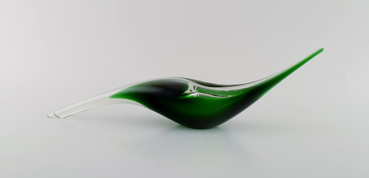 Per Lütken for Holmegaard. Samling af fem sjældne "Flamingo" vaser og skulpturer i grønt kunstglas. Dateret 1961.