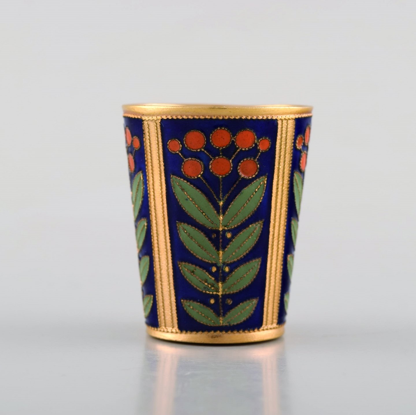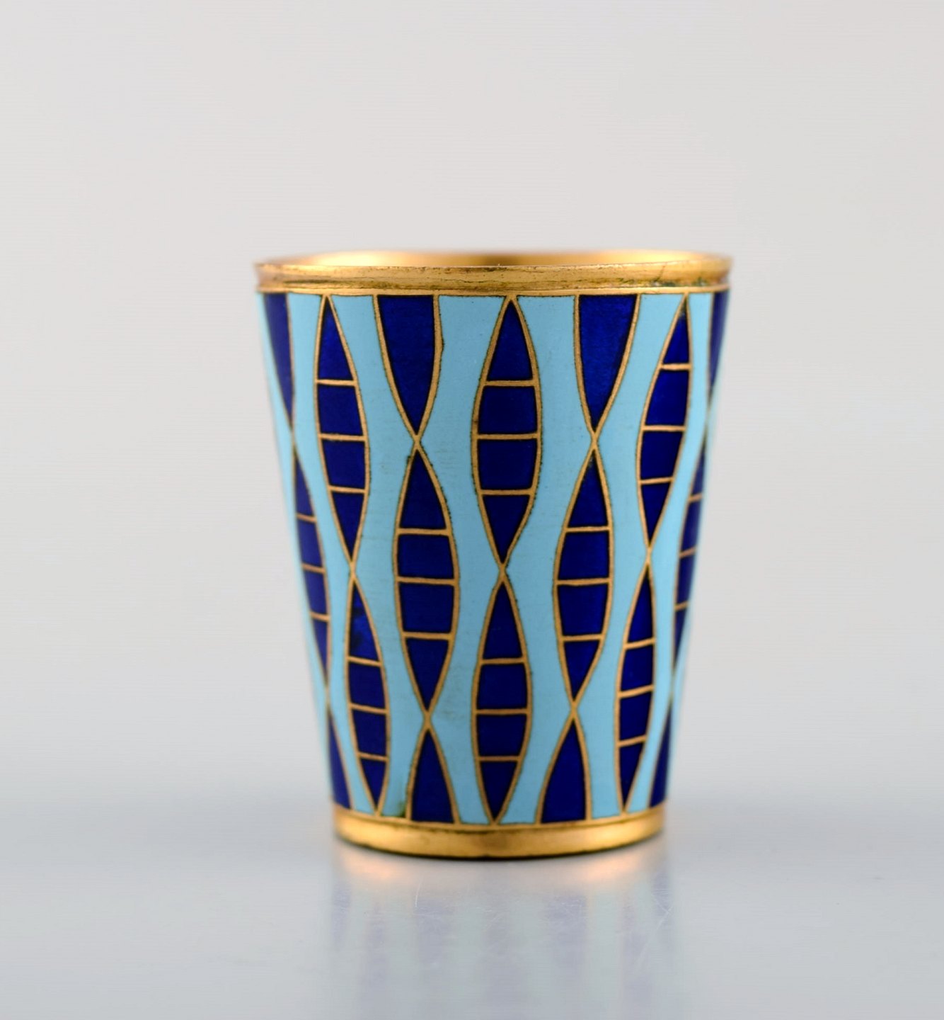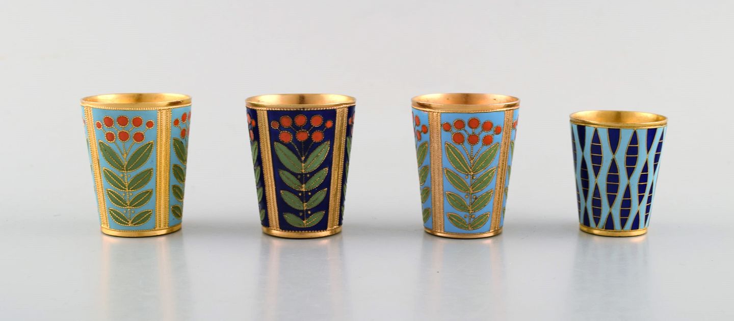 Russisk sølvsmed. Sæt på 4 russiske vodkabægre i forgyldt sølv med emaljearbejde. Midt 1900-tallet. I flot stand. Store bægre måler: 5 x 4 cm. Lille bæger måler: 4 x 3,5 cm. Stemplet.