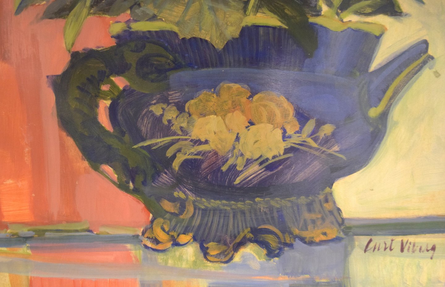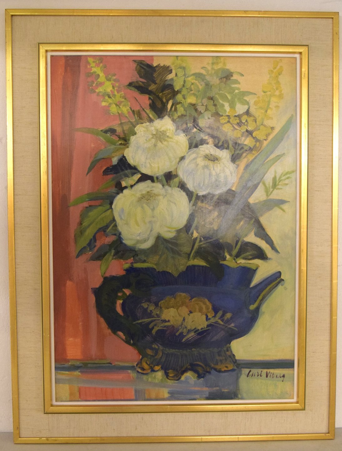 Curt Viberg (1908-1969), svensk maler. Opstilling med blomster. Olie på plade. 1960'erne. I flot stand. Signeret. Pladen måler: 70 x 50 cm. Rammen måler: 9,5 cm.