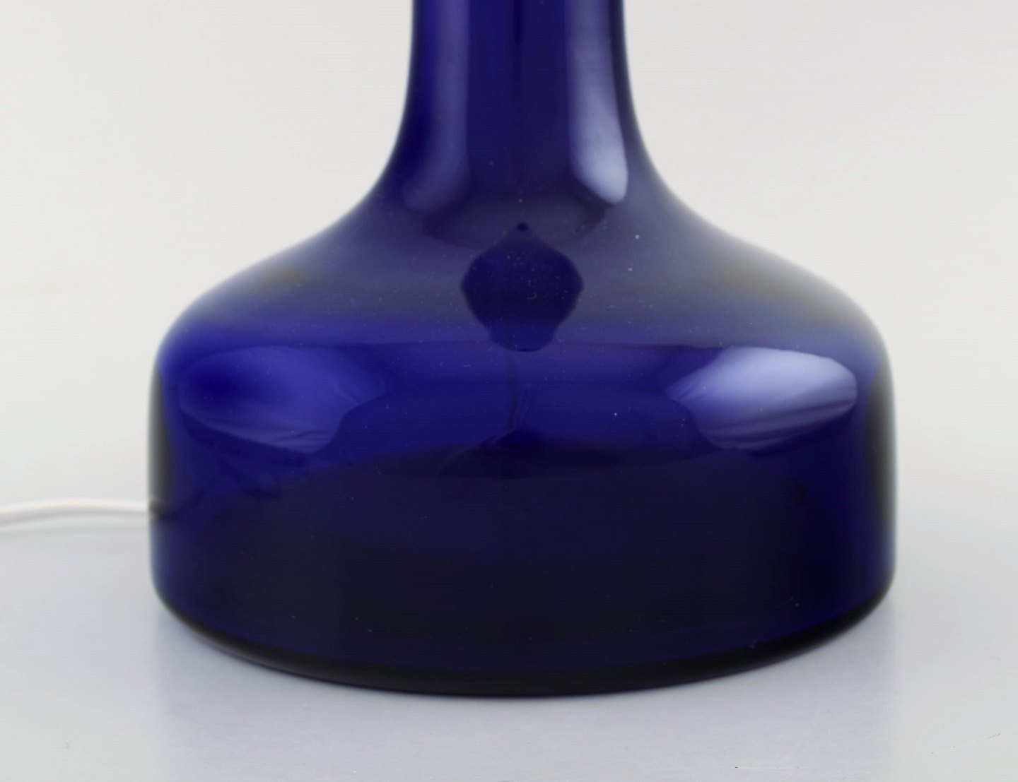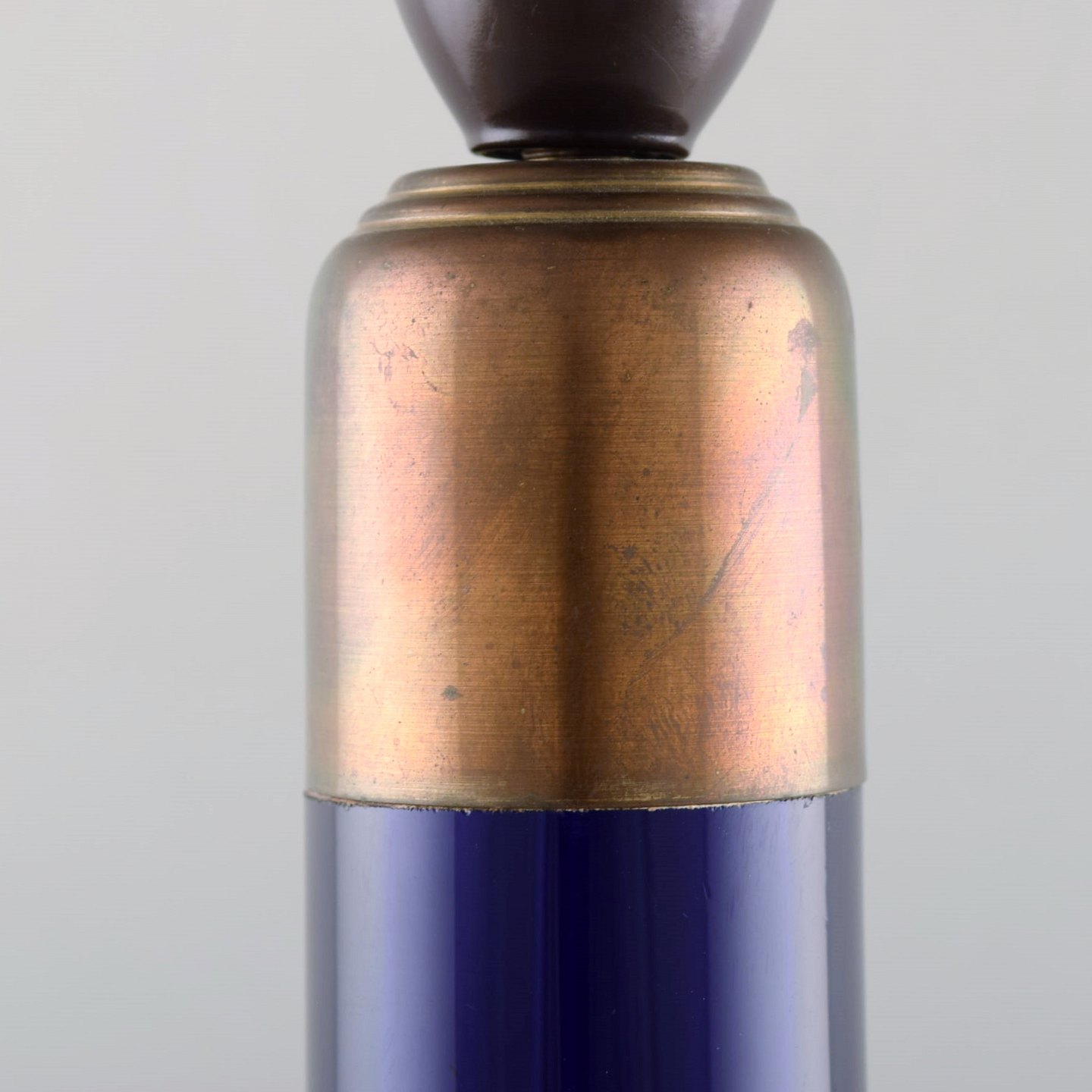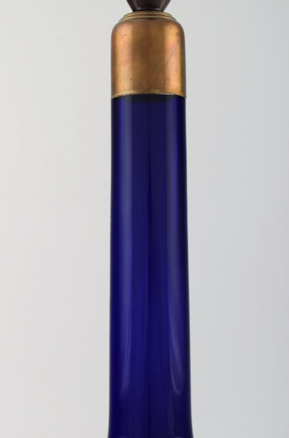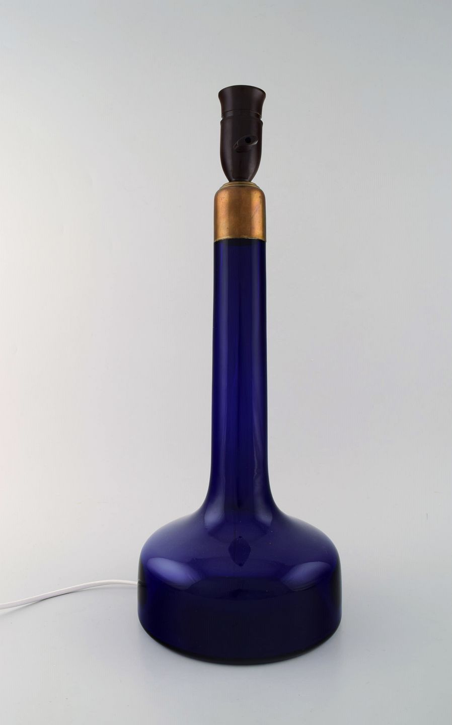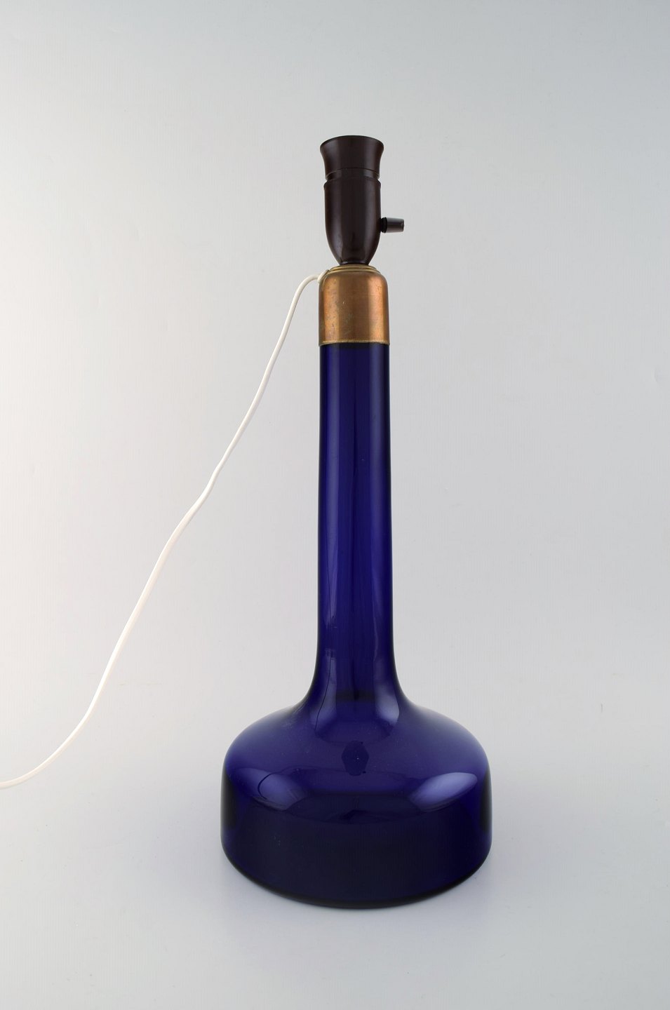 Holmegaard table lamp in dark blue art glass with brass mounting. Danish design, 1960's. In very good condition. Measures: 38 x 18.5 cm. (without socket)
