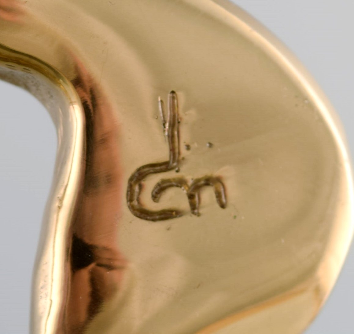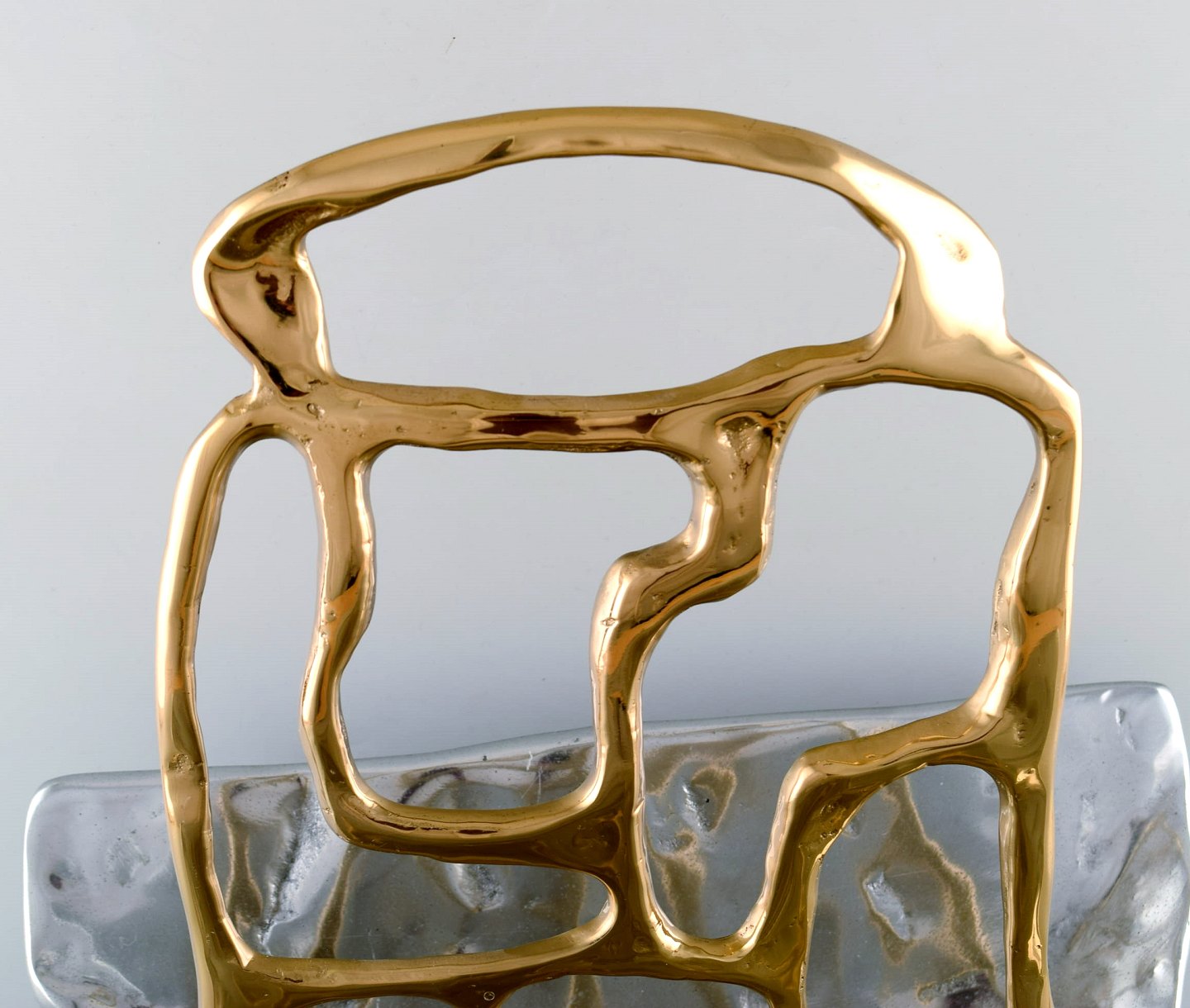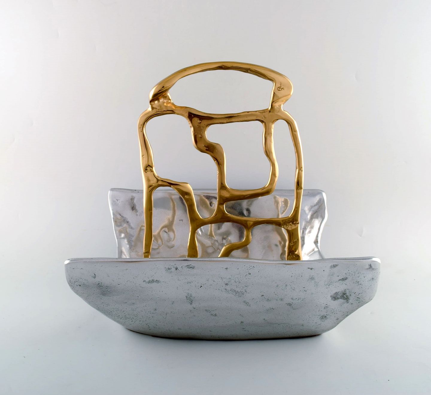 David Marshall, skotsk skulptør og designer. Stor og imponerende avisholder i aluminium med messingdekoration. Sent 1900-tallet.