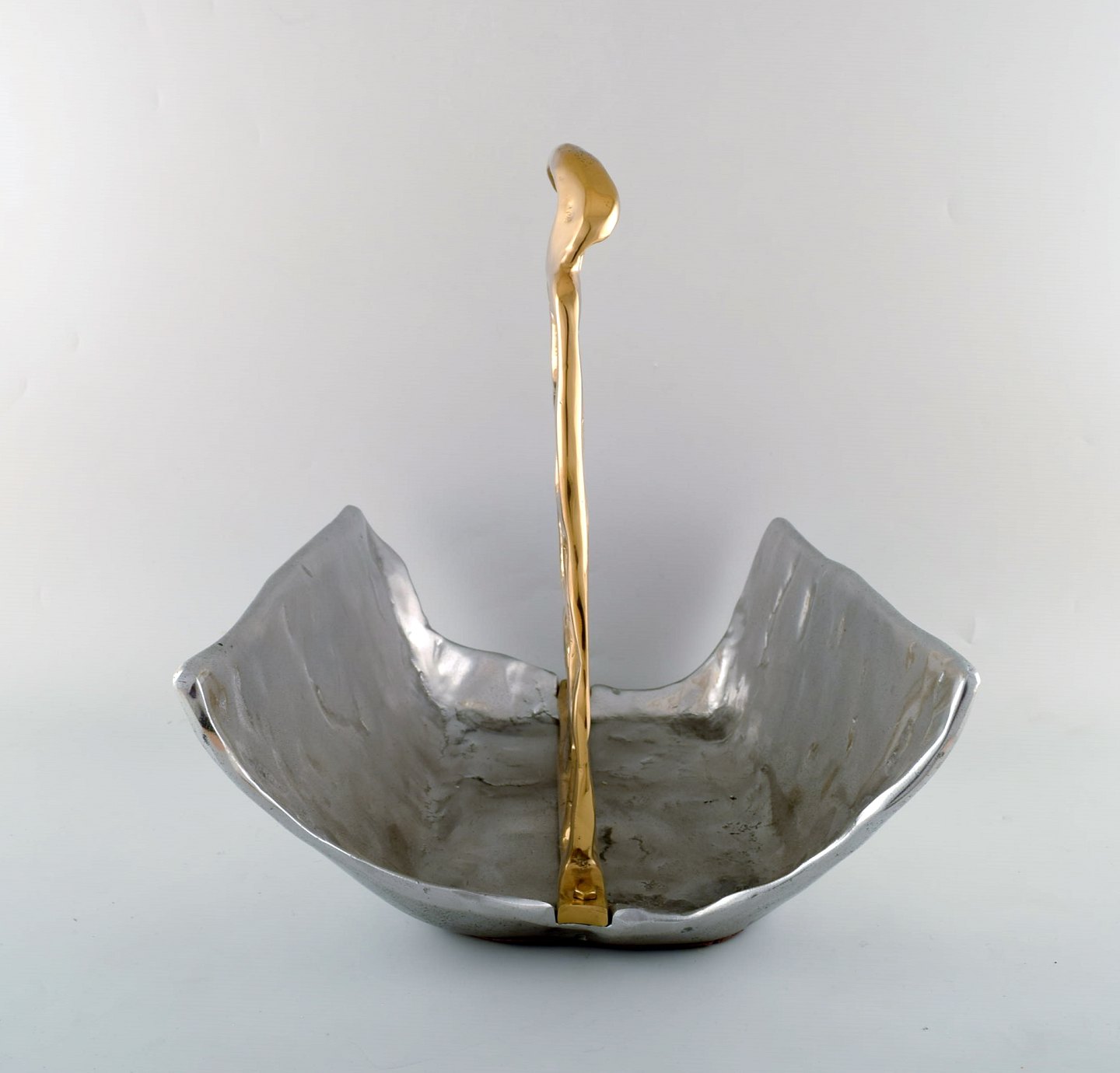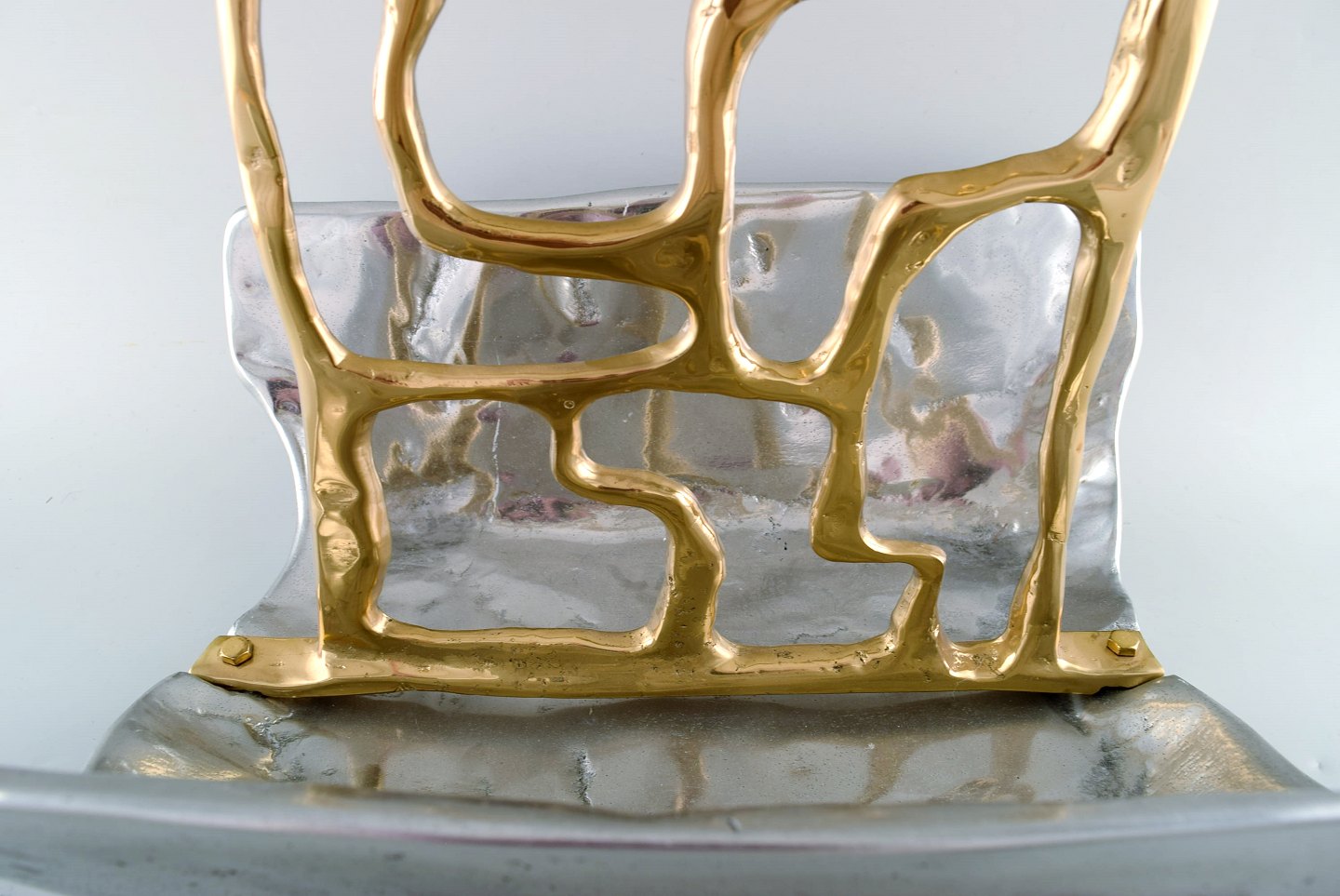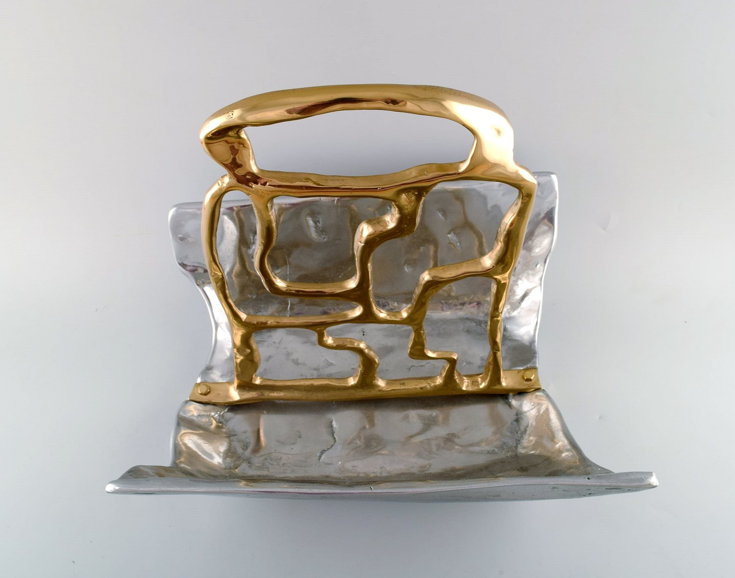 David Marshall, Scottish sculptor and designer. Large and impressive newspaper holder in aluminum with brass decoration. Late 20th century.