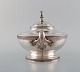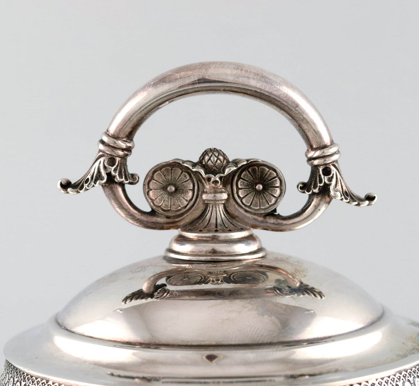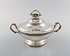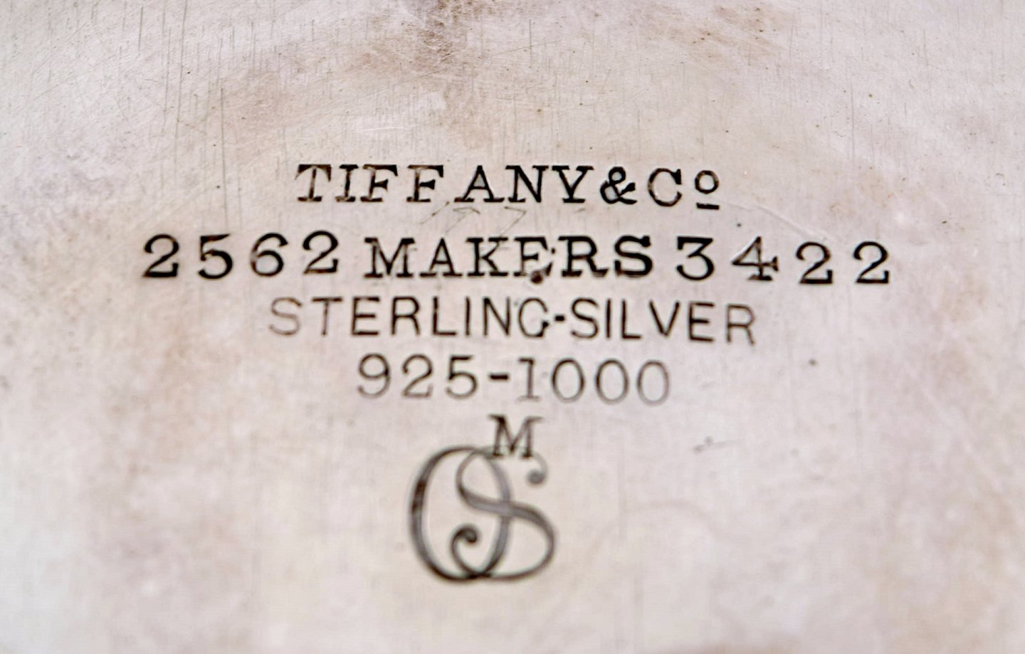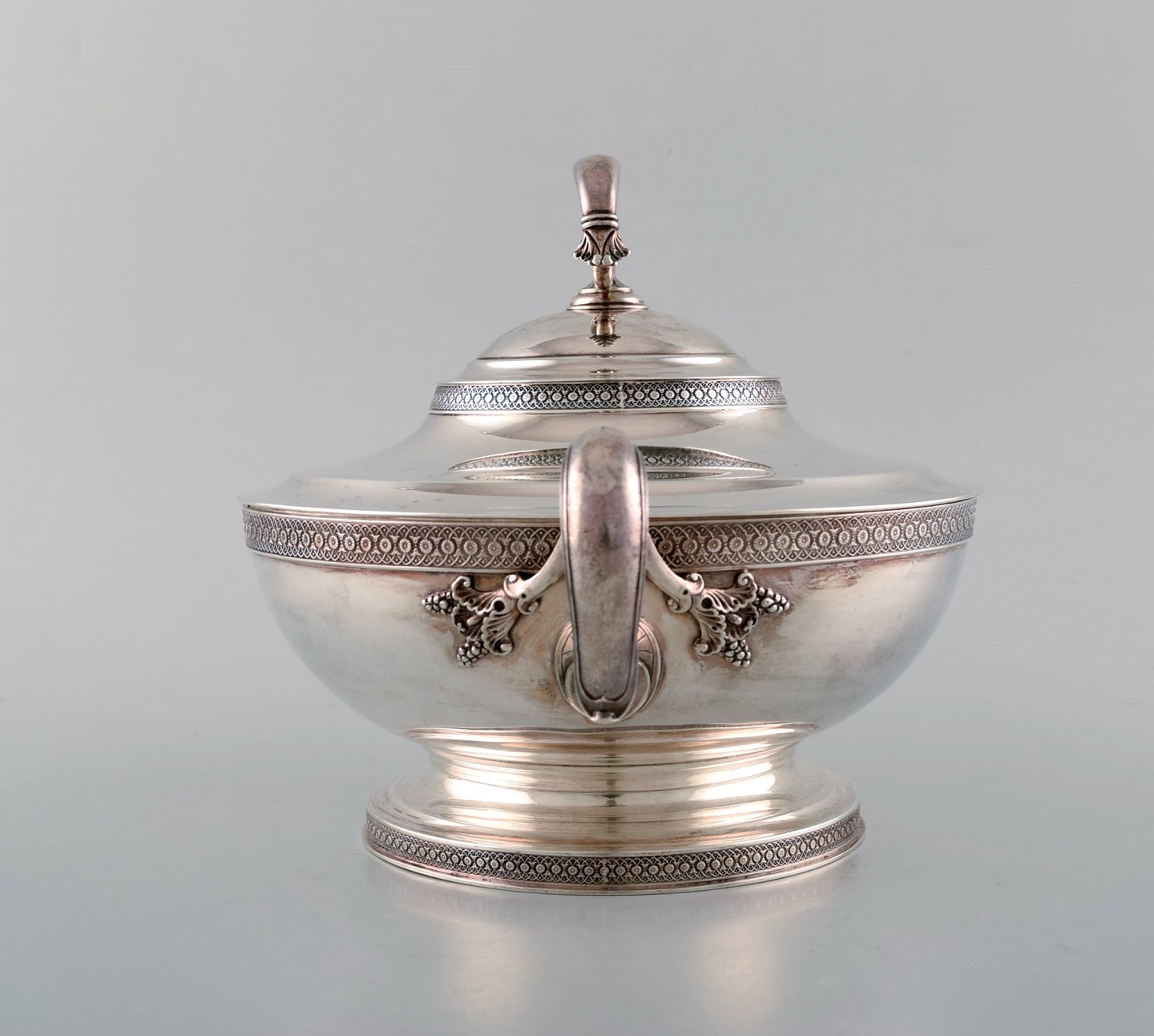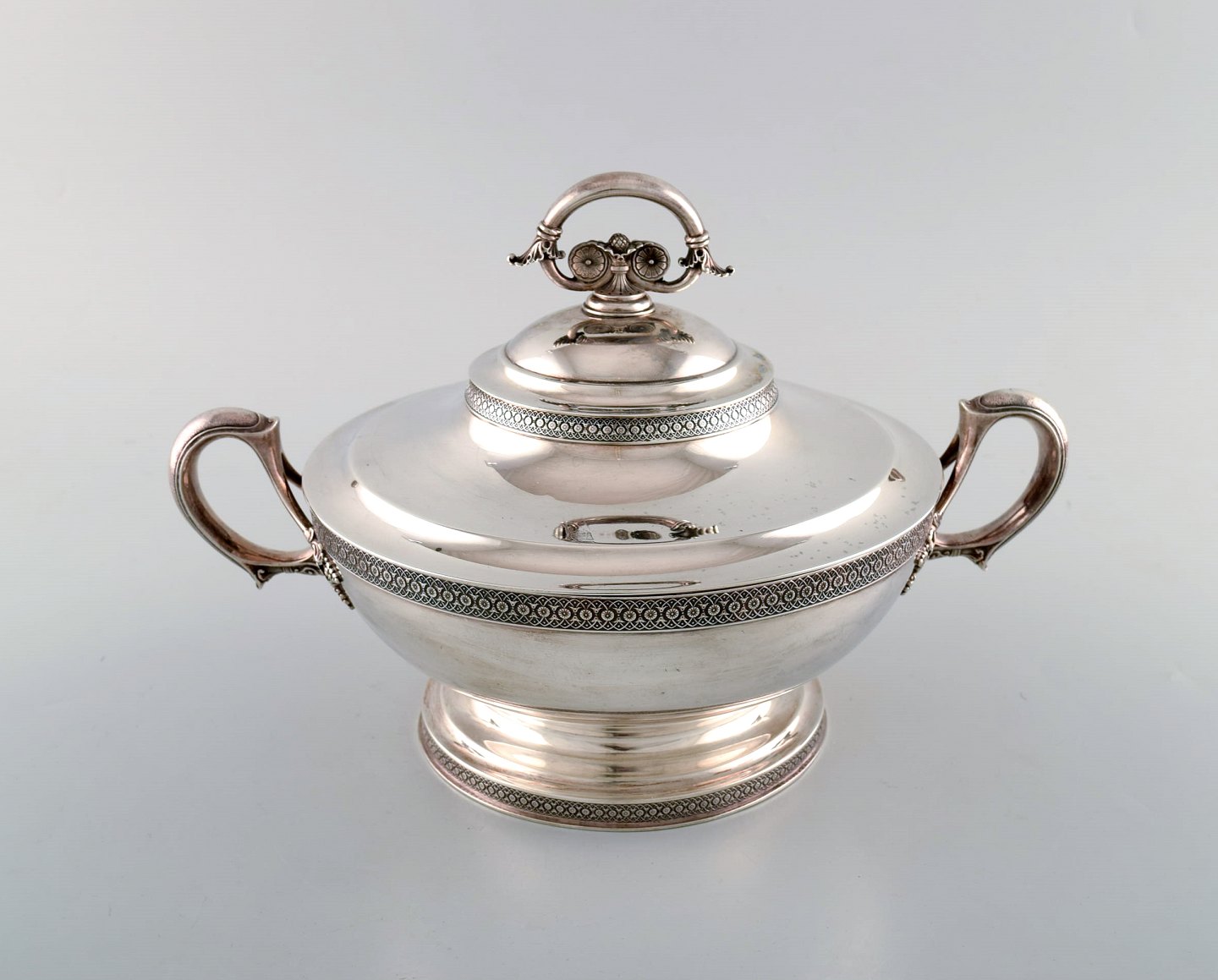 Tiffany & Company (New York). Stylish sterling silver tureen with stylized ornament. Curved and oval bowl on raised oval foot. Raised ornamental bands of ovals and flowers on reeded ground.