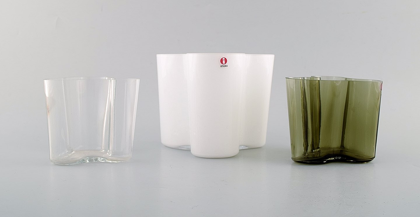 Alvar Aalto for Iittala. Tre vaser i grønt, hvidt og klart kunstglas. Høj kvalitet, sent 1900-tallet. Største måler: 14 x 12 cm. Stemplet. I flot stand.
