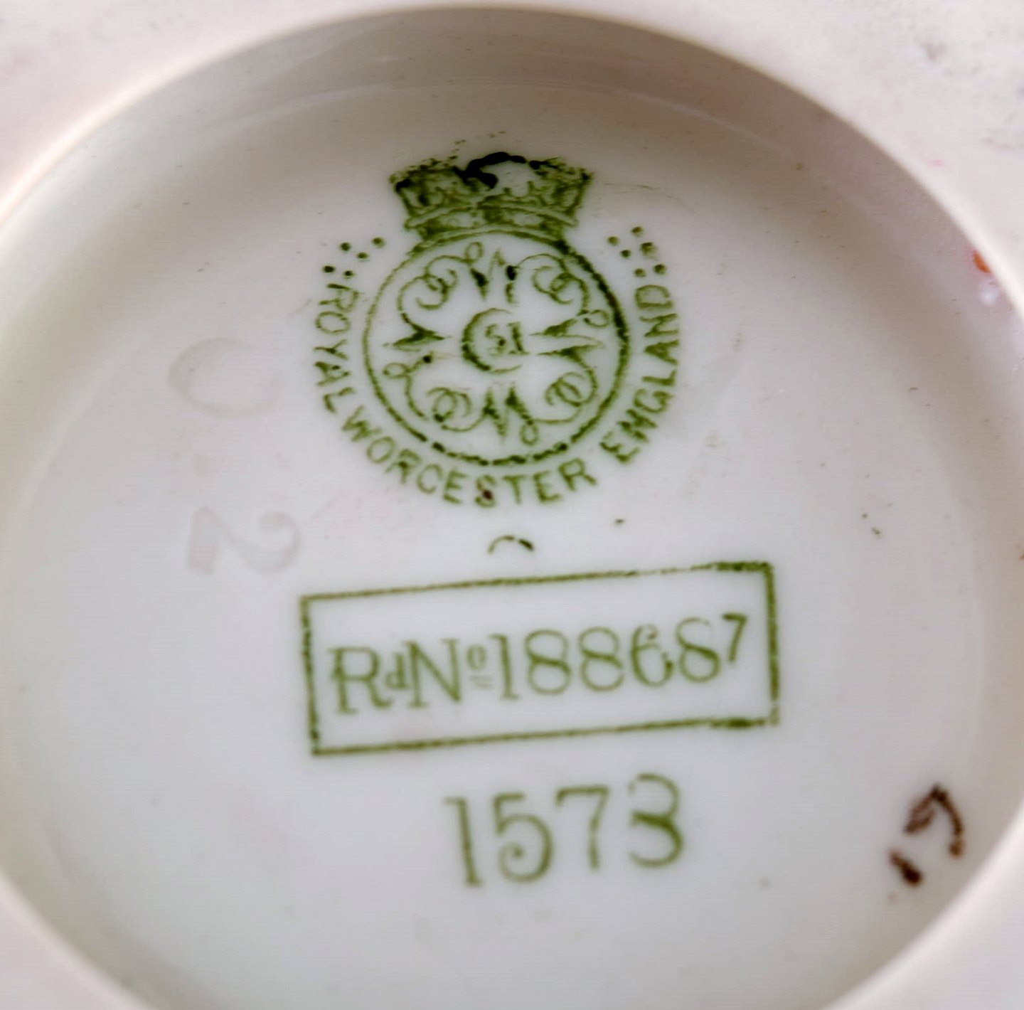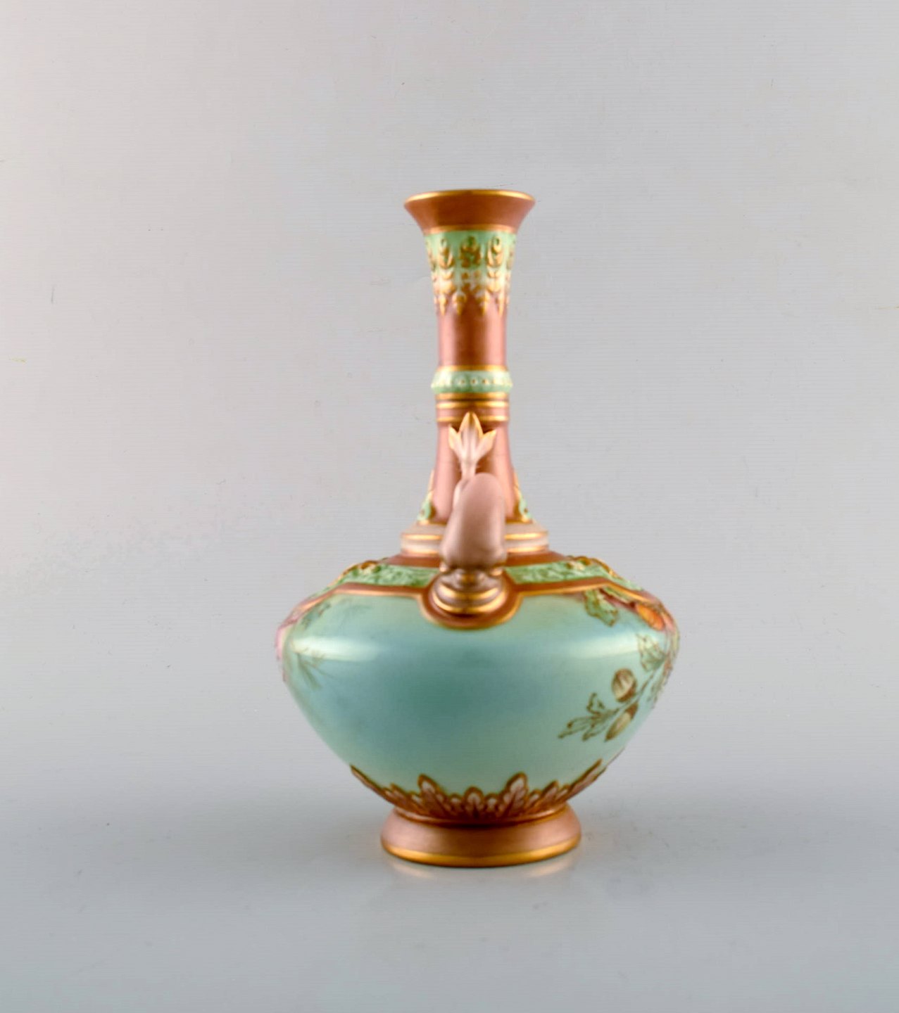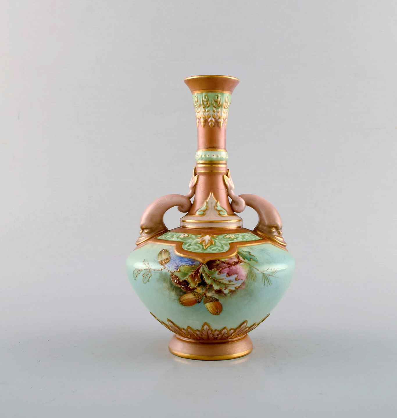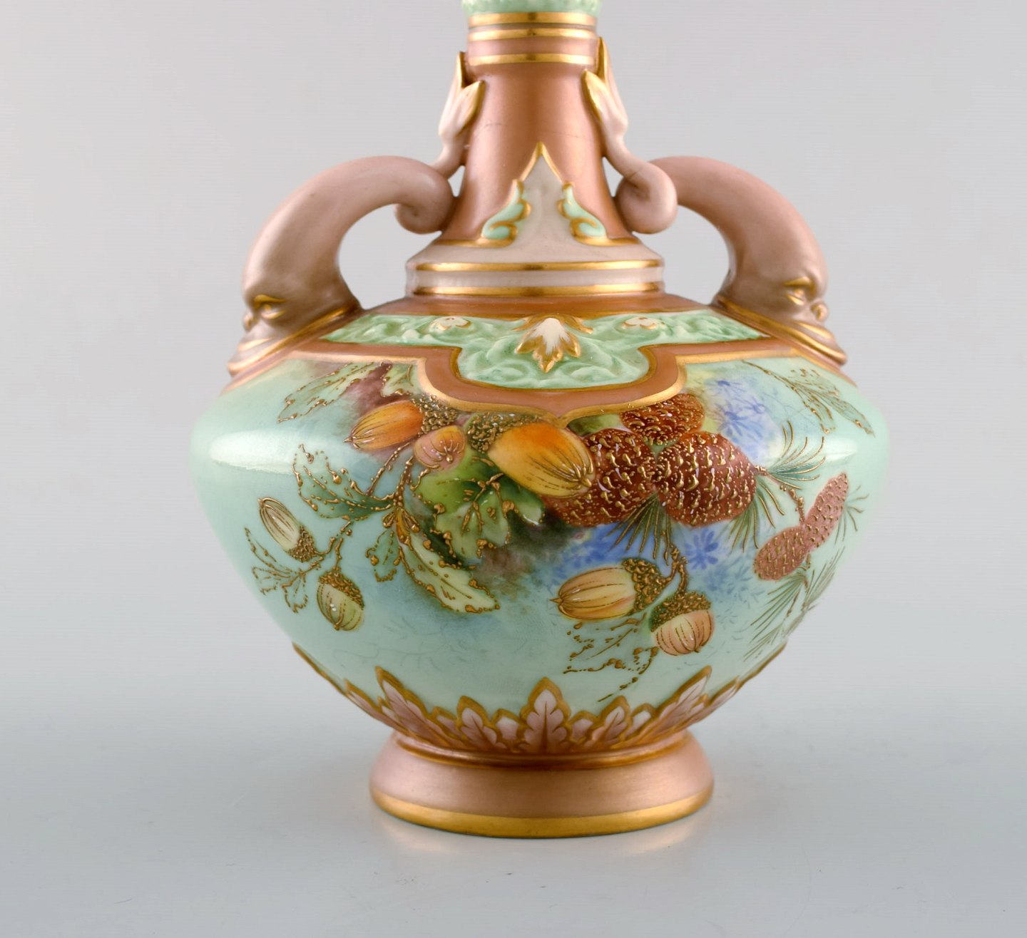 Royal Worchester art nouveau vase. Håndmalet dekoration med delfiner og valnødder. 1920'erne. Modenummer: 1573 I flot stand. Måler: 19,5 x 12,5 cm.