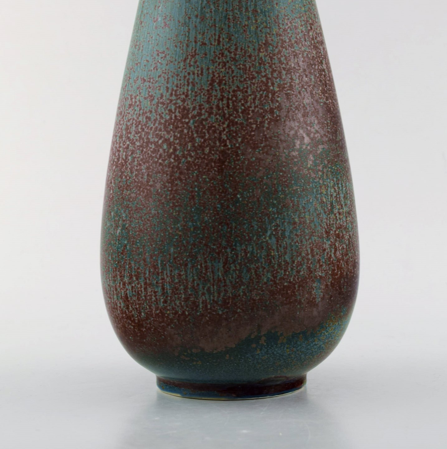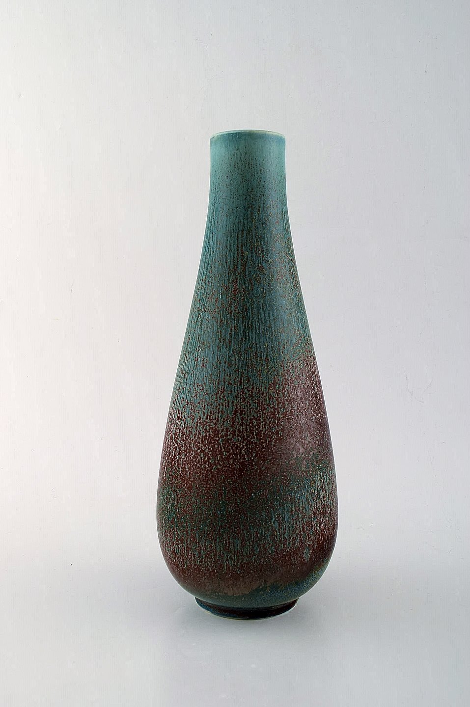 Gunnar Nylund for Rörstrand/Rørstrand. Stor stentøjsvase. 1950'erne. Måler: 28,5 x 12 cm. I perfekt stand. Flot glasur i lilla og blå grønne nuancer. 2. sortering. Stemplet.