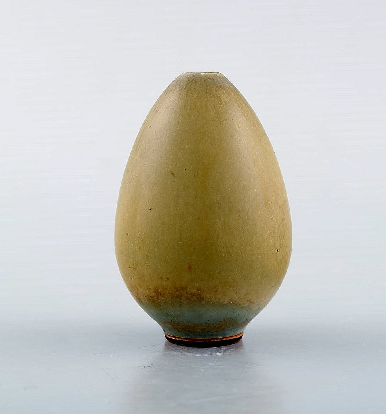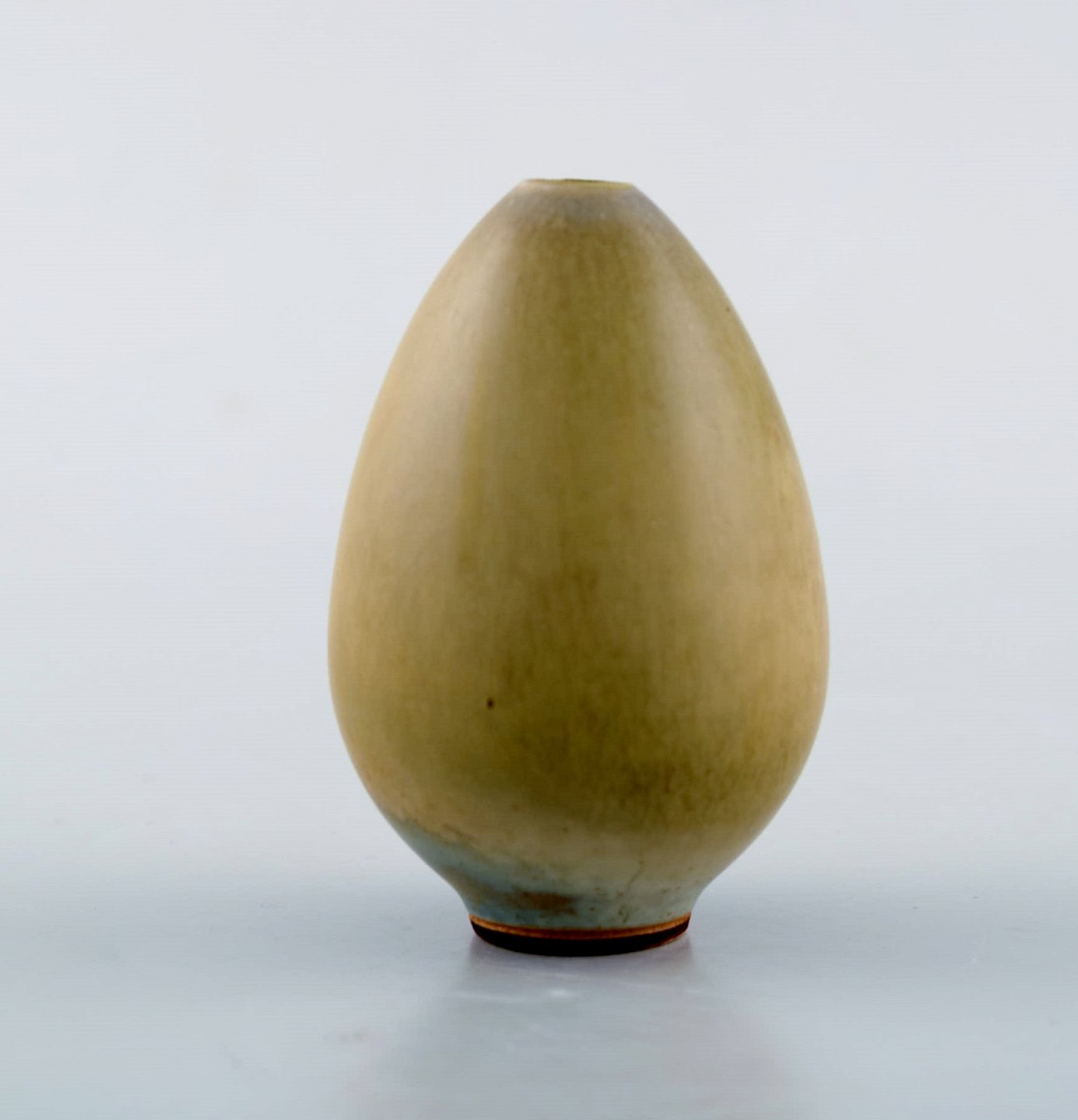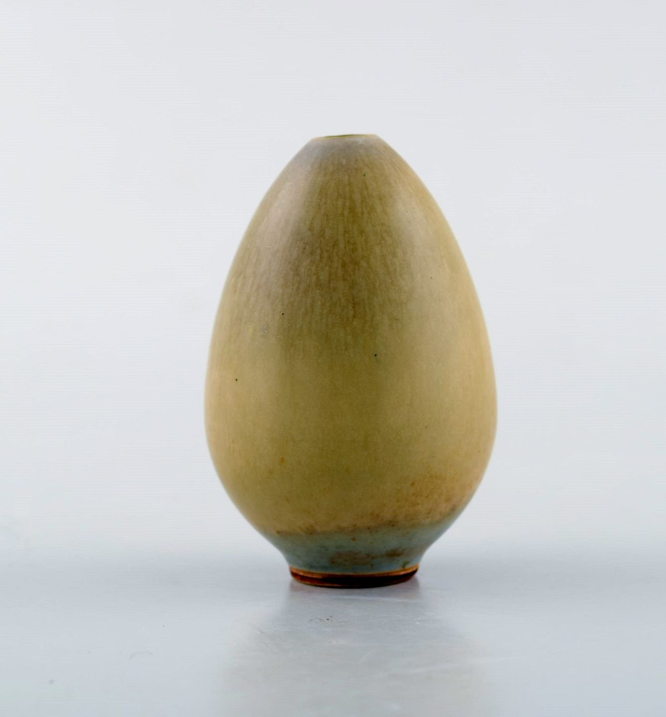 Berndt Friberg (1899-1981), Gustavsberg Studio Hand. 1950/60 s. Rare pottery vase, egg shaped, beautiful glaze in green and yellow shades. Stamped. Measures: 7 x 4,5 cm. In perfect condition.