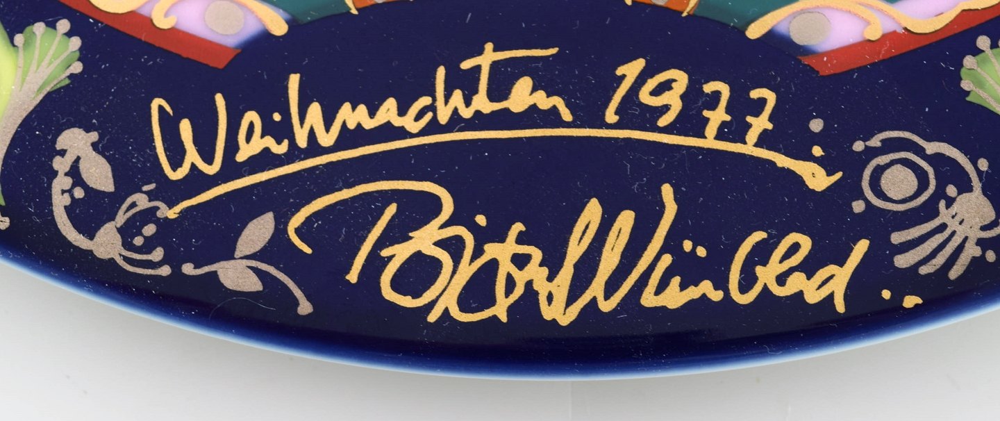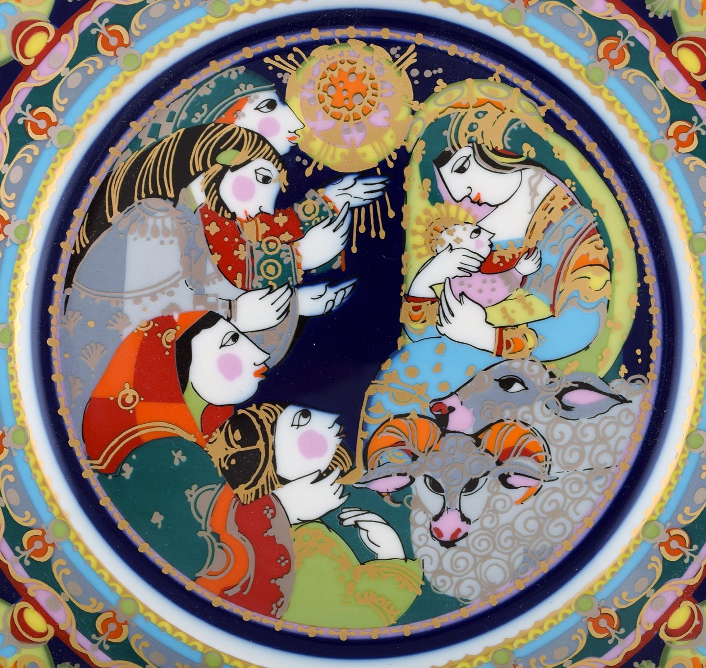 Rare hand-painted Rosenthal Bjørn Wiinblad Christmas plate from 1977. "Adoration of the Shepherds". Stamped. 29 cm. in diameter. In perfect condition.