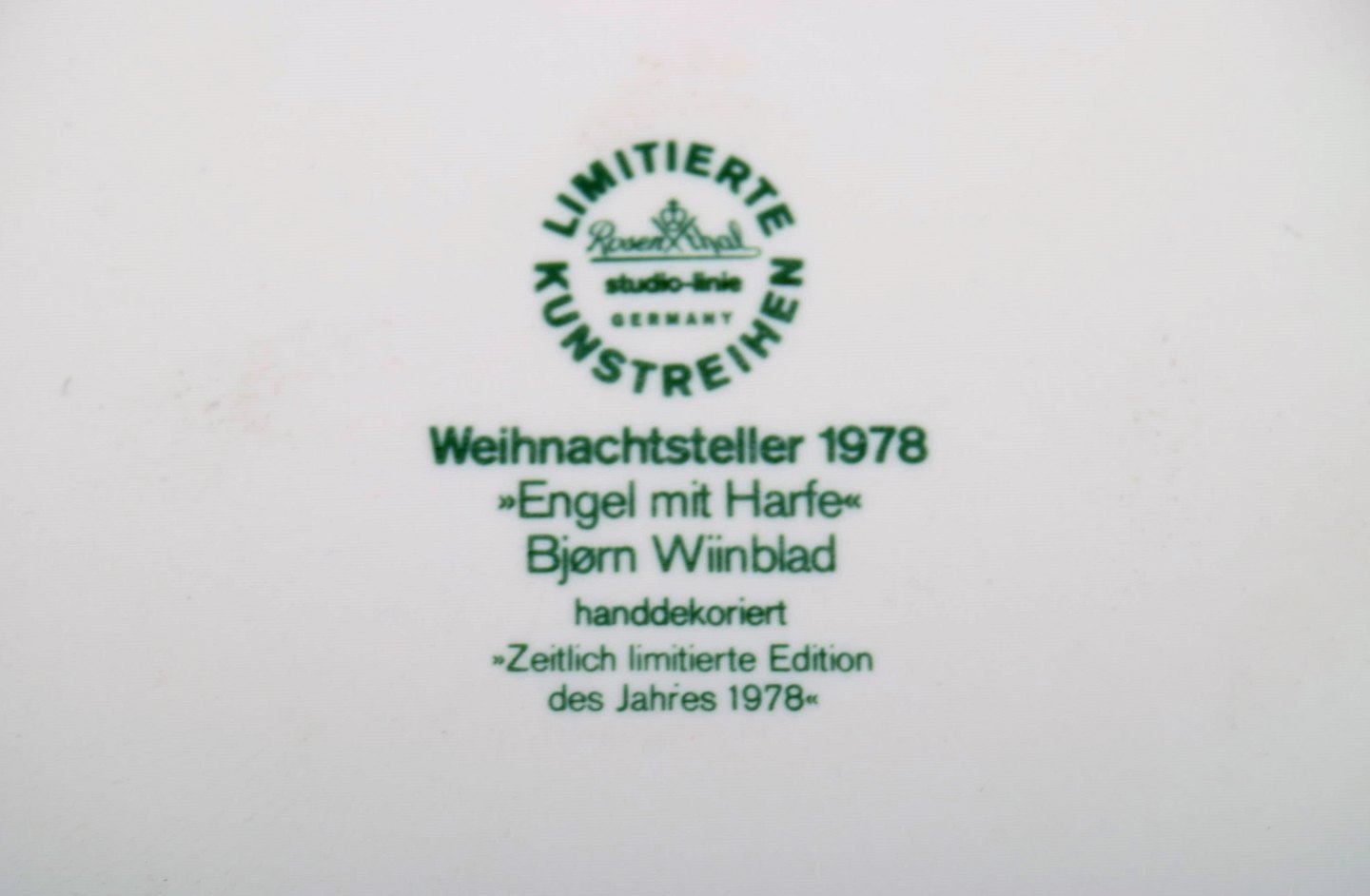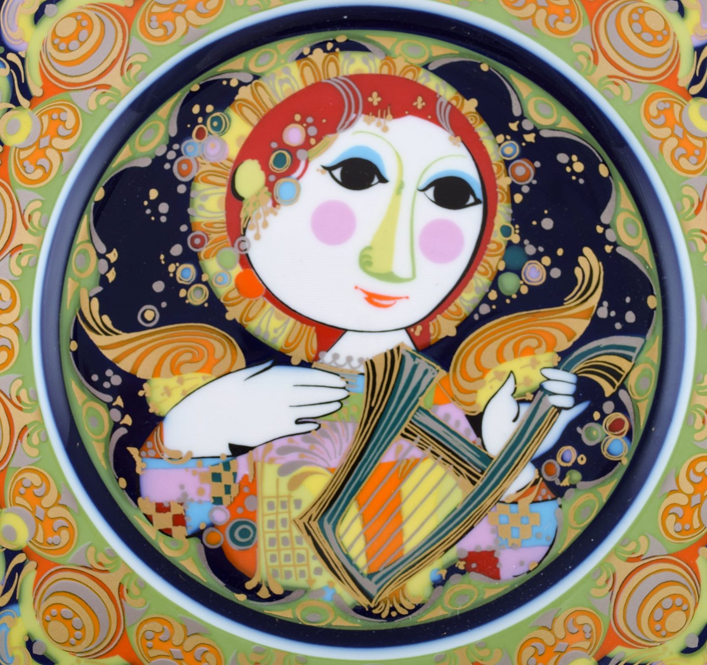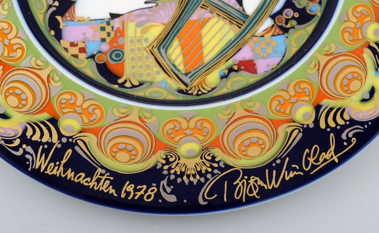 Sjælden håndmalet Rosenthal Bjørn Wiinblad juleplatte fra 1978. "Engel med harpe". Stemplet. 29 cm. i diameter. I perfekt stand.