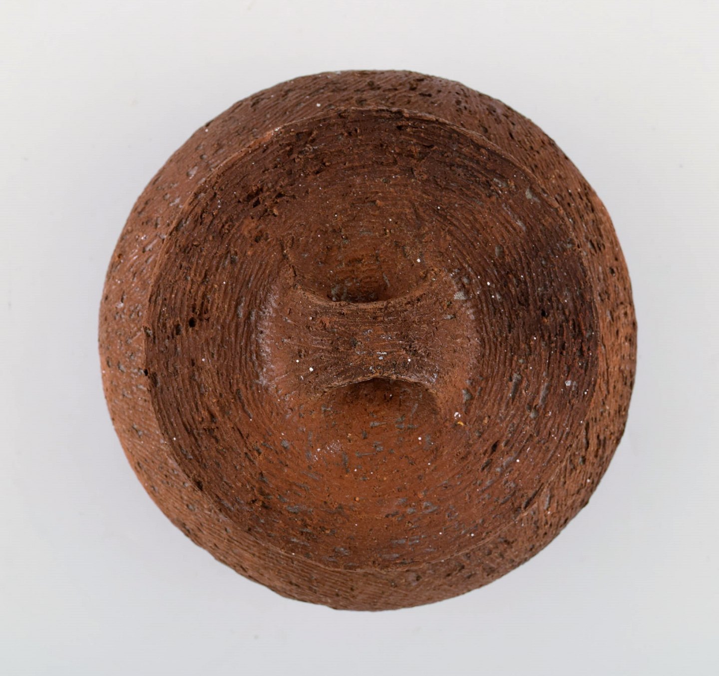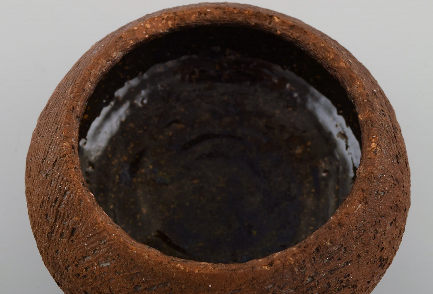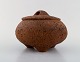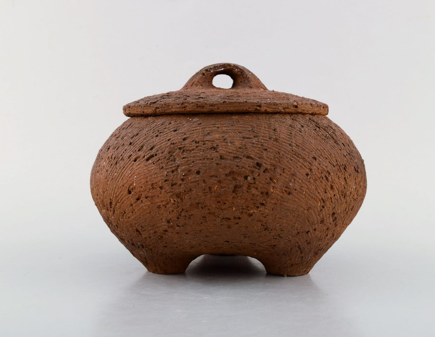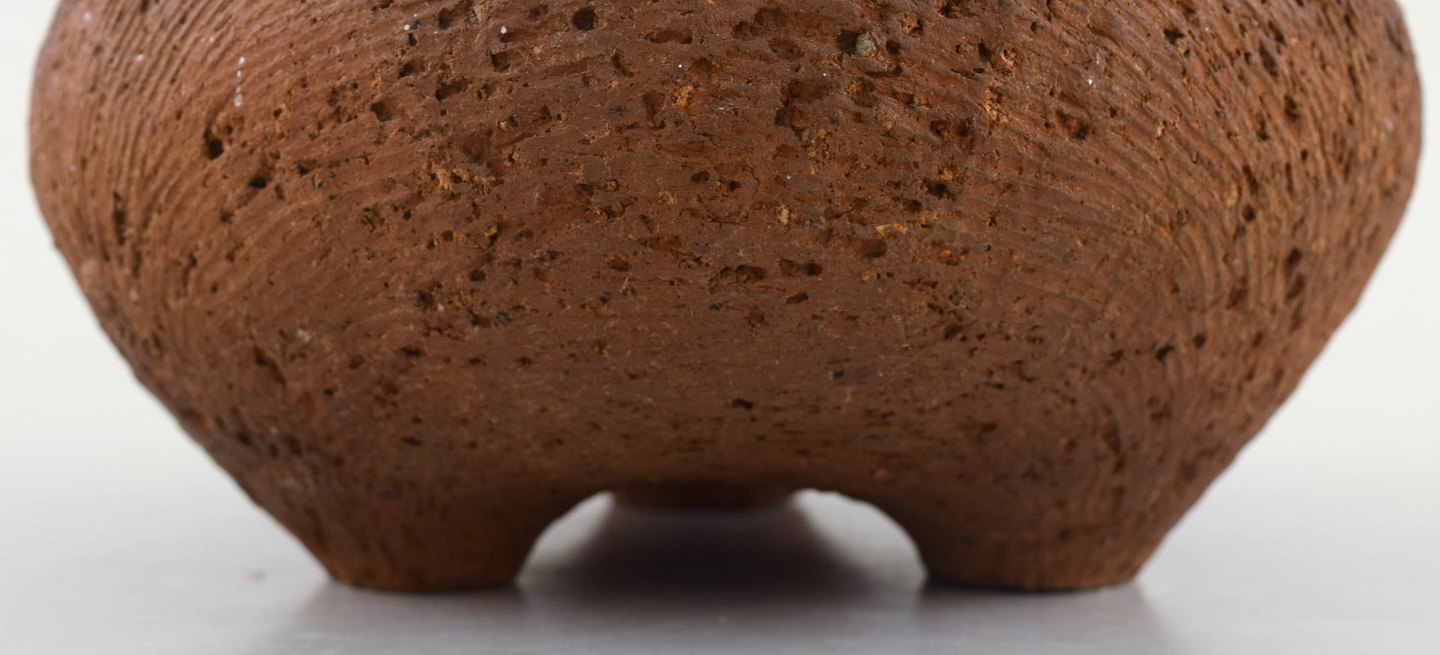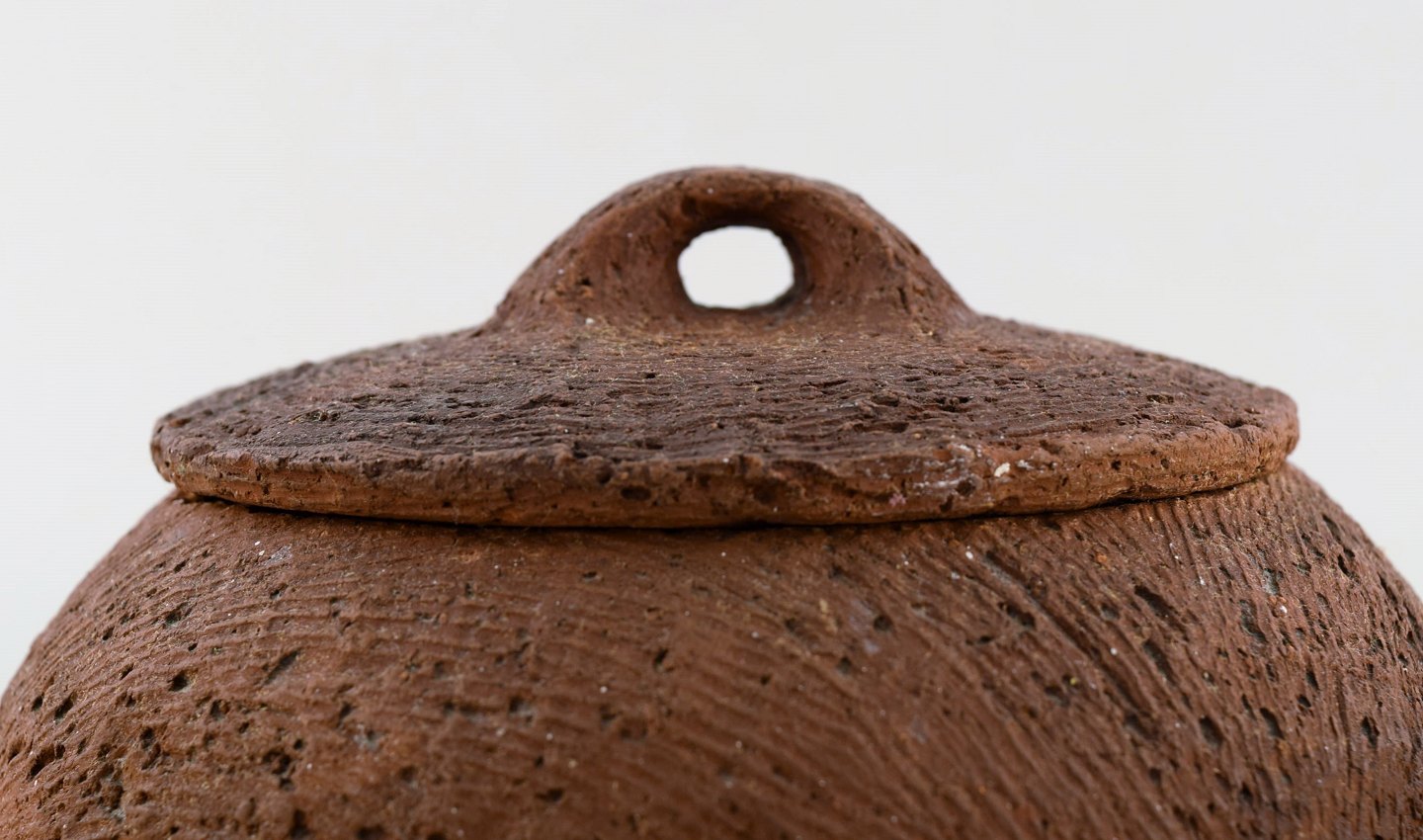Gutte Eriksen: f. Rødby 1918, d. 2008. Stor unika lågkrukke på fødder i stentøj. Rakubrændt teknik. 1960'erne. Måler : 20 x 13,5 cm. Signeret. I flot stand.