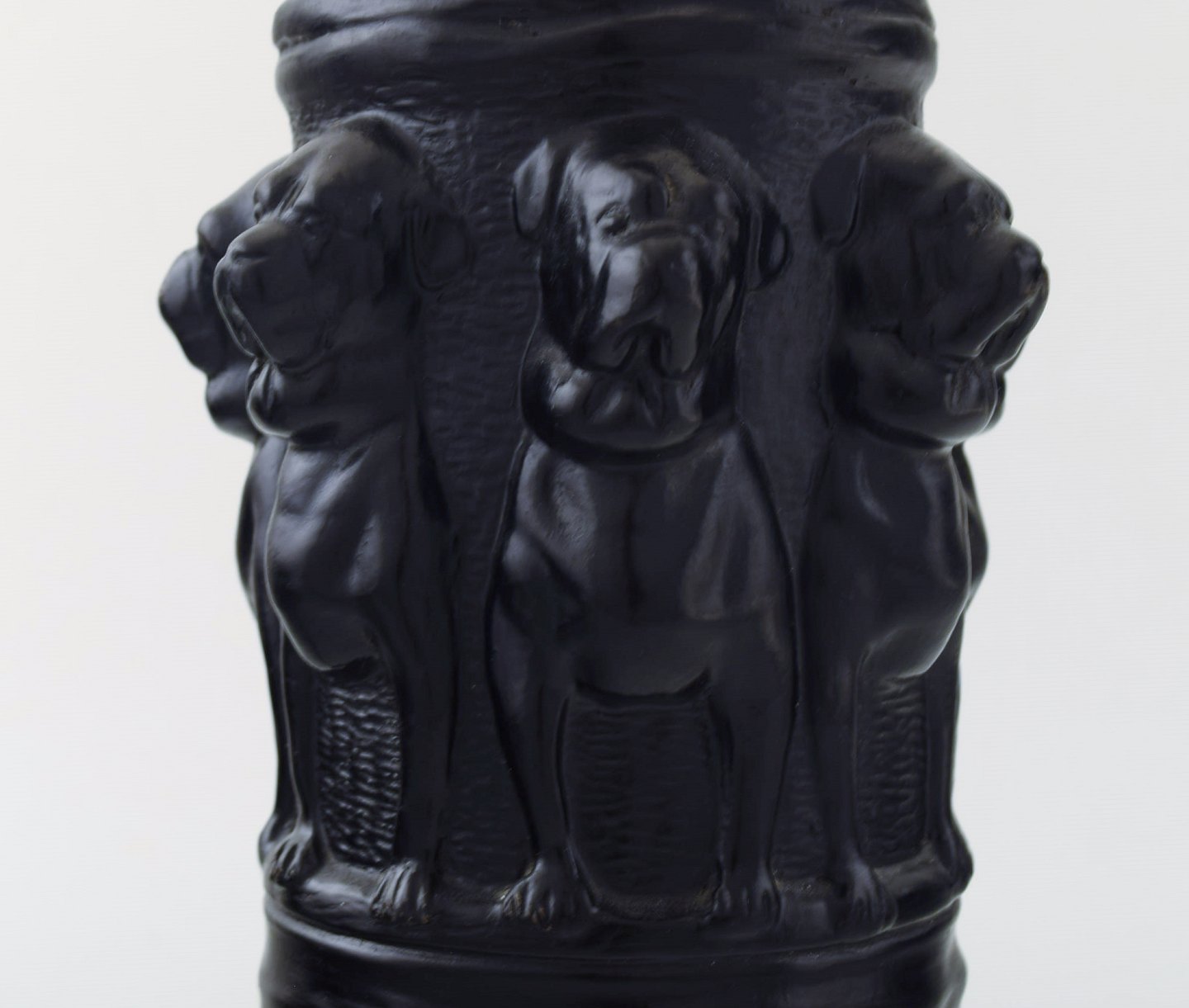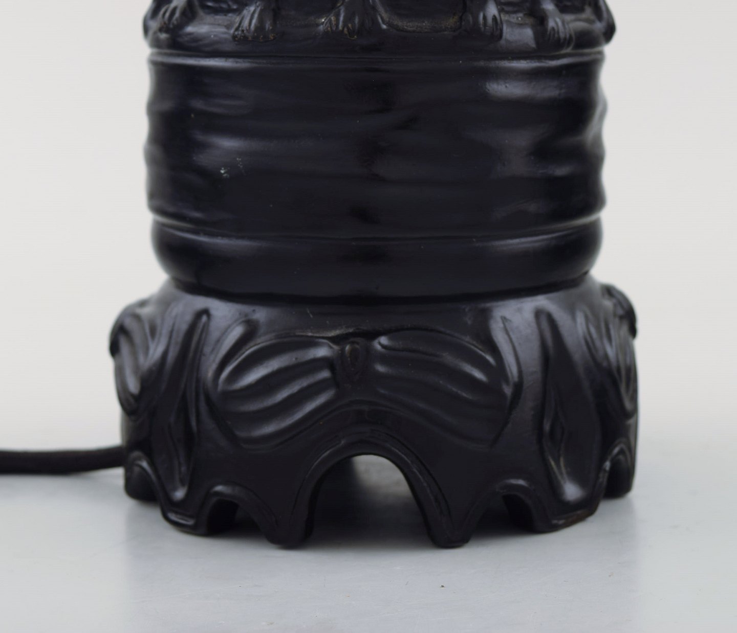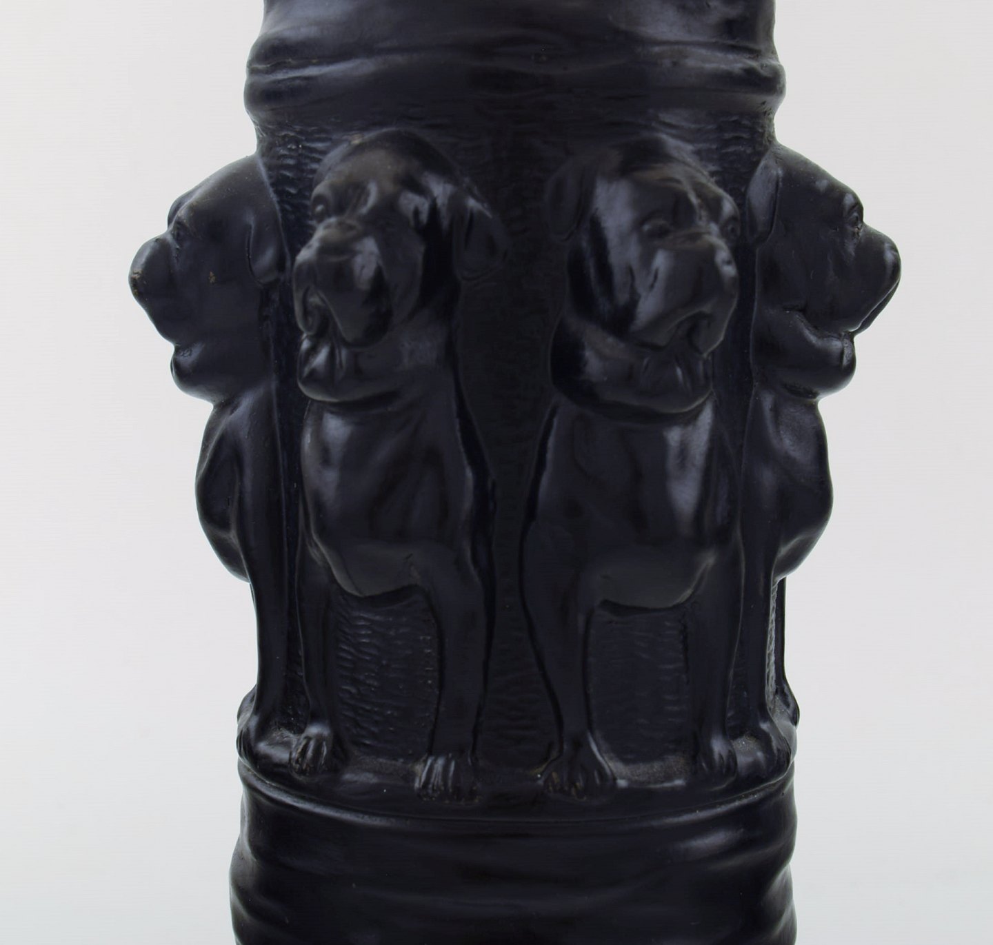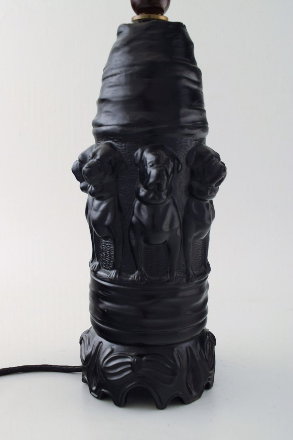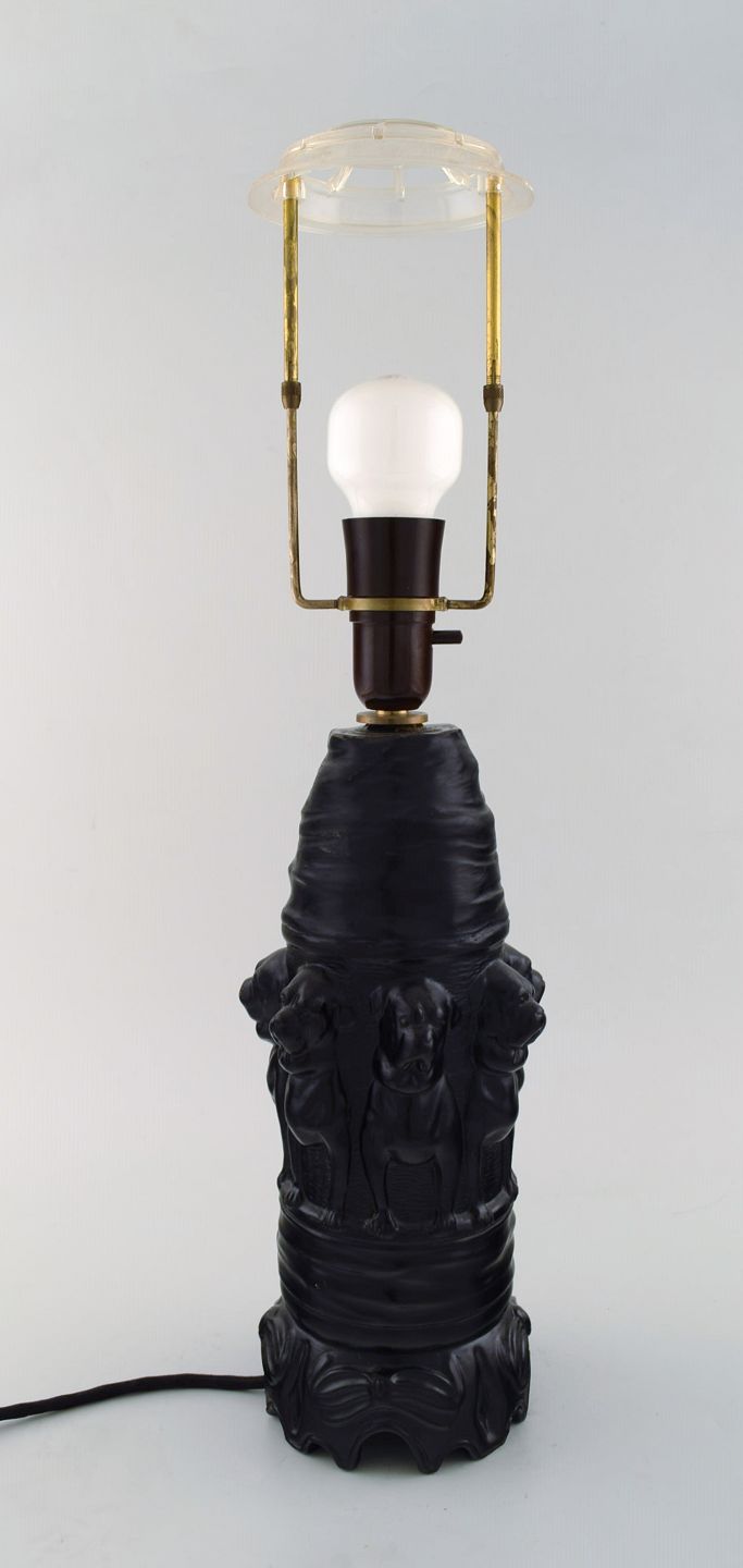 Edvard Frederik Sonnes Terrakottafabrik. Rønne, Bornholm. Ca. 1900. Skønvirke bordlampe af sortbrændt terrakotta udsmykket med hunde. I flot stand. Stemplet. Dessin nummer 1148. Måler: 30 x 15,5 cm.