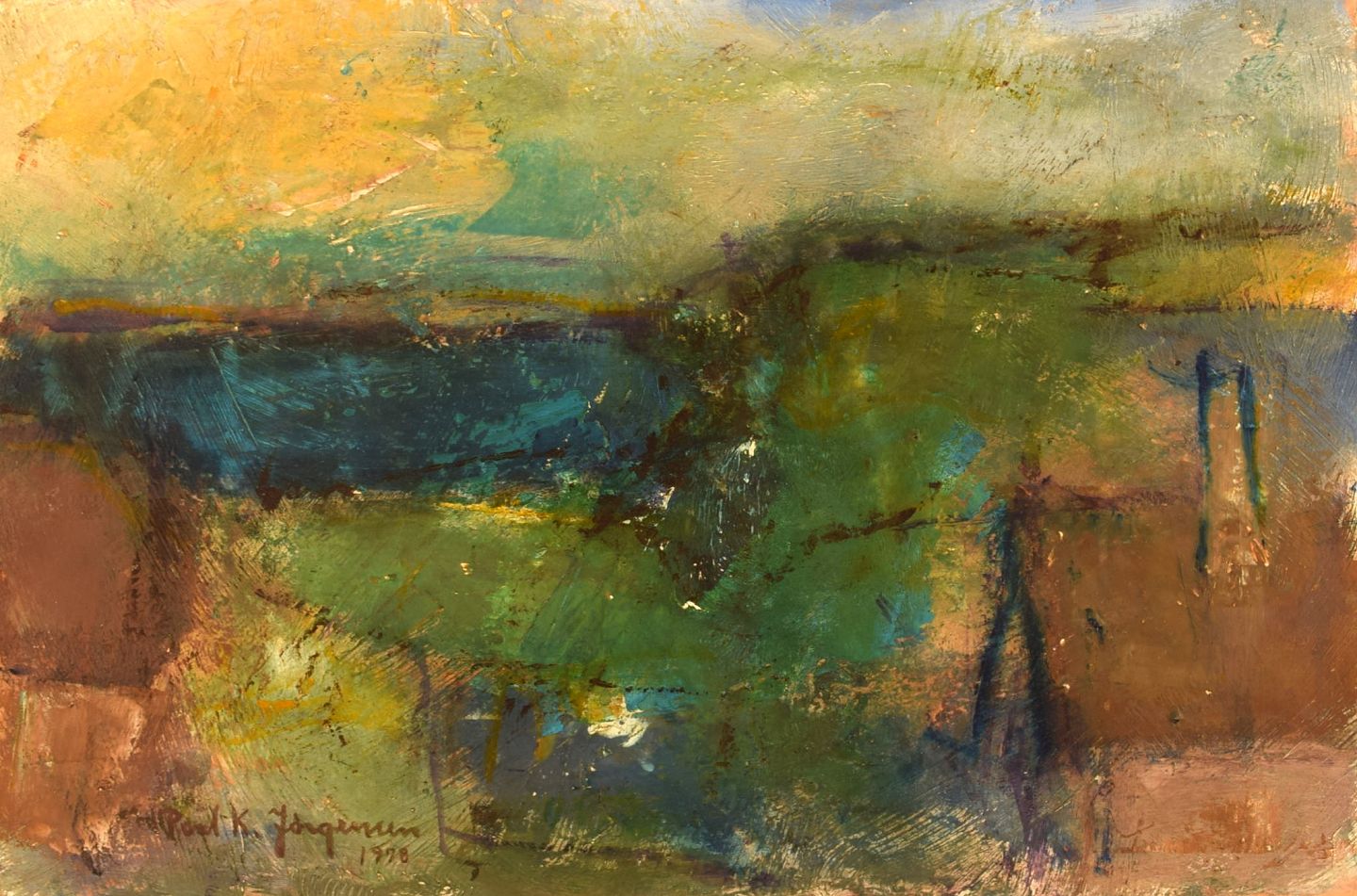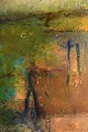 POUL K. JÖRGENSEN. Svensk kunstner. Olie på plade. Modernistisk landskab med hus i forgrunden. Dateret 1978. Signeret. I flot stand. Måler: 45 x 30 cm.