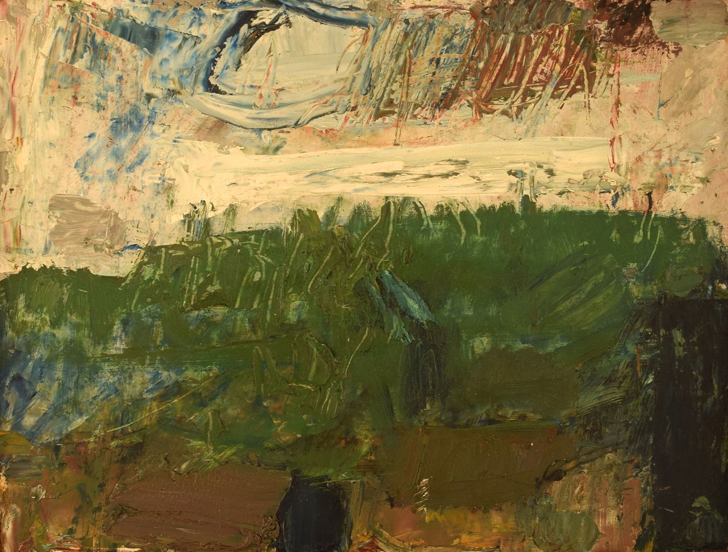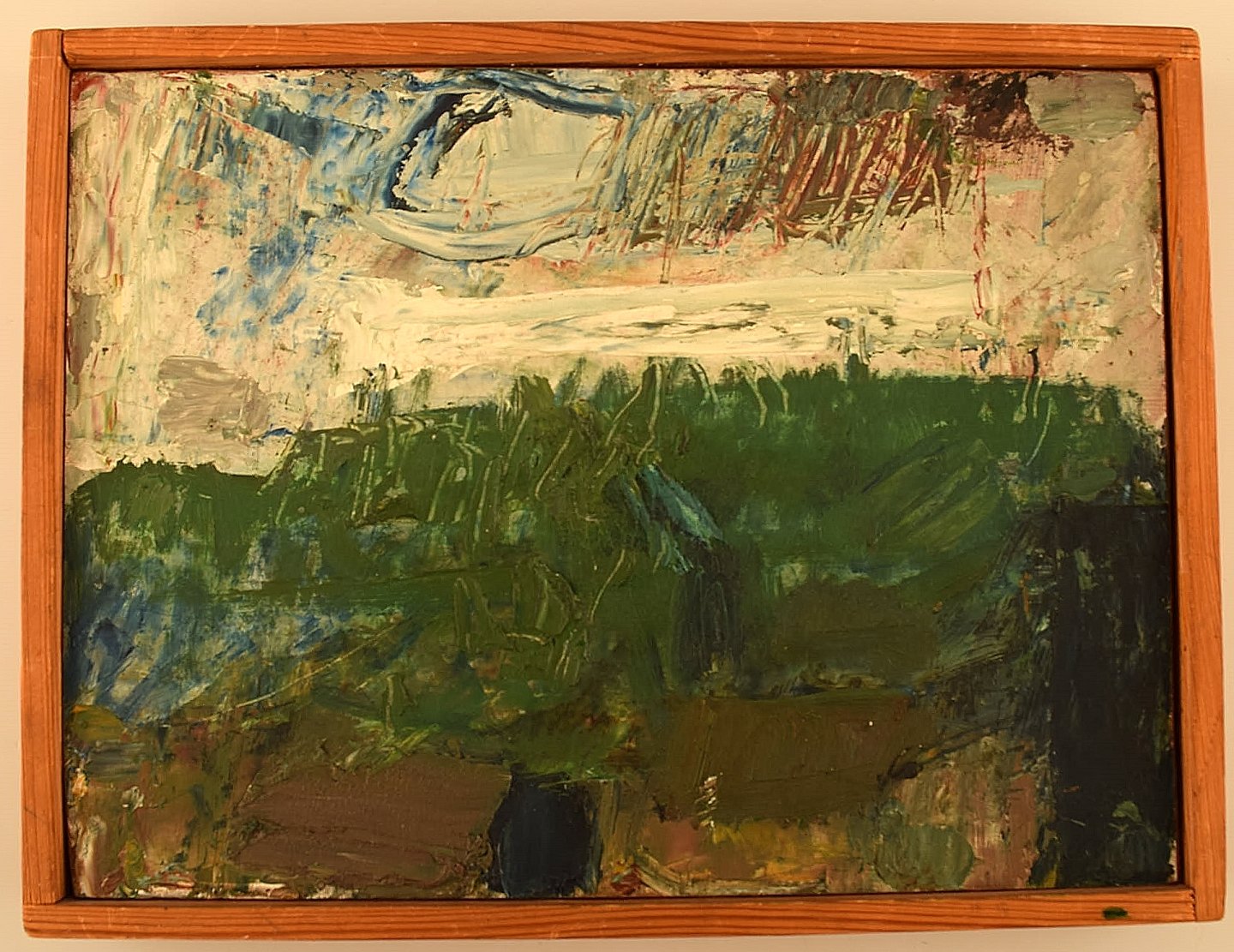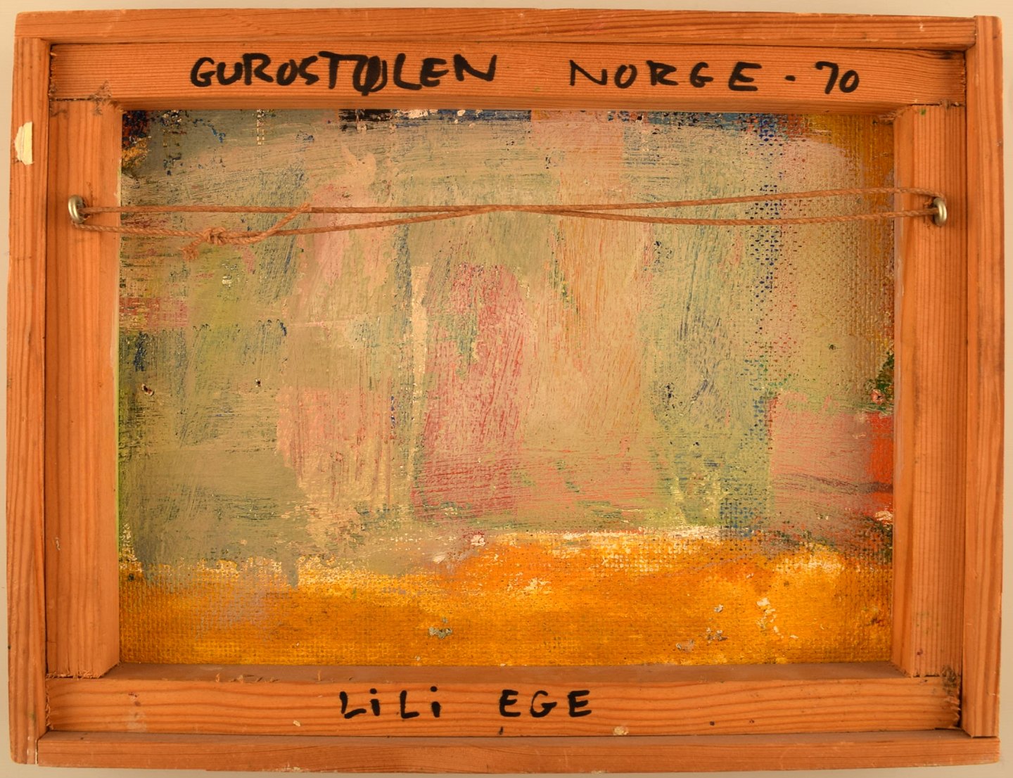 Lili Ege (1913-2004). Dansk kunstmaler. Olie på plade. "Gurostølen" Modernistisk landskab. Dateret 1970. Signeret. I flot stand. Pladen måler: 27 x 20 cm. Rammen måler: 1 cm.