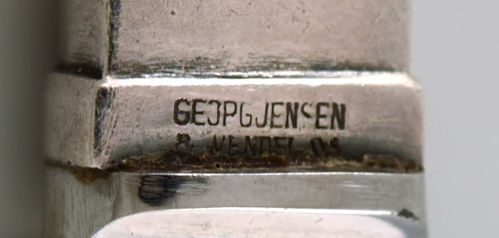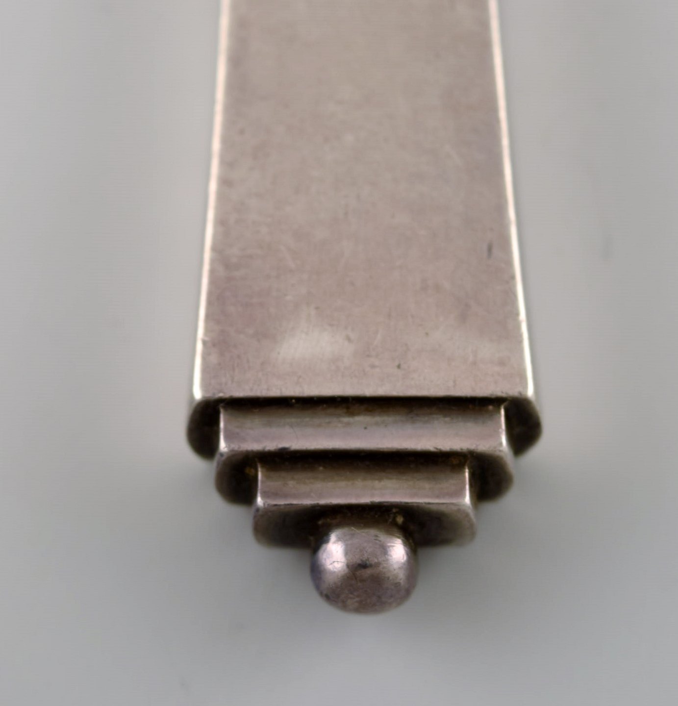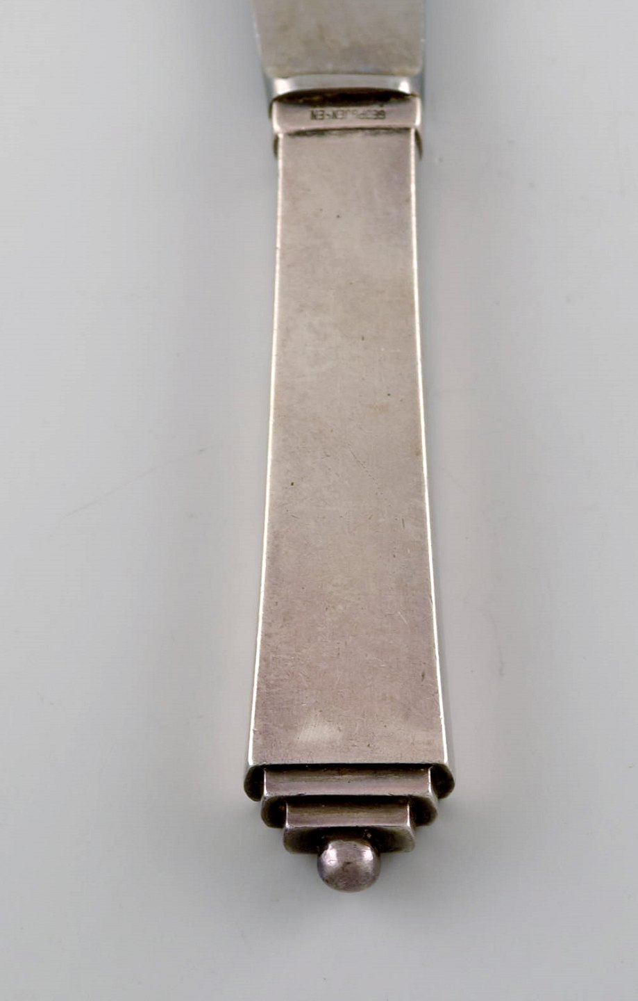 Georg Jensen "Pyramide" frokostkniv. Dateret 1945-51. Designet af Harald Nielsen 1933-44. I flot stand. Måler: 20 cm. Tidligt stempel: 1945-51.