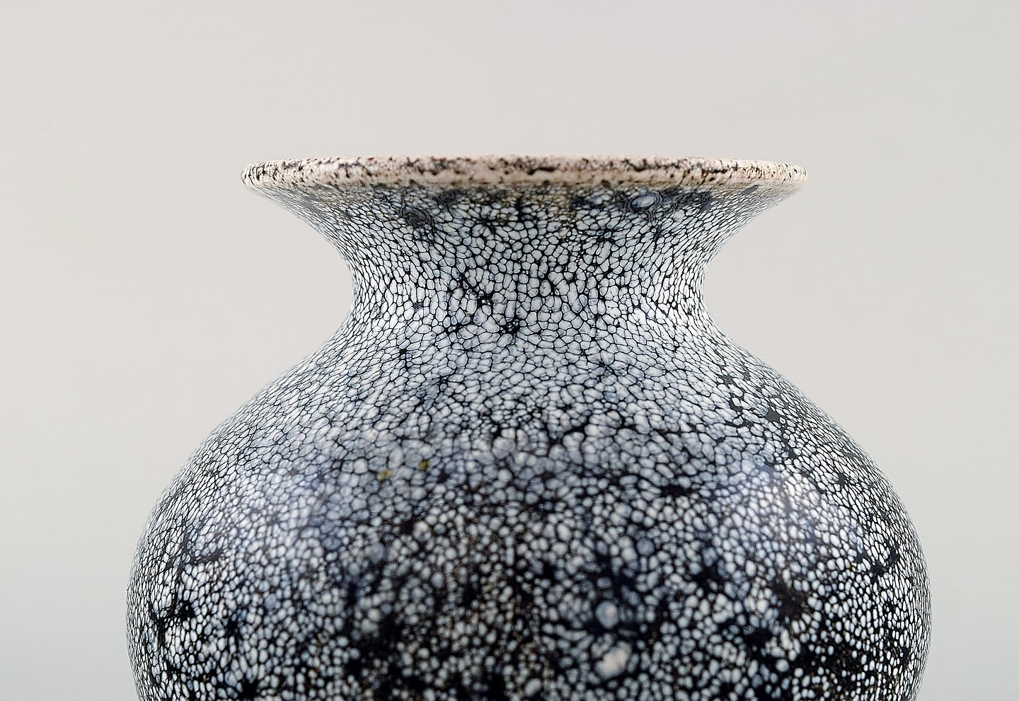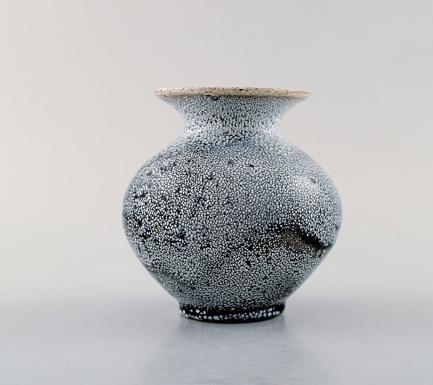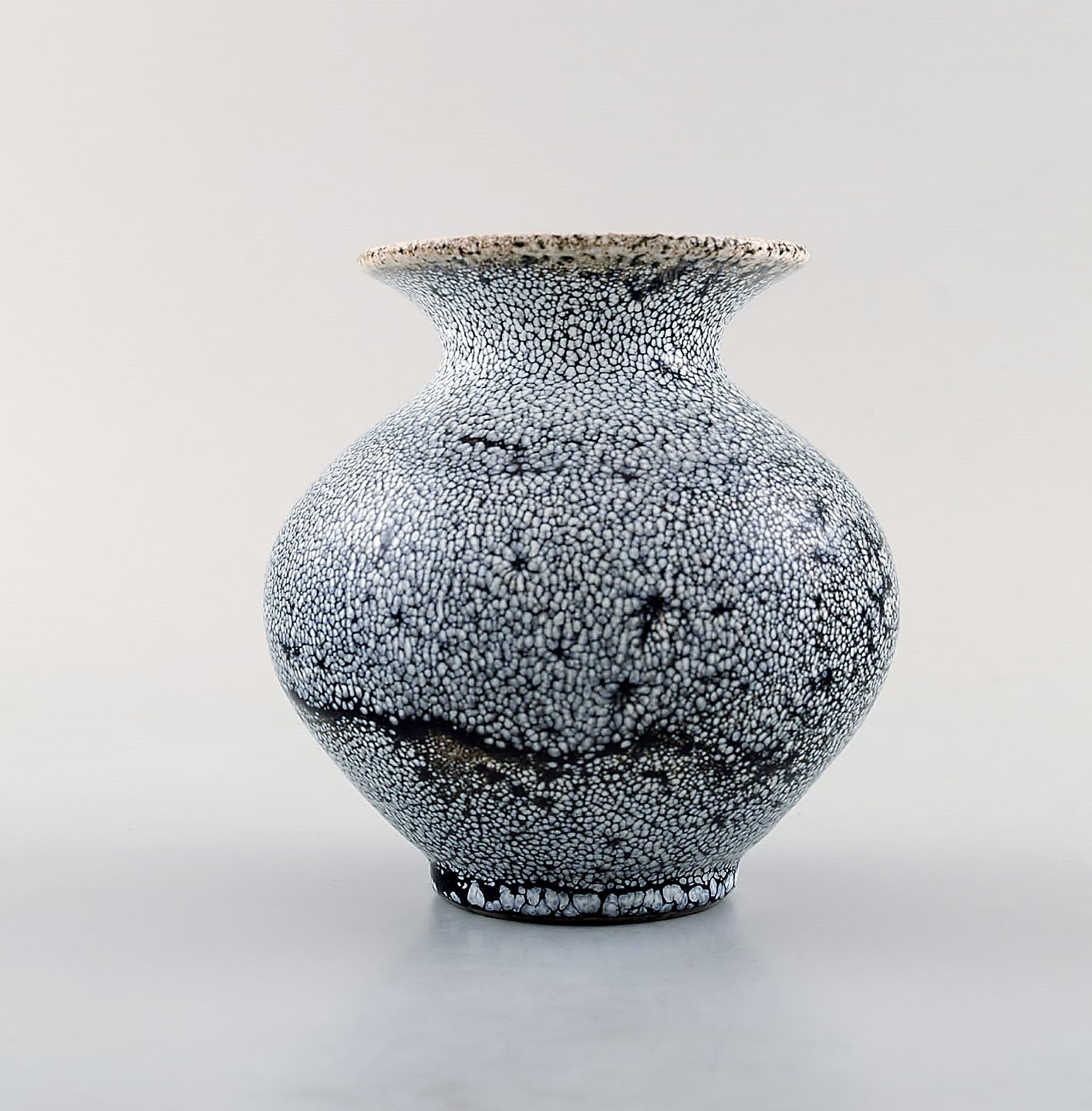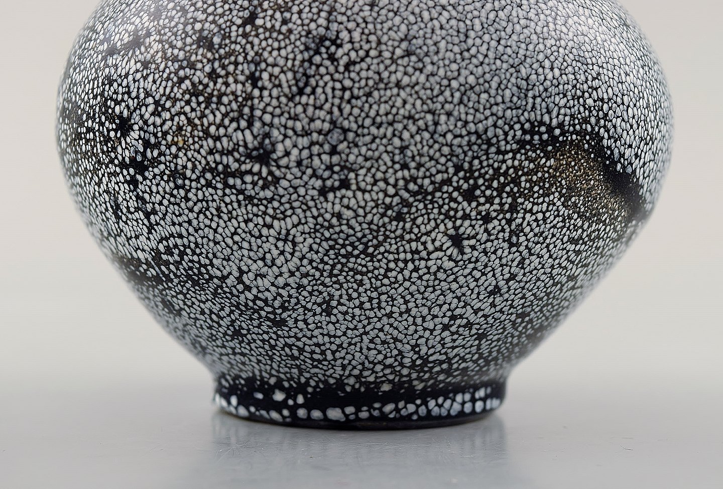 Svend Hammershøi for Kähler, HAK. Vase i glaseret stentøj. Smuk gråsort dobbeltglasur. Sjælden form. 1930'erne. Måler: 11 x 11 cm. Stemplet. I flot stand.