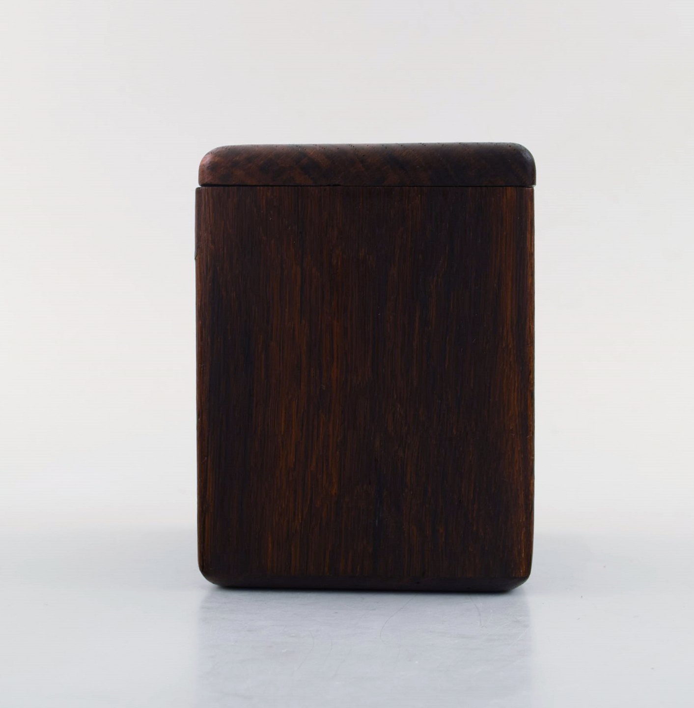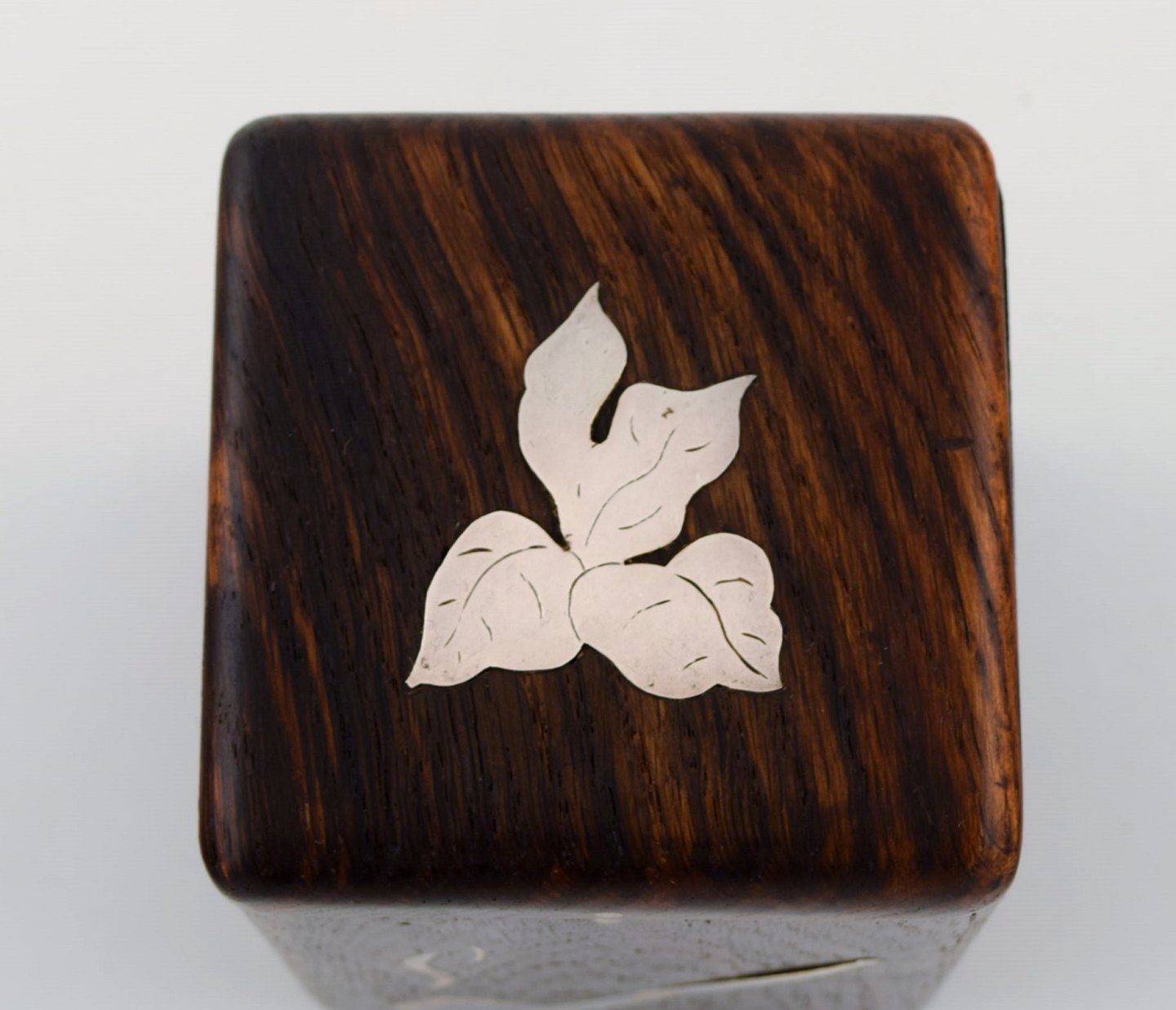 Svend Weihrauch for Franz Hingelberg, Aarhus. Tobakskrukke i palisander med sølvindlæg i form af pibe og tobaksblad. I flot stand. Måler: 12 x 9 cm.