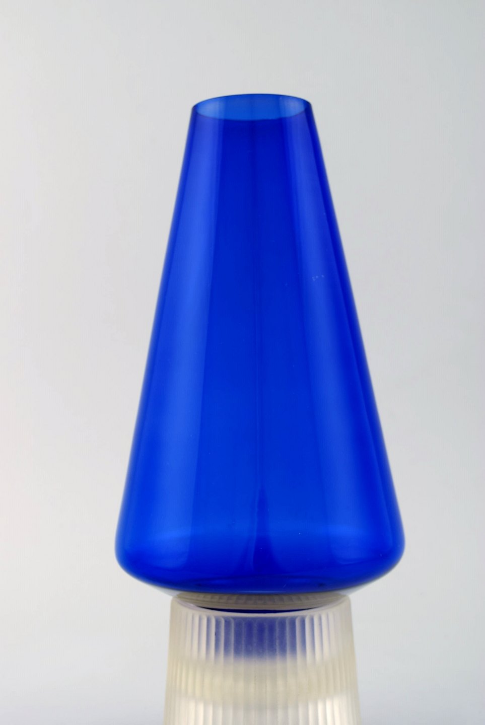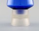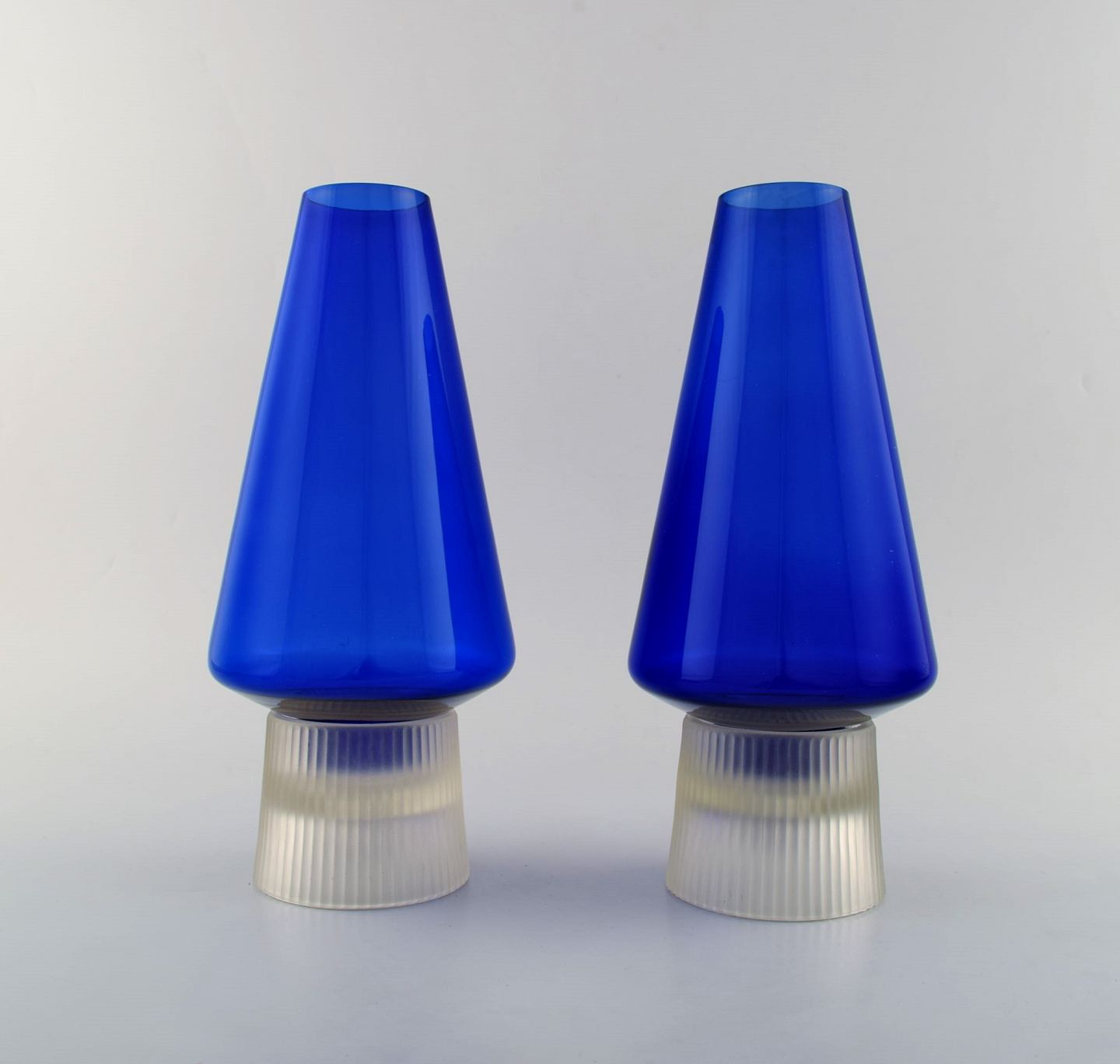 Per Lütken for Holmegaard. Et par sjældne hyggelamper til stearinlys i blåt og klart kunstglas. Designet i 1958. I flot stand. Måler: 26 x 12,5 cm.