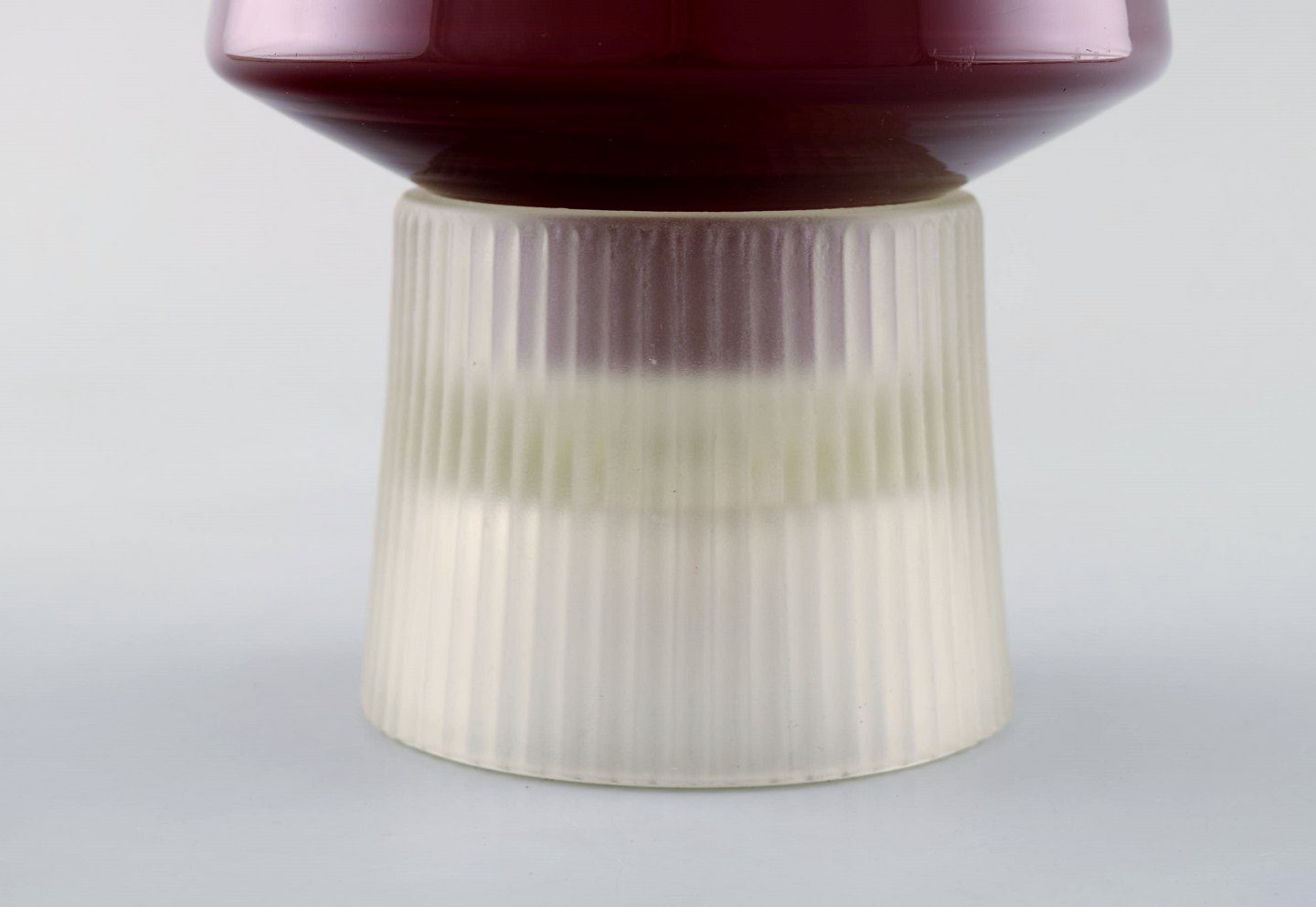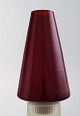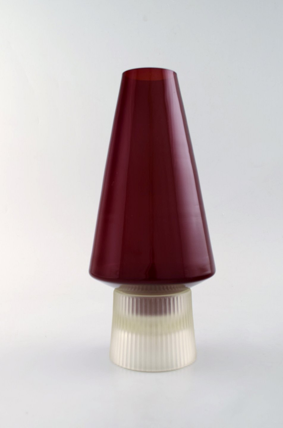Per Lütken for Holmegaard. A pair of rare "Hygge" lamps for candles in red and clear art glass. Designed in 1958. In very good condition. Measures: 26 x 12.5 cm.