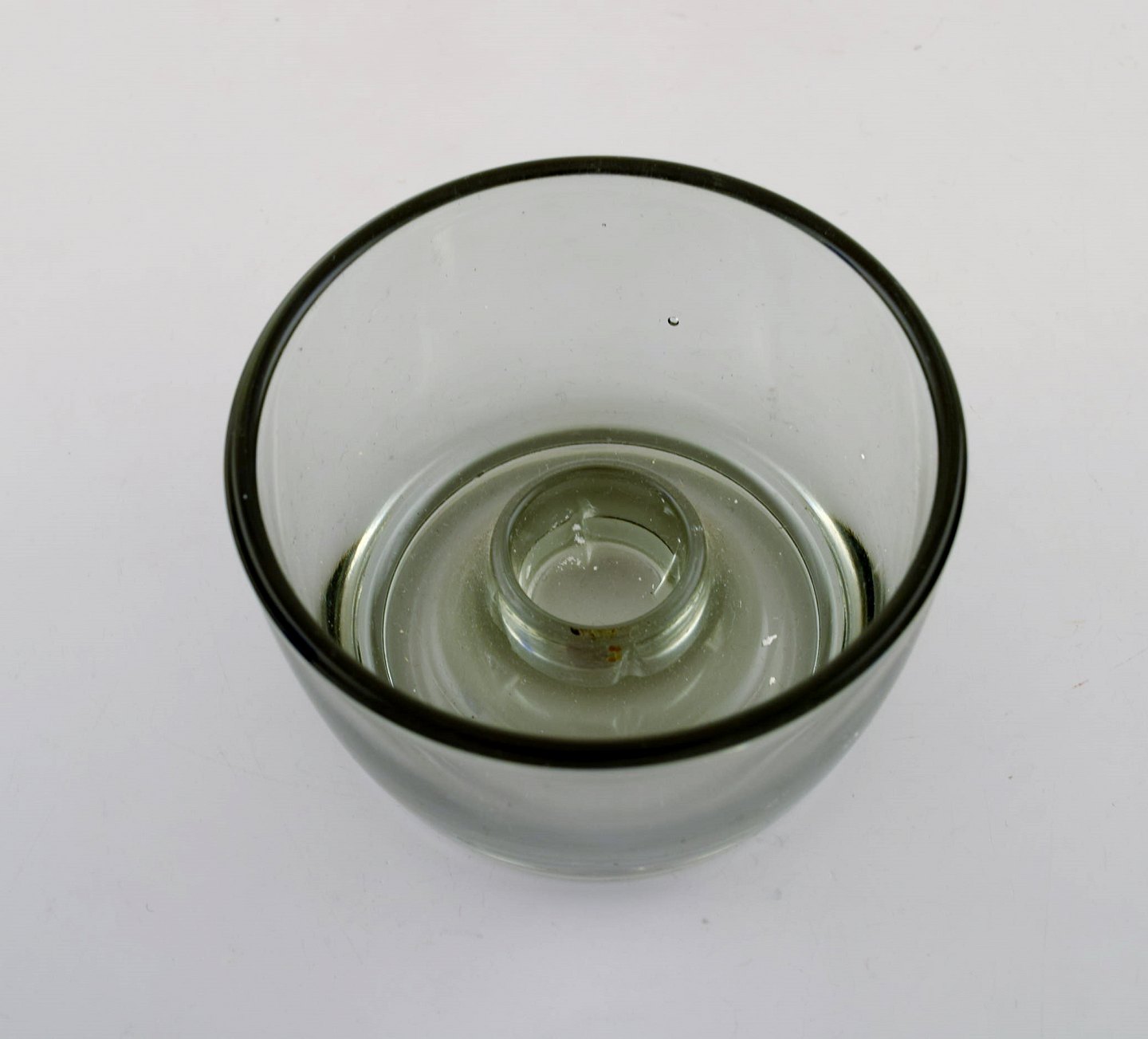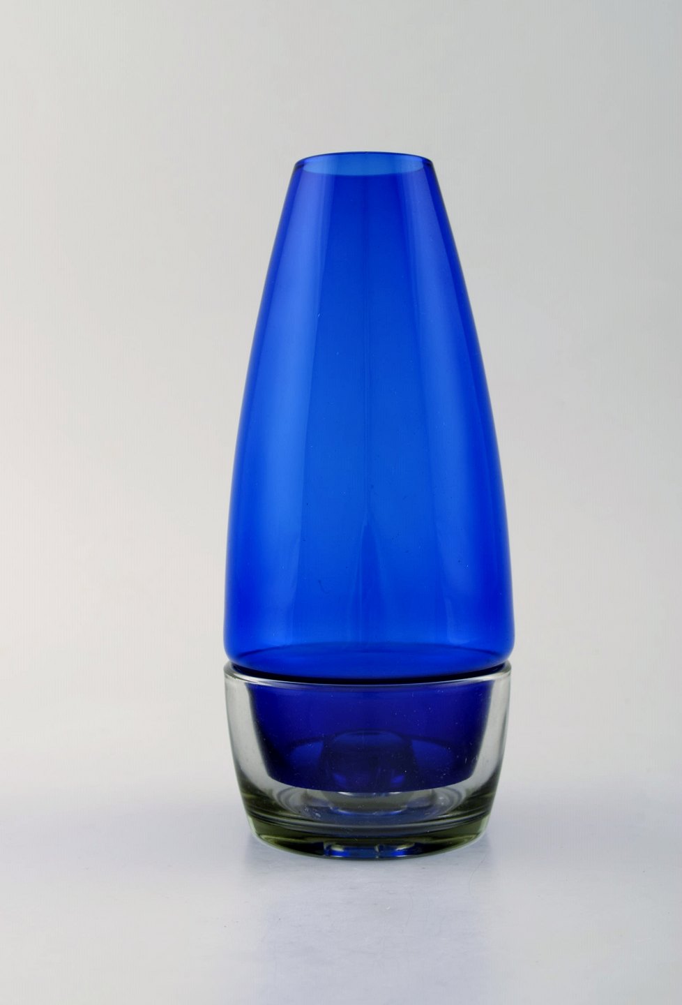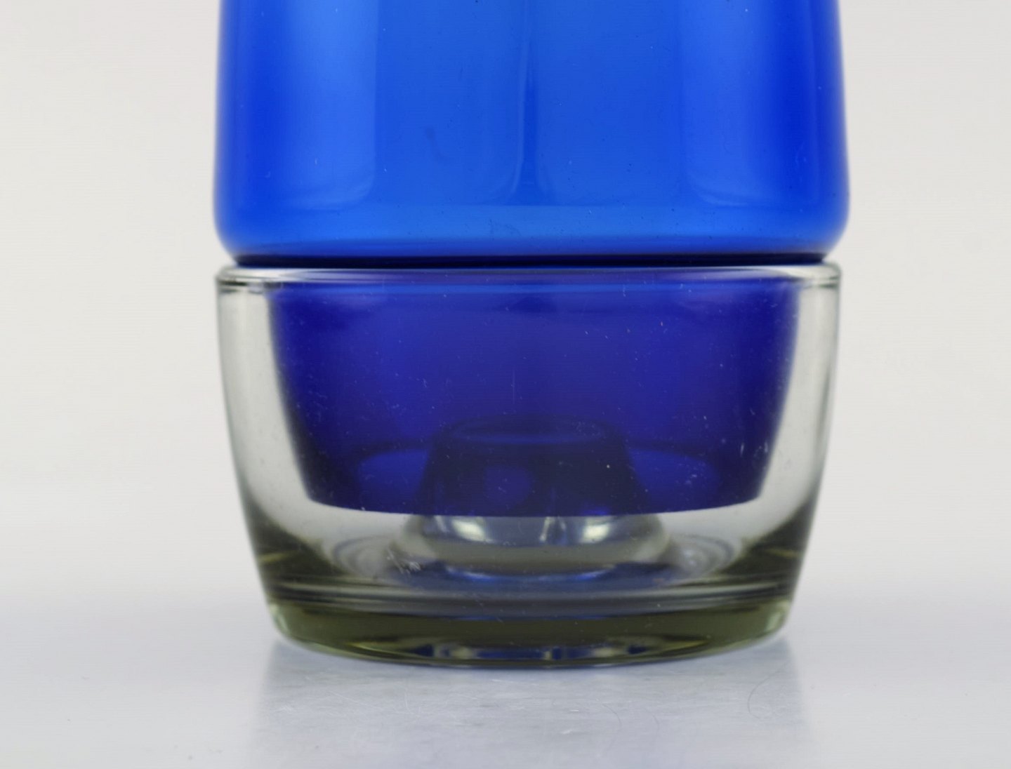 Per Lütken for Holmegaard. Et par sjældne hyggelamper til stearinlys i blåtog klart kunstglas. Designet i 1958. I flot stand. Måler: 19,5 x 8 cm.