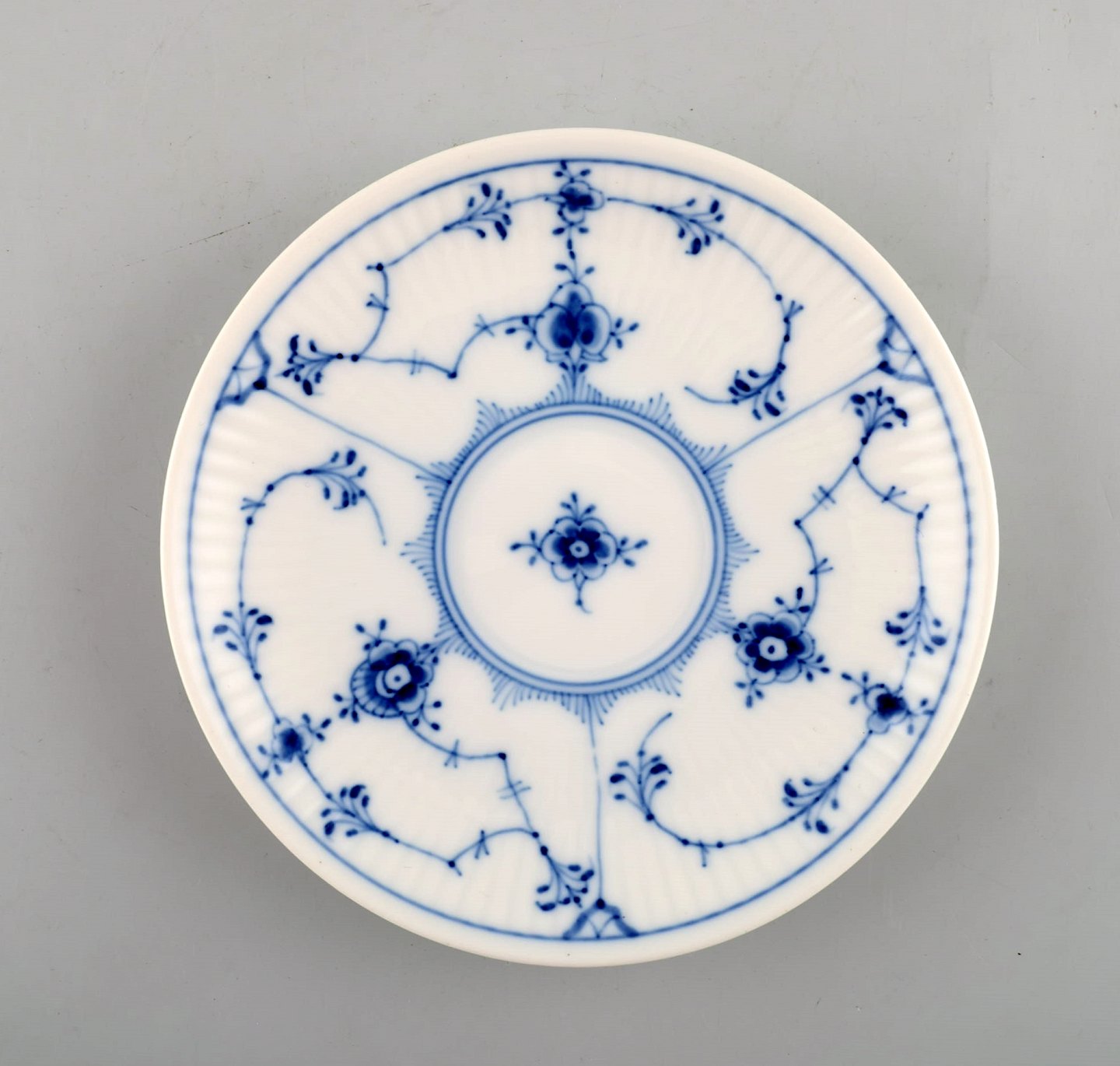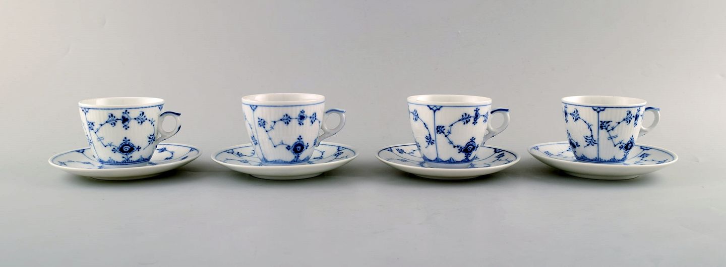 Royal Copenhagen. Set of four Blue Fluted plain coffee cup with saucer # 1/80. In perfect condition. 1st factory quality. Stamped. Cuo diameter: 7 cm. Saucer diameter: 12.5 cm.
