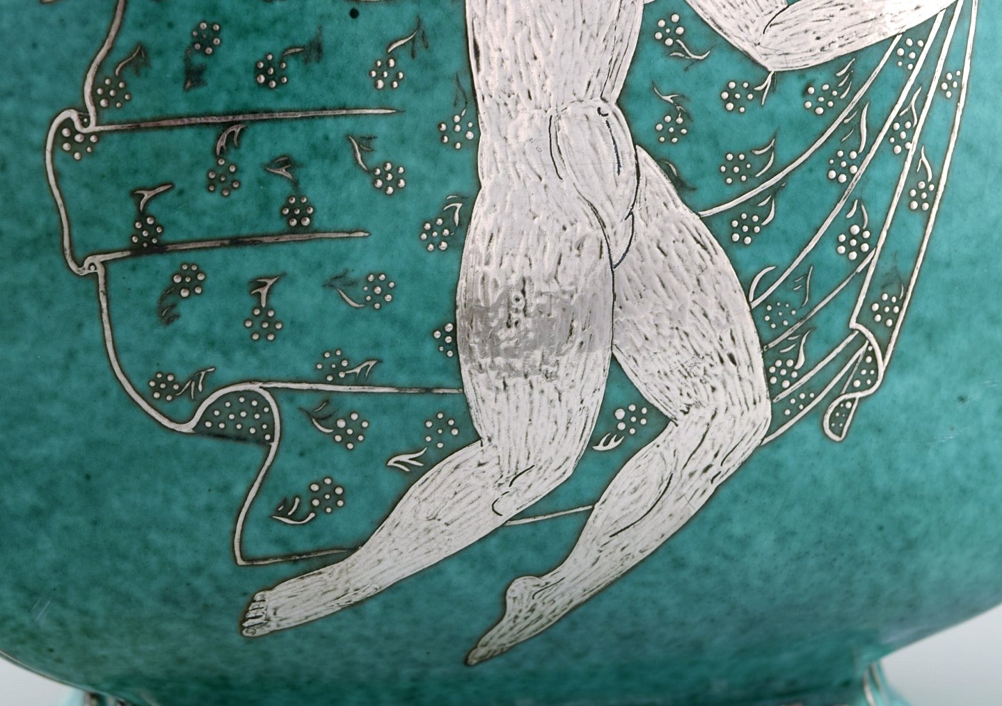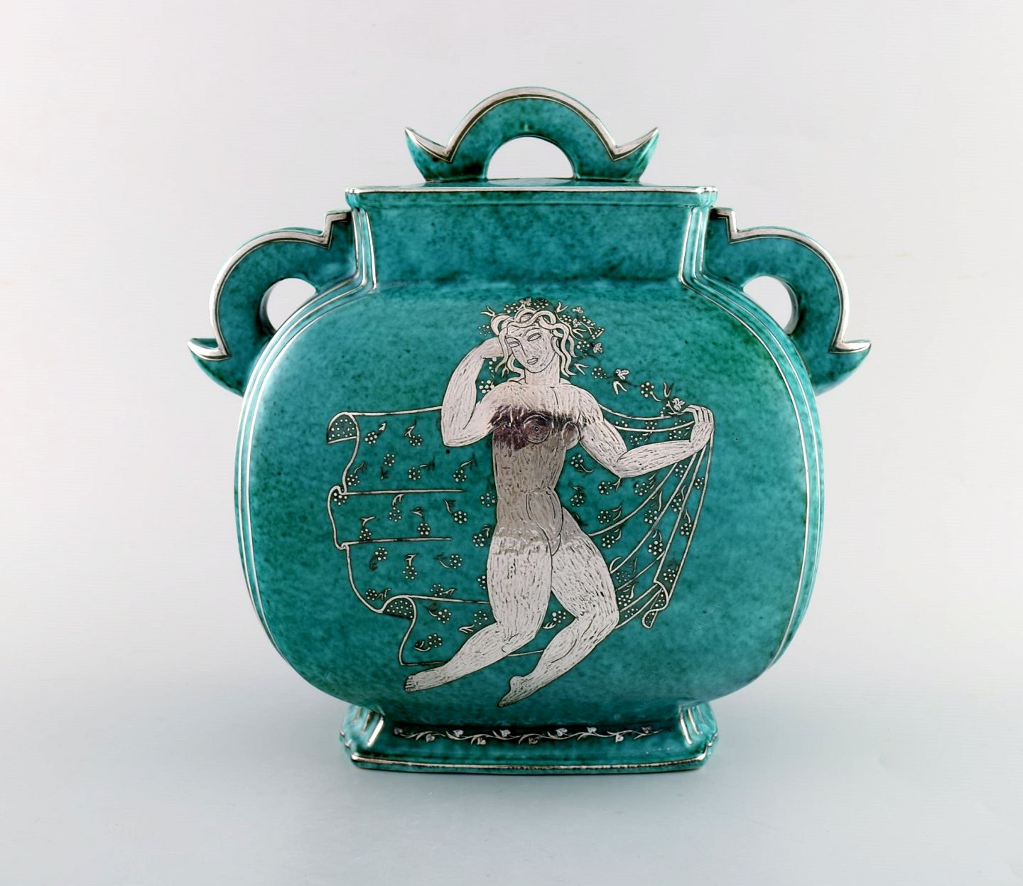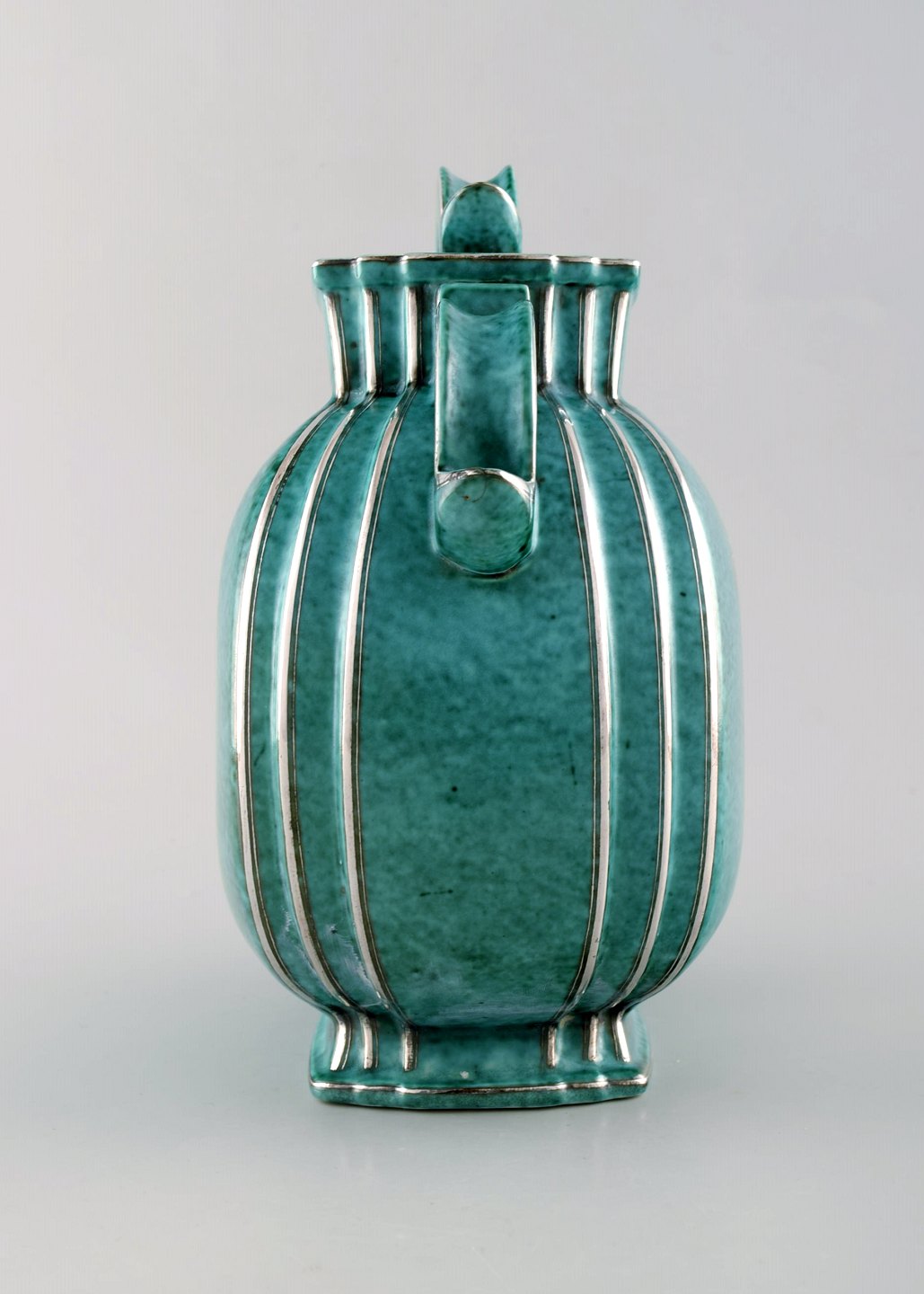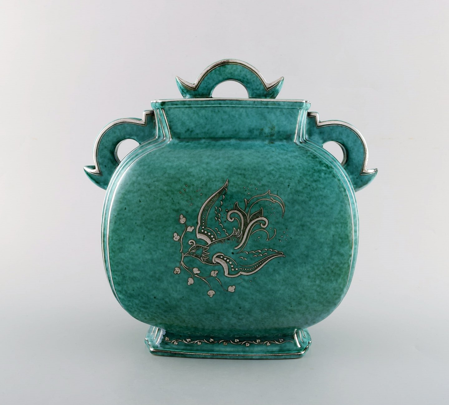 Wilhelm Kåge for Gustavsberg. Large Argenta art deco ceramic lidded jar decorated with silver inlaid. Sweden 1940's. Measures 25 x 24 cm. Stamped: Gustavsberg, Kåge. In perfect condition.