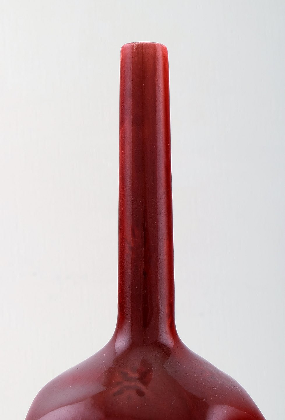 Rörstrand. Tidlig smalhalset vase i glaseret fajance. Smuk dyb rød glasur. Ca. 1900. Stemplet. I flot stand. Måler: 28 x 14,5 cm.
