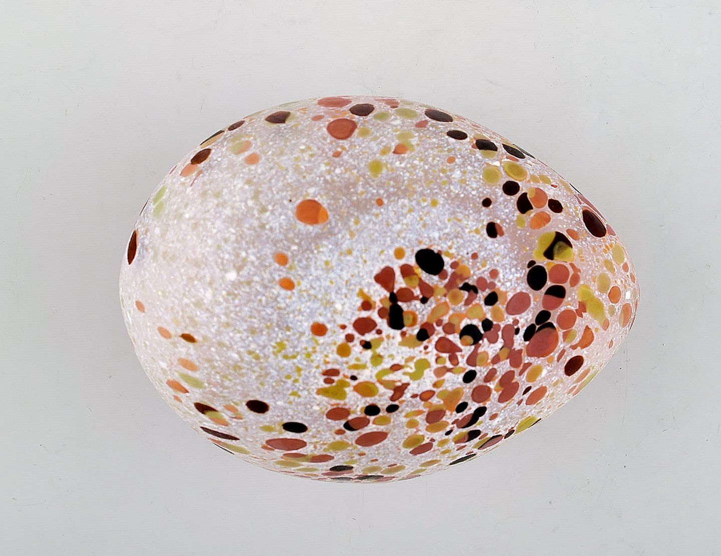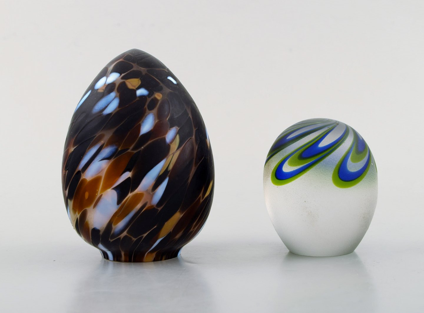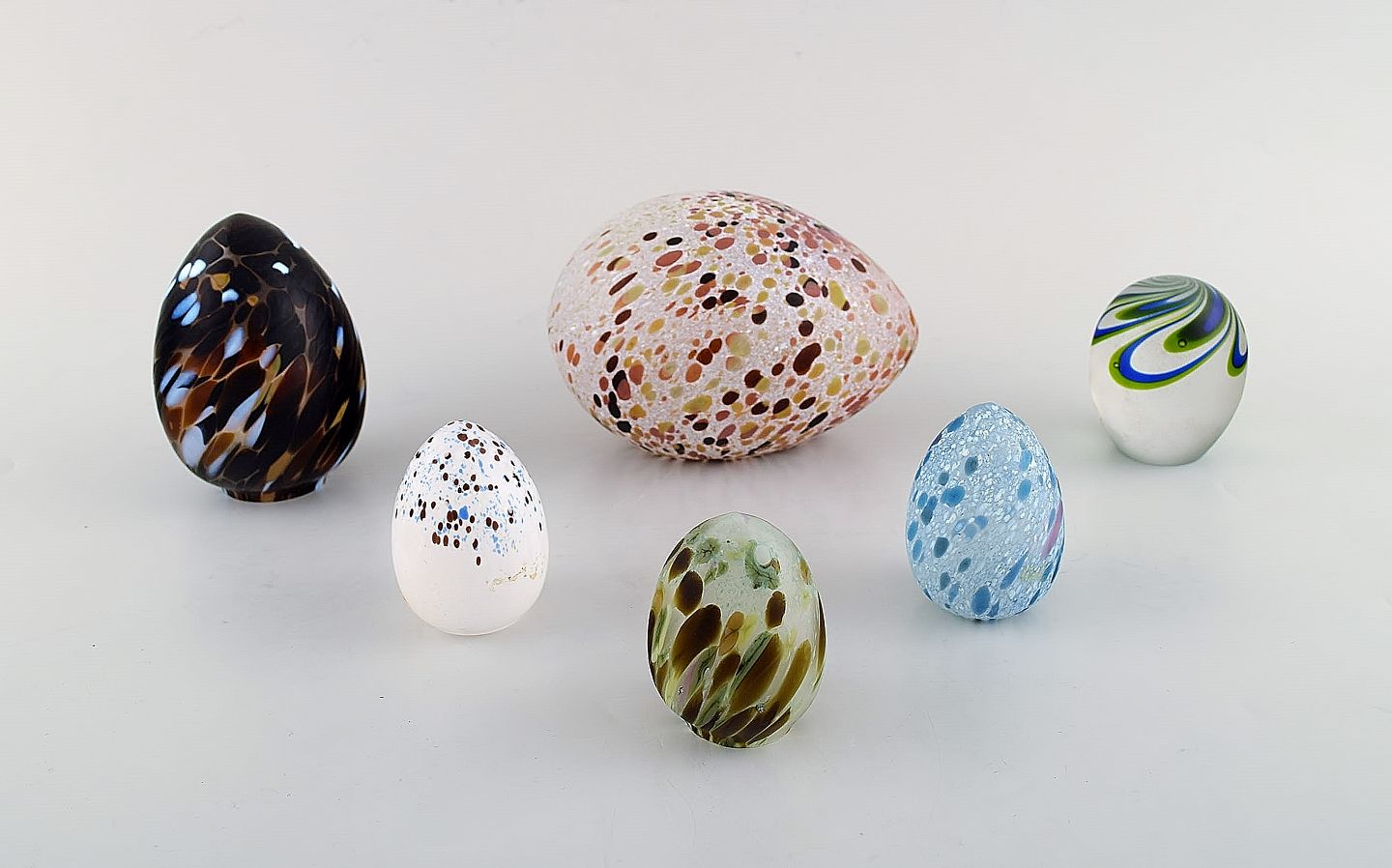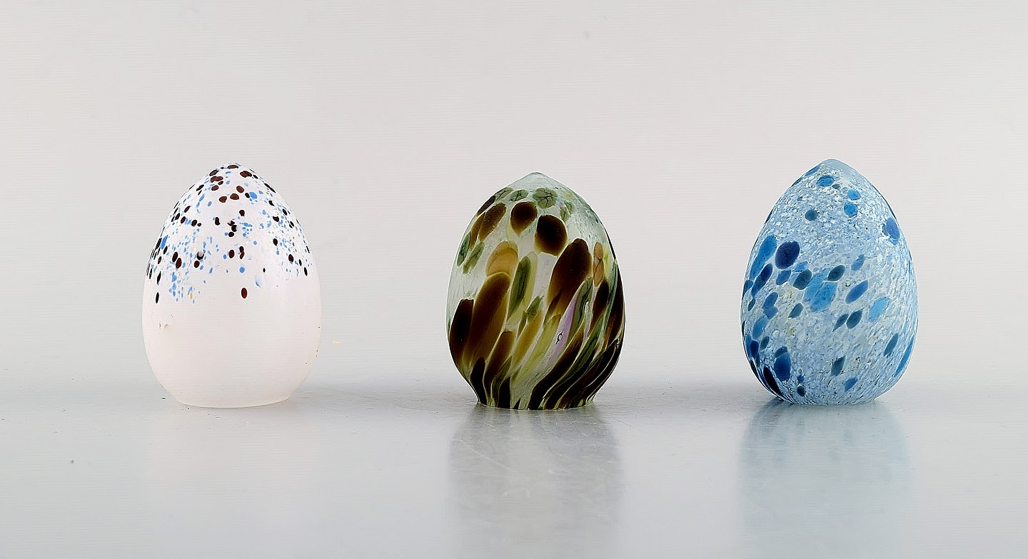 Kosta Boda. Six eggs in colored art glass. Swedish design, late 20th century. In very good condition. Largest measures: 14.5 x 9.5 cm. Sticker.