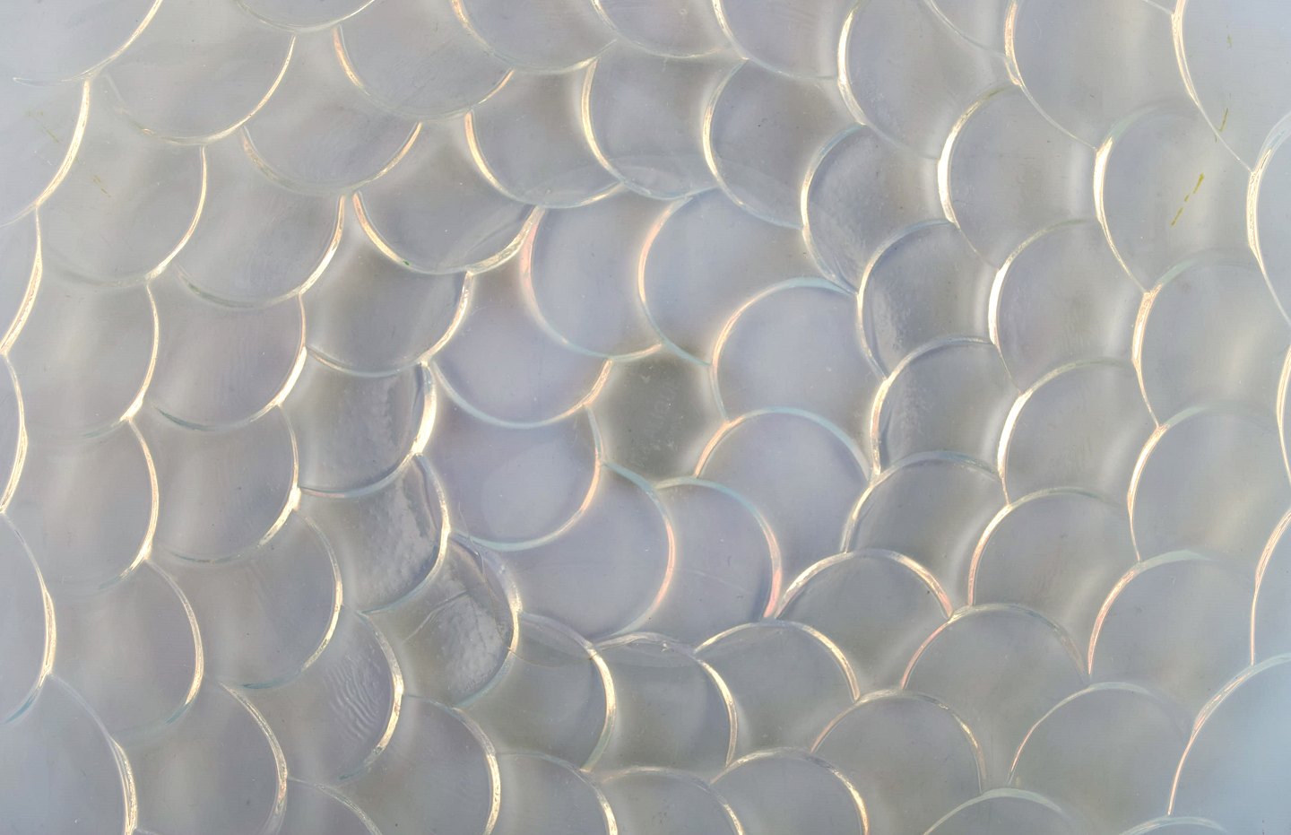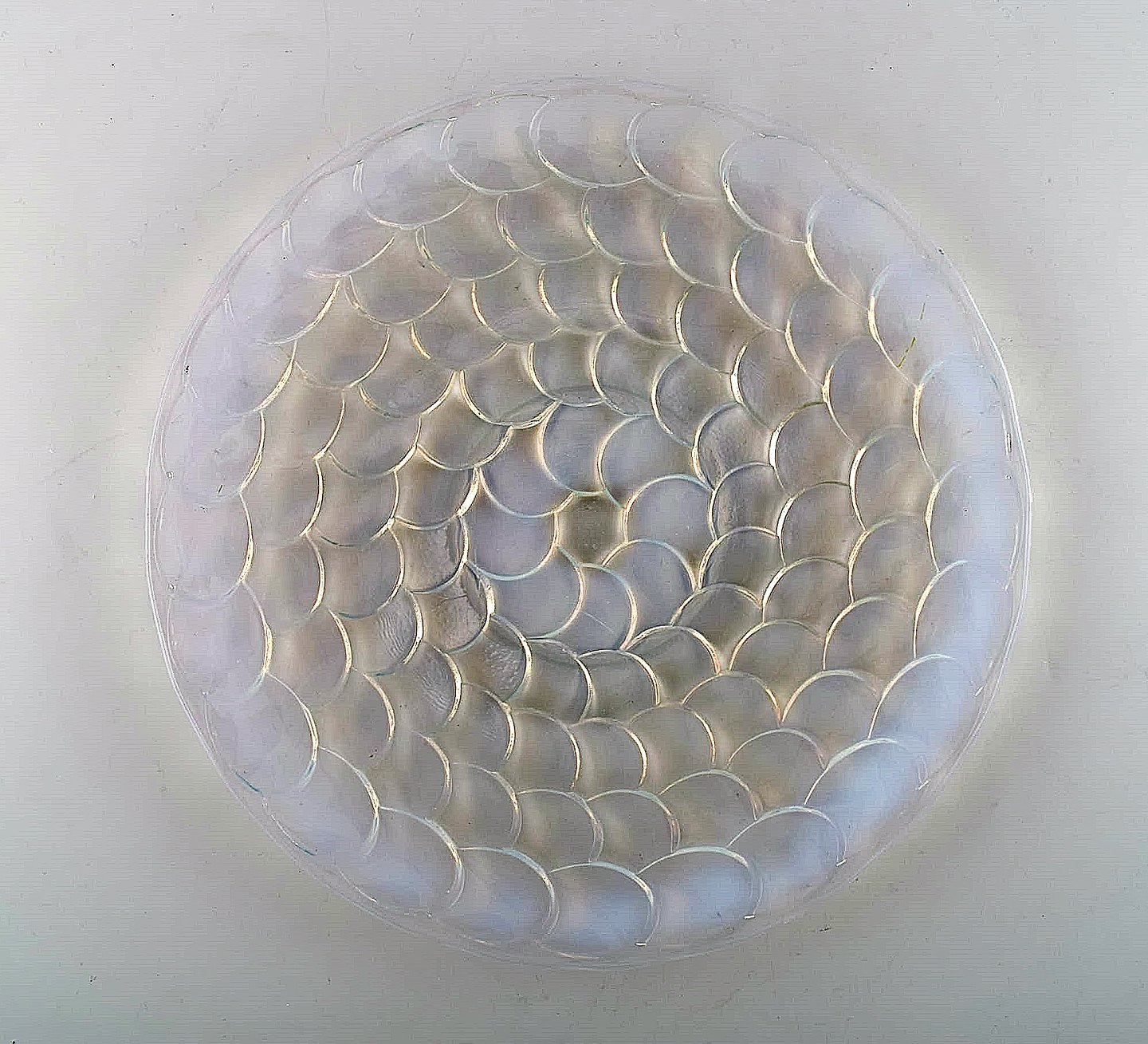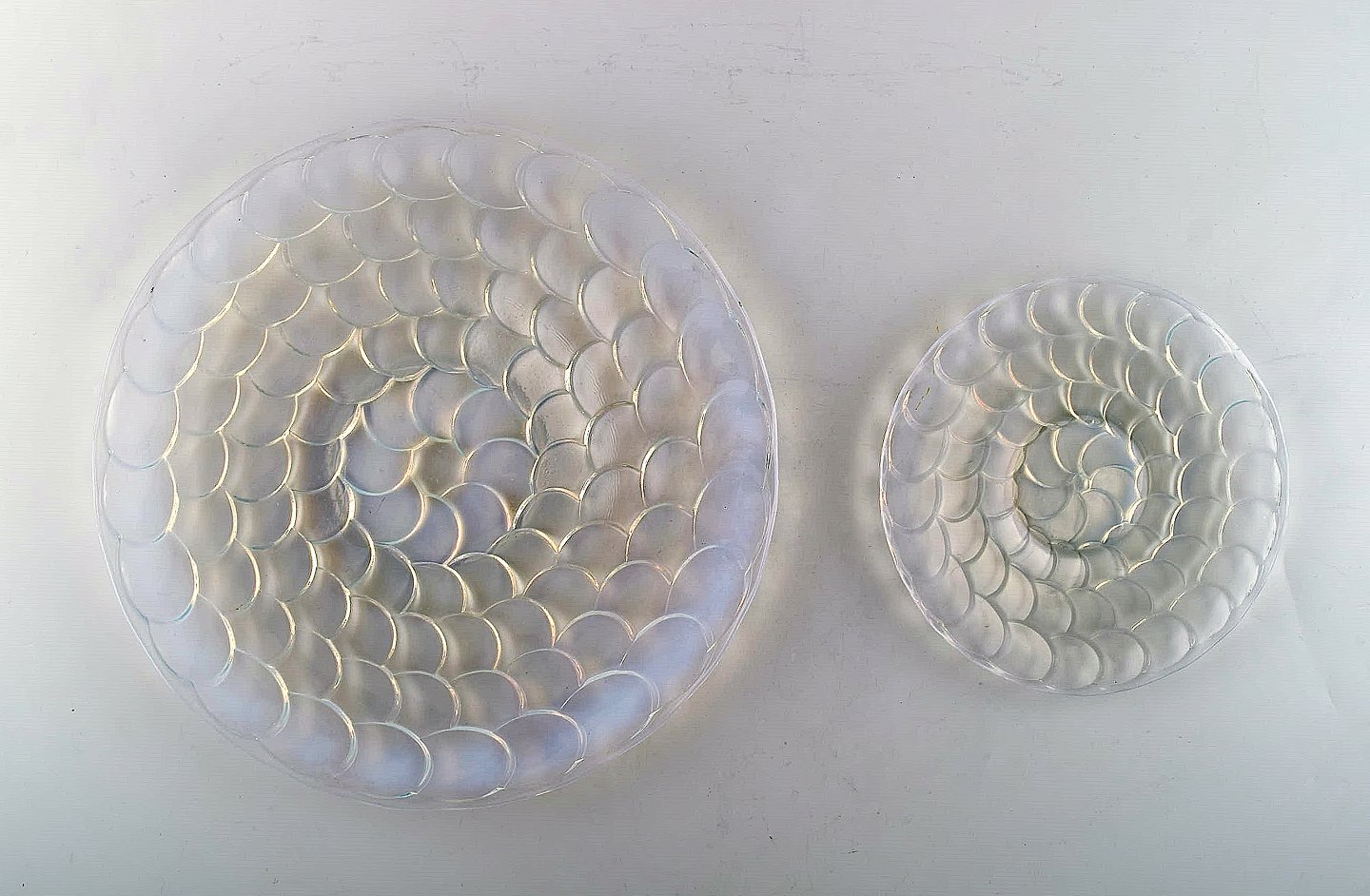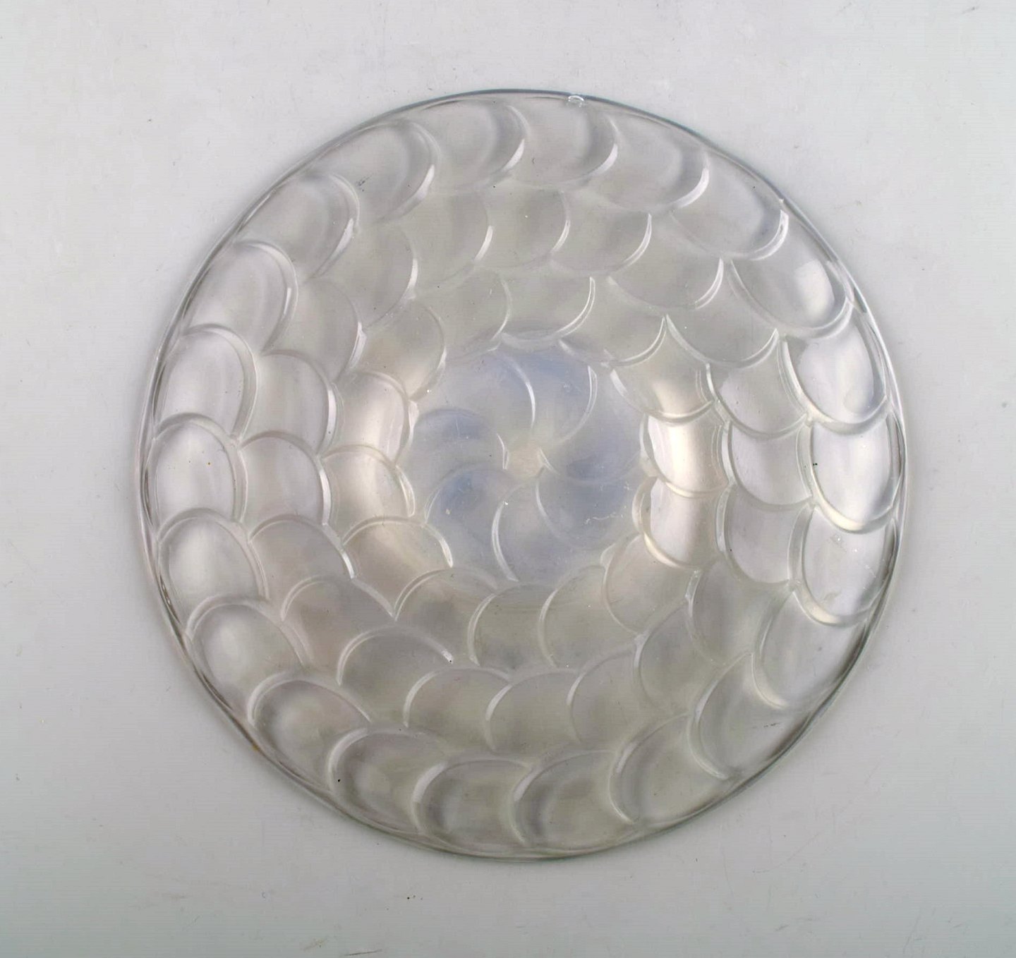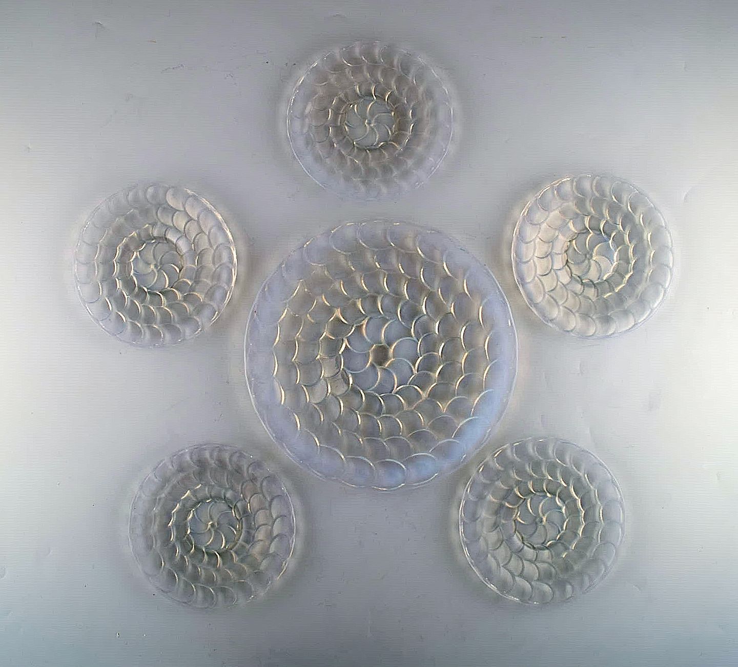 Five early and rare René Lalique plates and serving dish in art glass. Dated before 1945. Stamped: R. Lalique France. In very good condition. The serving dish measures: 29 x 2.5 cm. Plates measure: 18 cm.