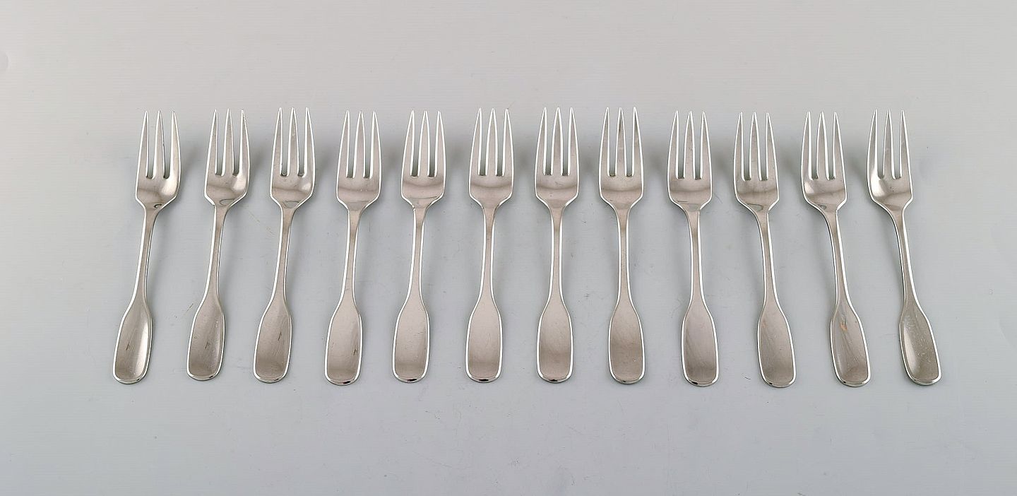 Hans Hansen sølvbestik. Tolv "Susanne" kagegafler i sterlingsølv. Midt 1900-tallet. Måler: 13,5 cm. Perfekt stand. Stemplet.
