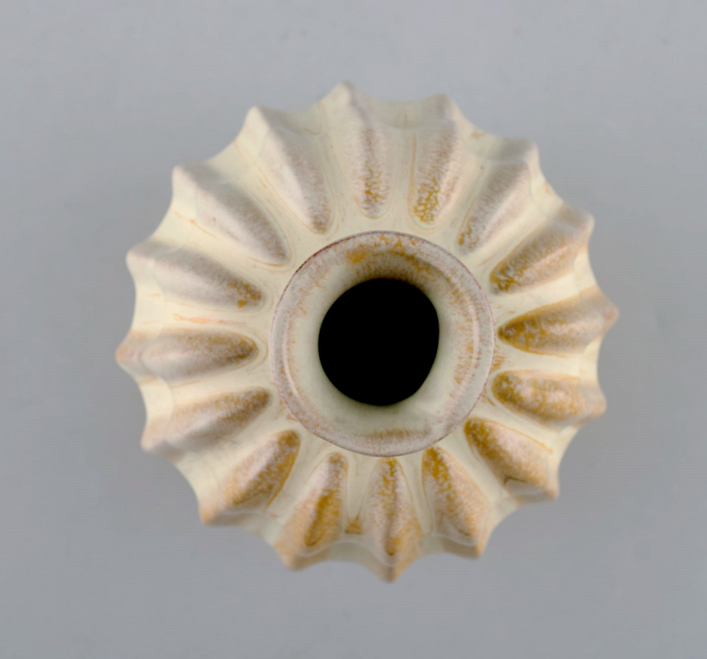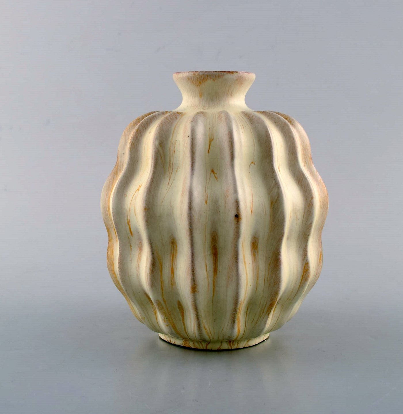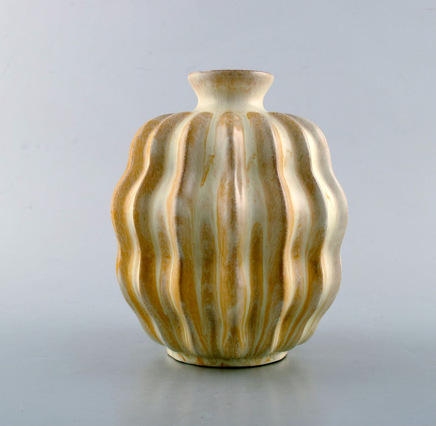 Vicke Lindstrand for Upsala-Ekeby. Organisk vase i glaseret stentøj. Smuk glasur i gule og hvide nuancer. Riflet design, 1950'erne. Utydeligt stemplet. Måler: 15,5 x 13,5 cm. I flot stand.