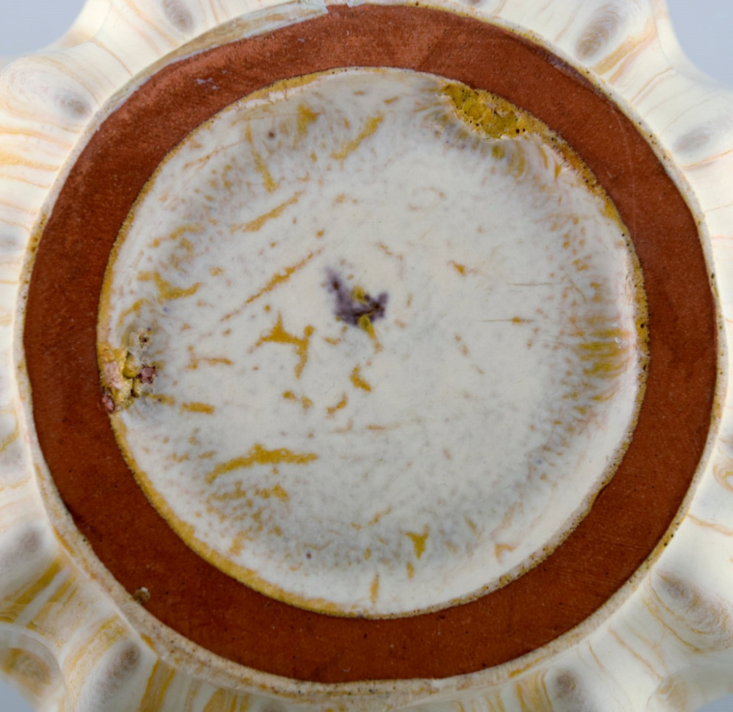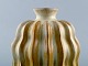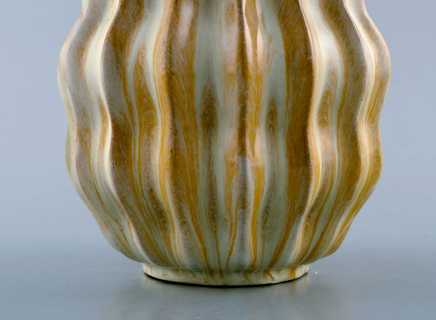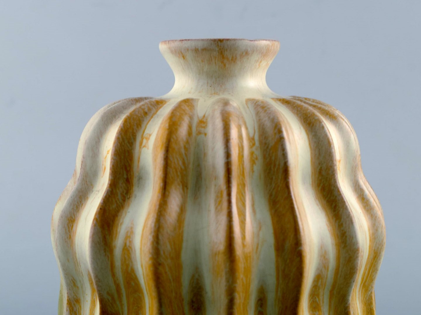 Vicke Lindstrand for Upsala-Ekeby. Organisk vase i glaseret stentøj. Smuk glasur i gule og hvide nuancer. Riflet design, 1950'erne. Utydeligt stemplet. Måler: 15,5 x 13,5 cm. I flot stand.