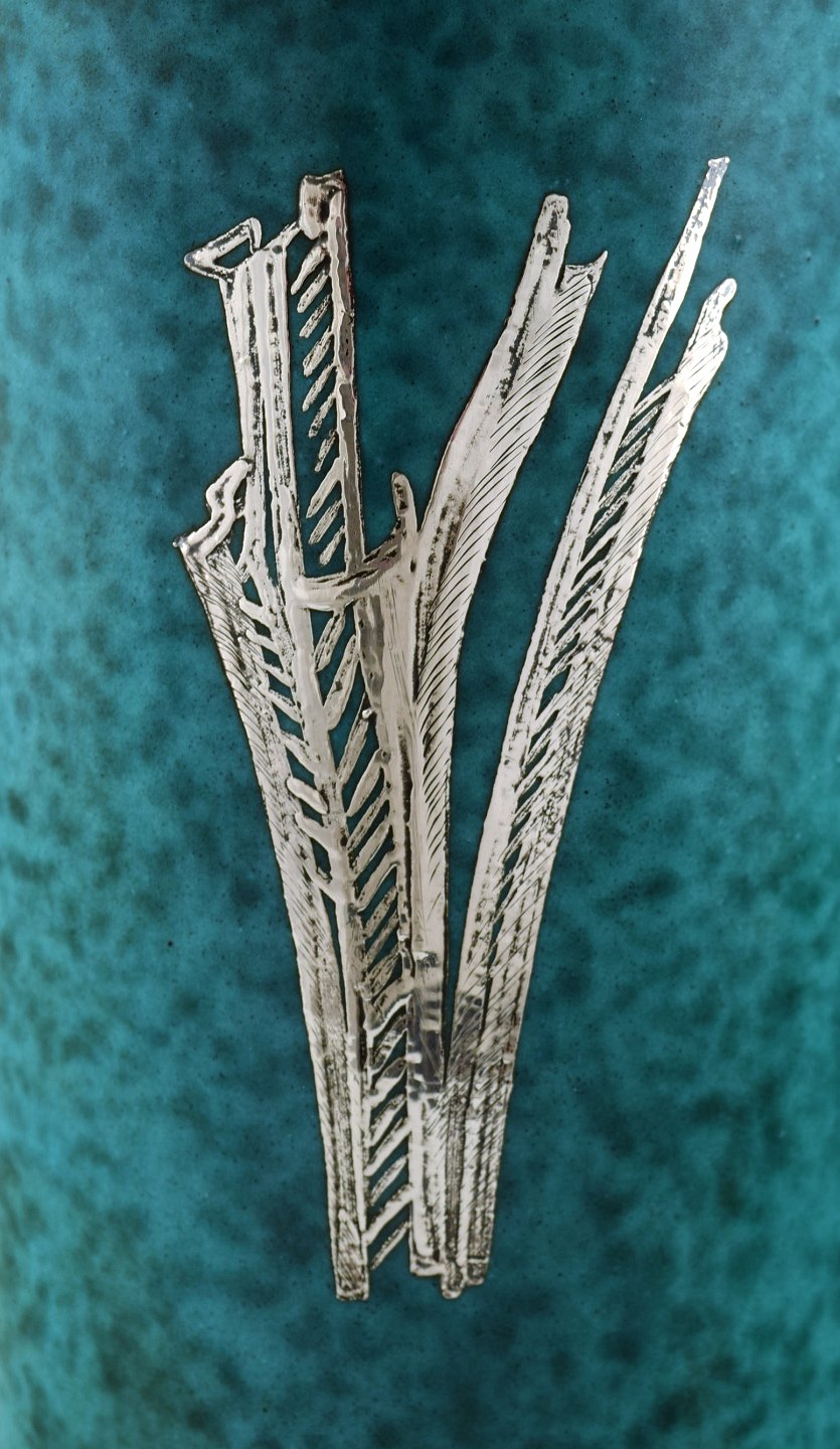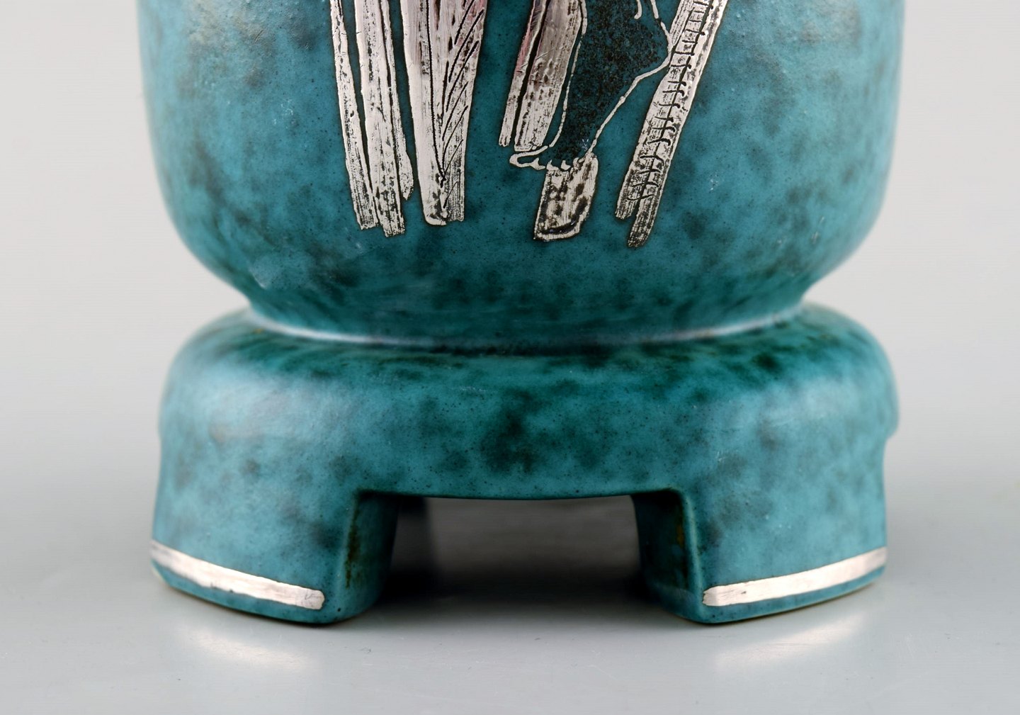 Wilhelm Kåge for Gustavsberg. Rare argenta art deco ceramic vase decorated with nude woman in silver inlaid. Sweden 1940's. Measures 29,5 x 11,5 cm. Stamped: Gustavsberg, Kåge. In perfect condition.