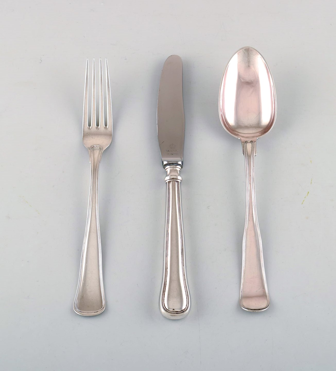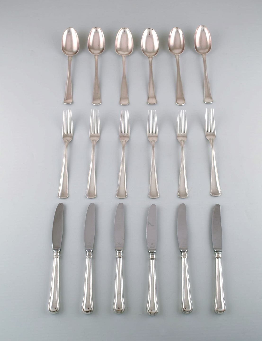 Cohr, dansk sølvsmed m.fl. Middagsbestik i tretårnet sølv. Komplet sæt til seks personer. 1950'erne. I flot stand. Stemplet. Middagskniven måler: 22,5 cm.
