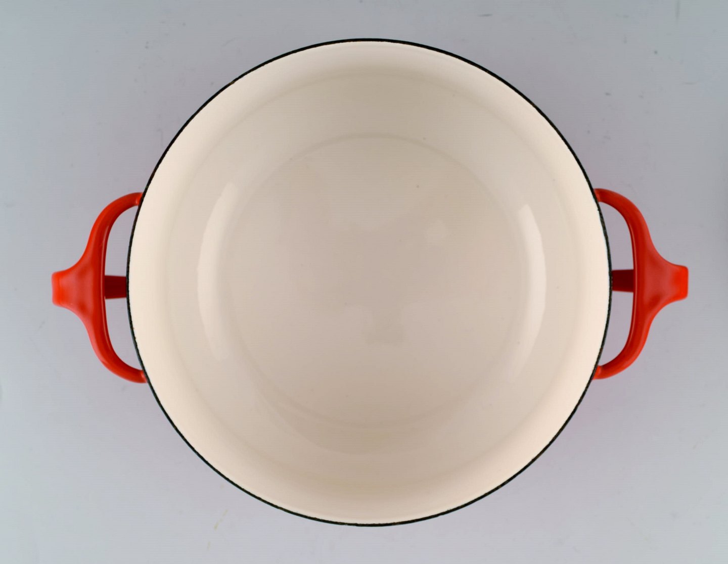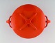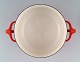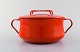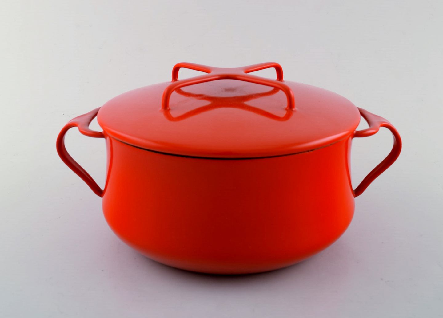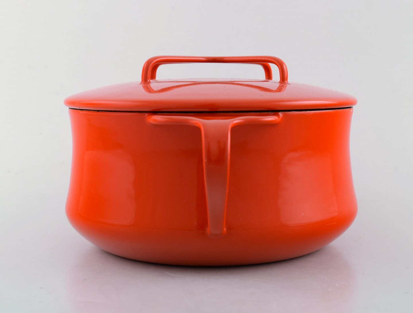 Jens H. Quistgaard: Red enamel pot with lid and white inside. Stamped Danish Designs Denmark, JHQ. 1960's. Measures: 26 x 12.5 cm. In very good condition. minor wear.