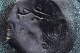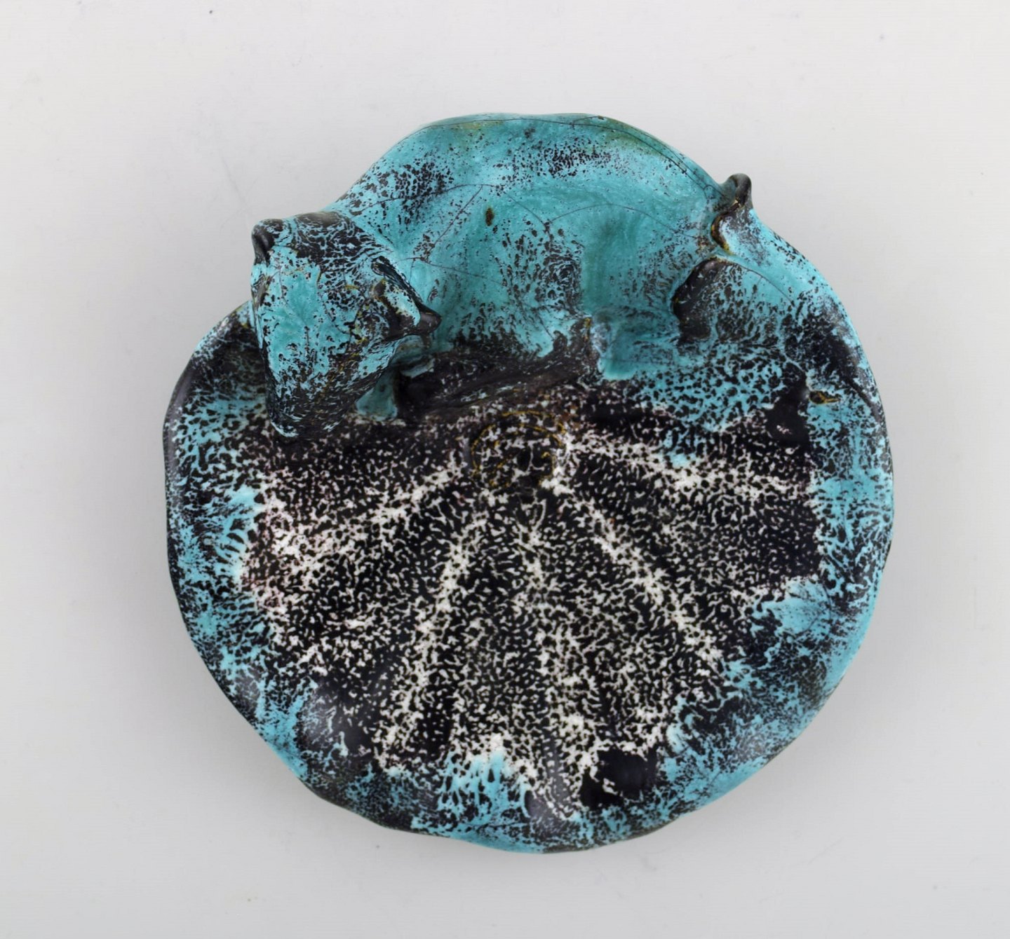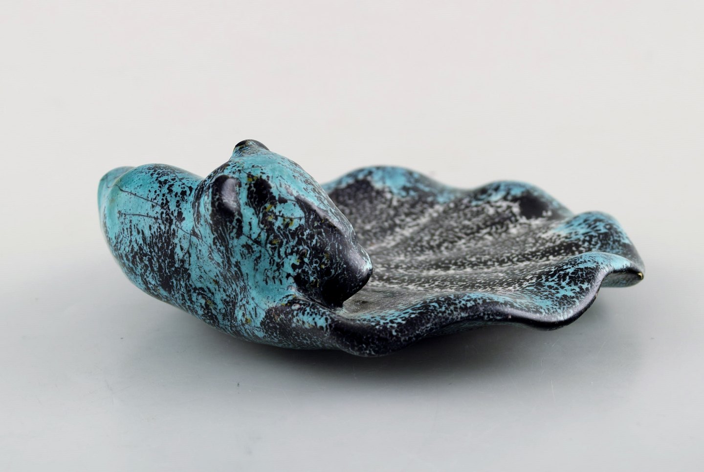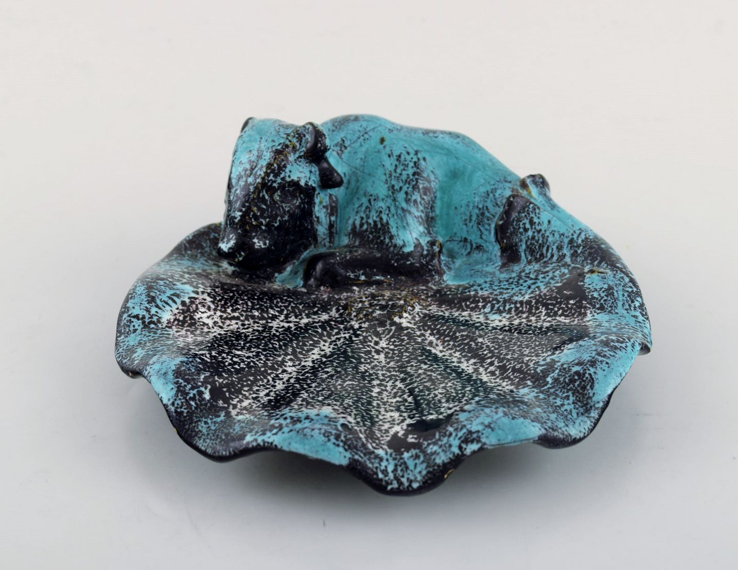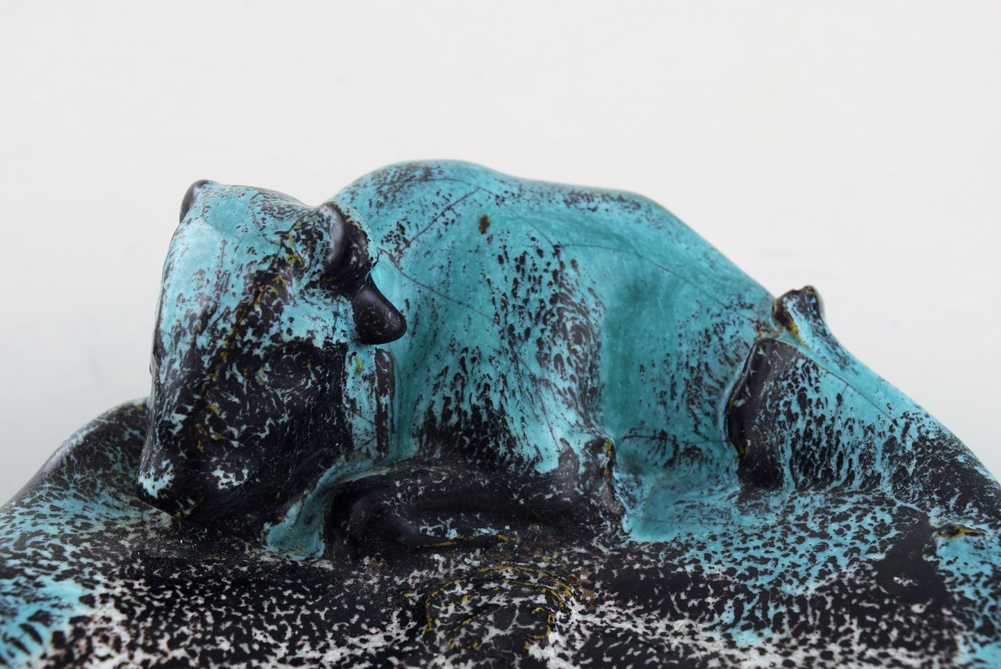 Christian Klein for Kähler. Sjældent fad i glaseret keramik med bison. Smuk glasur i turkis nuancer. Dateret 1916. I flot stand. Stemplet. Måler: 14 x 5 cm.