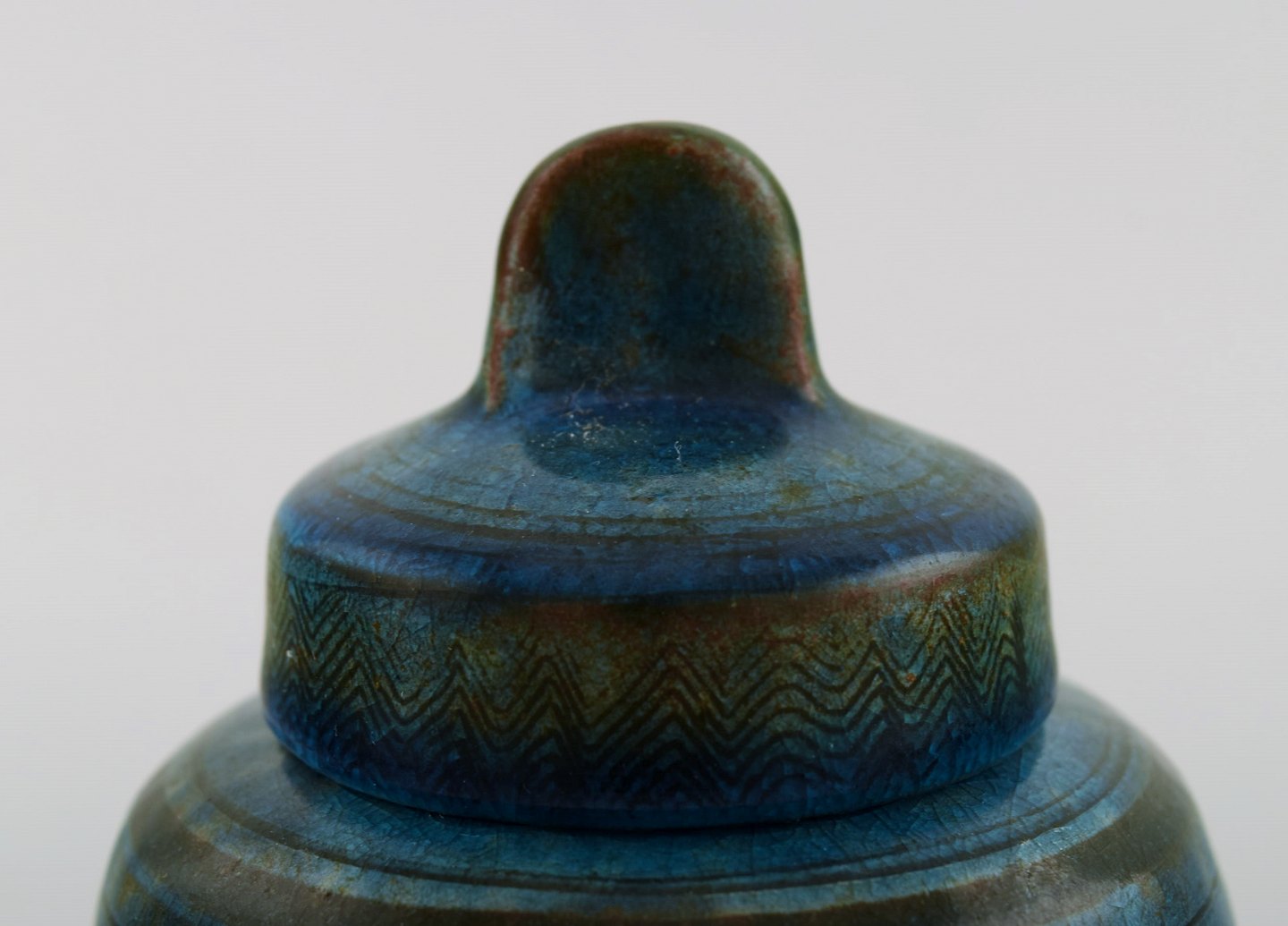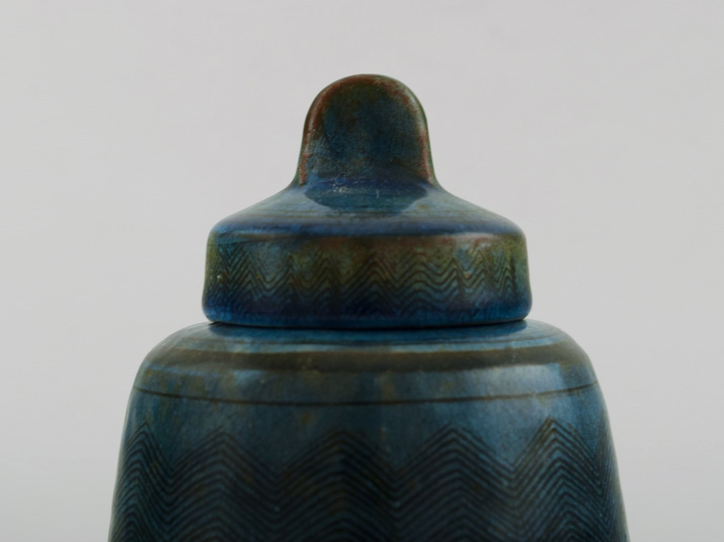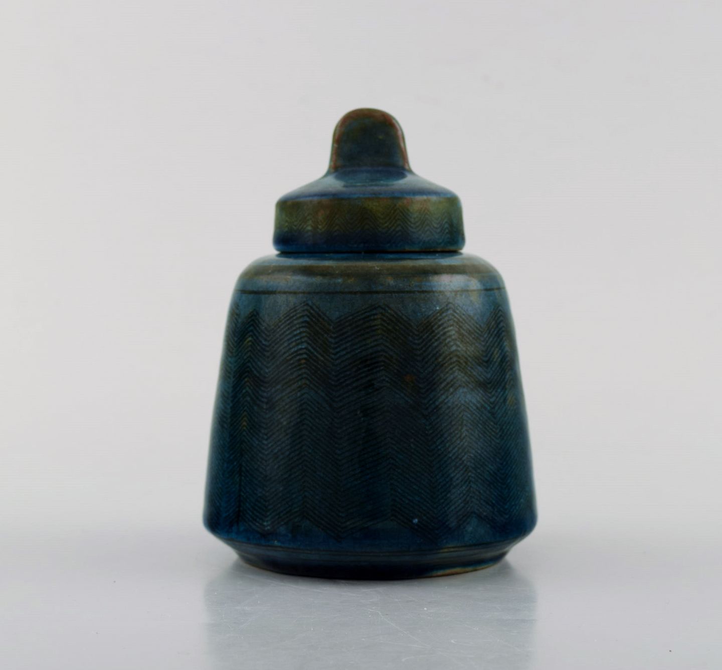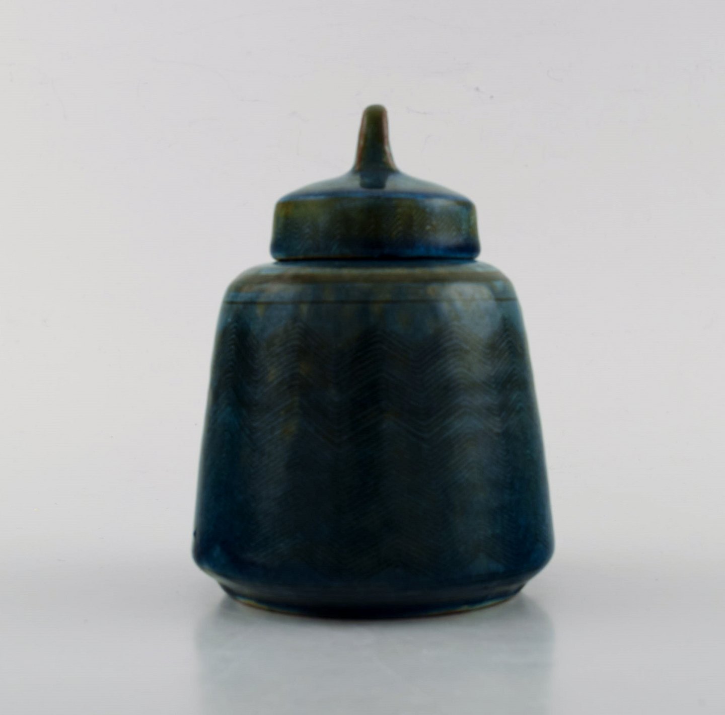 Nils Kähler for Kähler, HAK. Rare glazed lidded jar with sgrafitto in beautiful turquoise glaze. 1960's. Measures: 12.5 x 9.5 cm. In very good condition. Stamped.