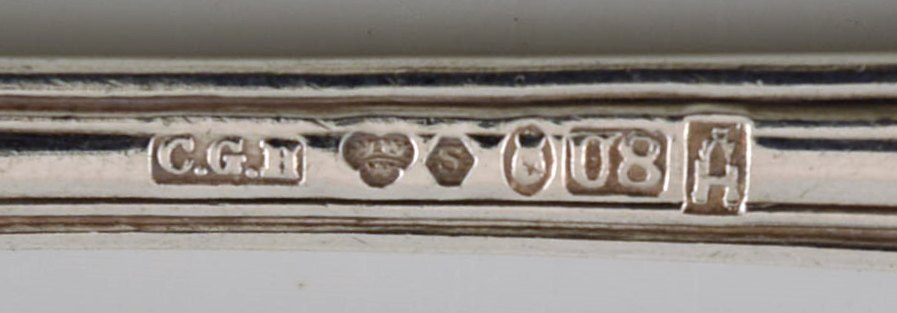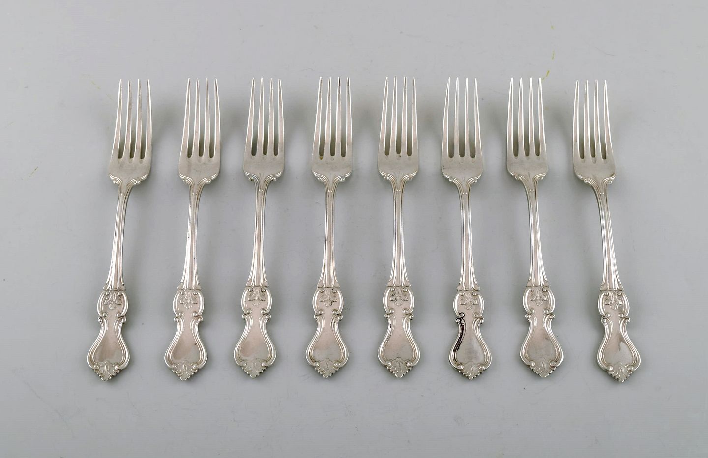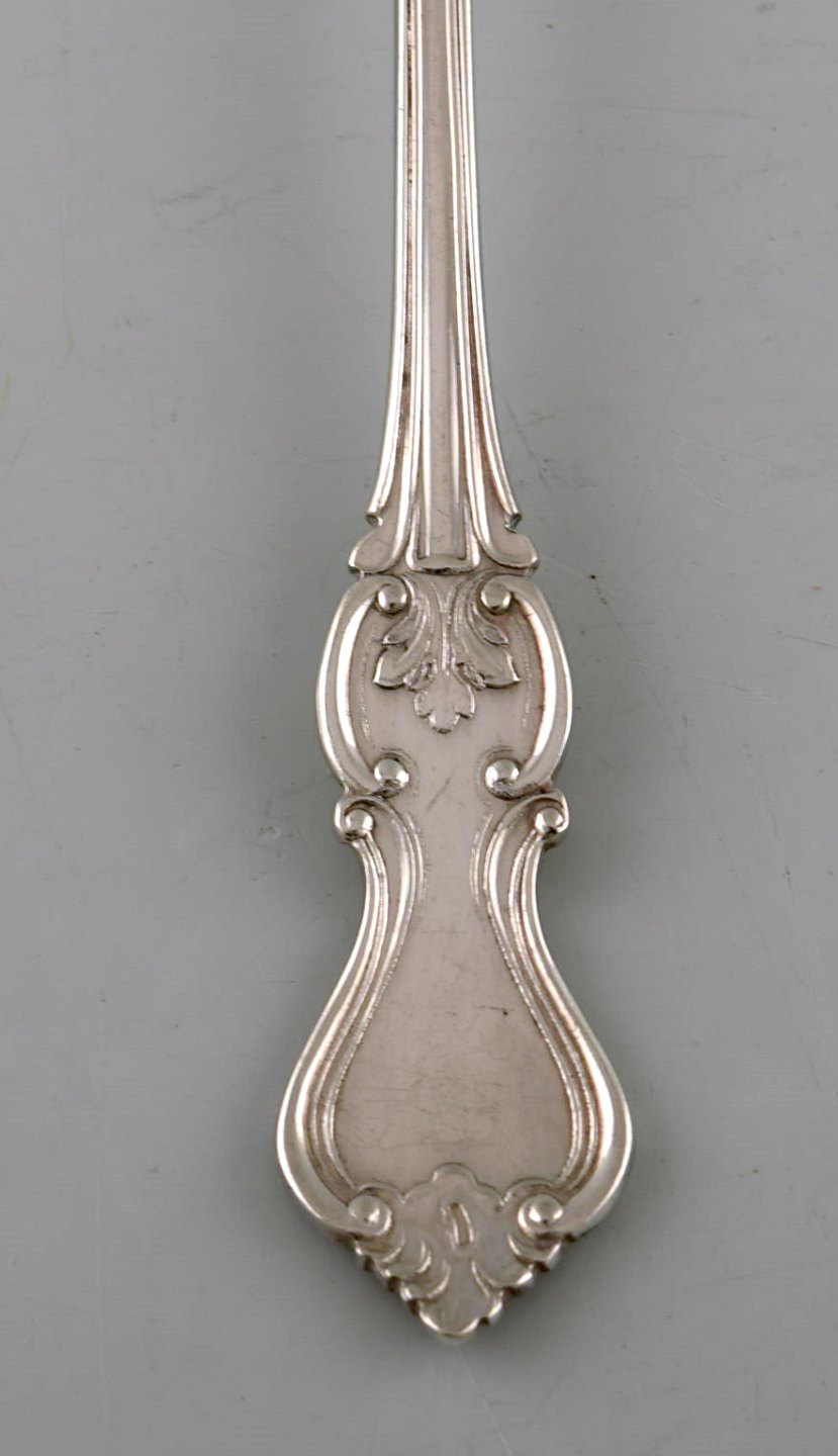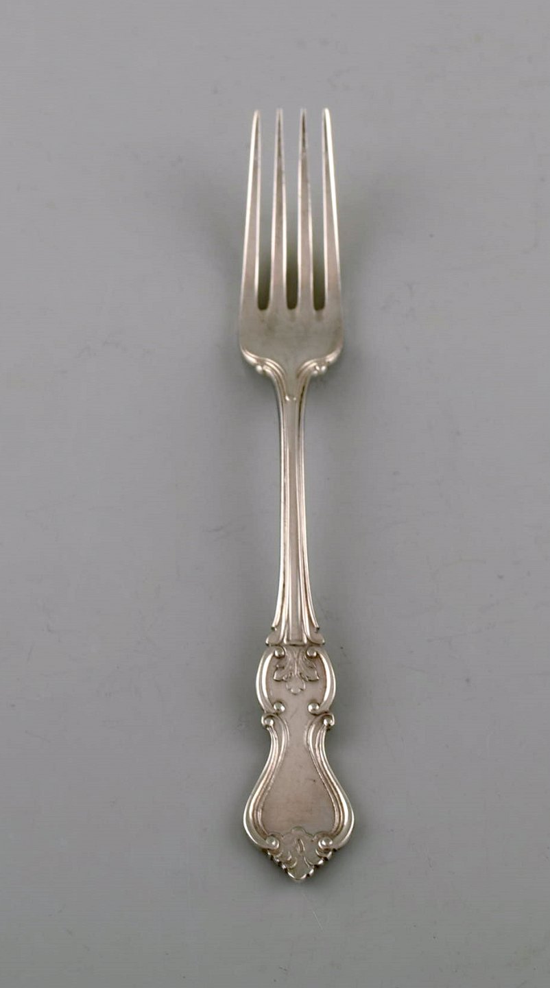 Hallbergs Guldsmeds Ab, Sverige. Sæt på otte "Olga" frokost- / barnegafler i sølv. Dateret 1946. Måler: 14,5 cm. Stemplet. I flot stand.