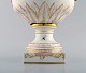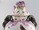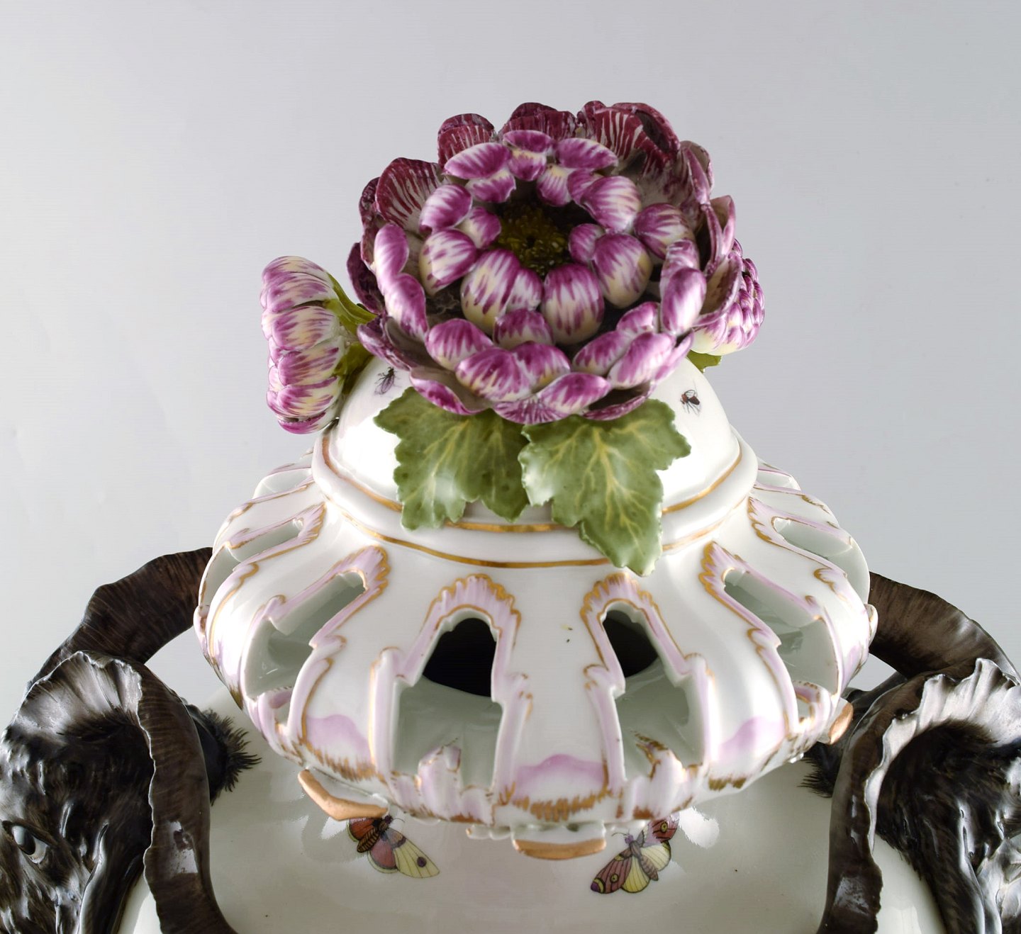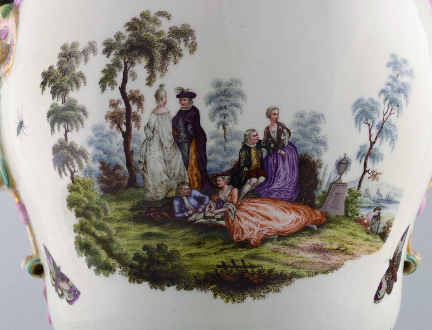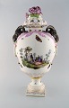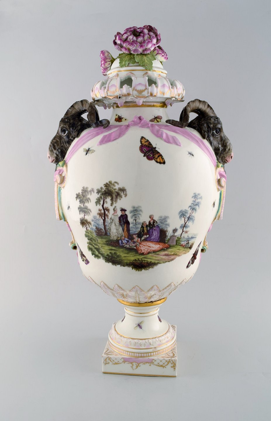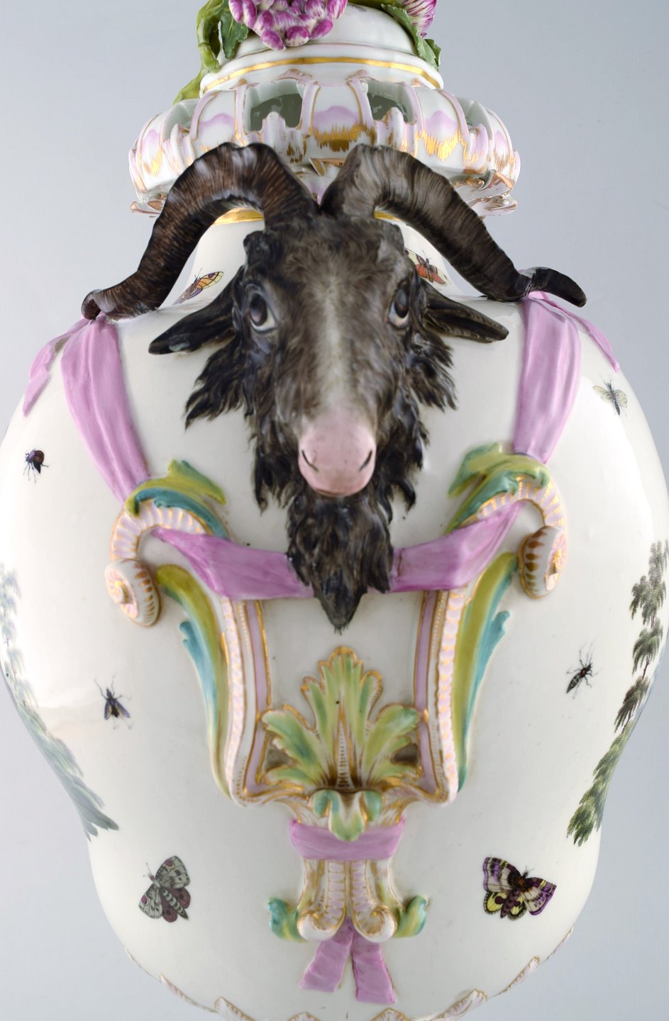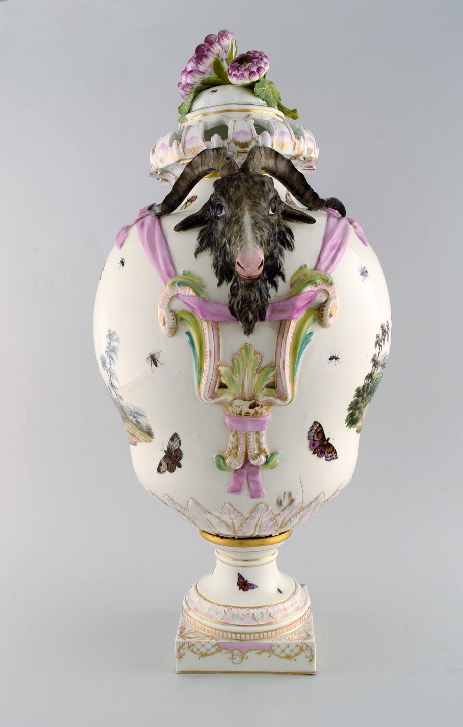 KPM, Berlin. Monumental antique lidded vase in porcelain. Overglaze. Goats and pink flowers in relief and hand painted with butterflies and romantic scenery. Museum quality. 1780's.