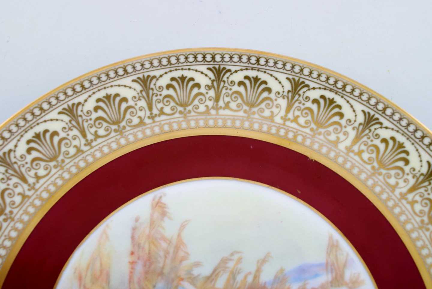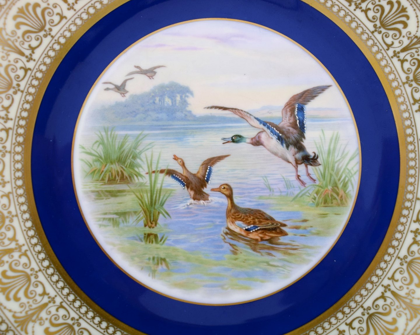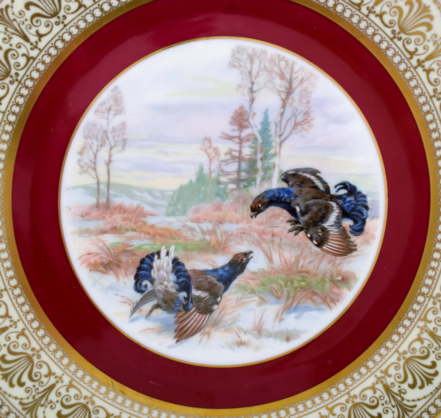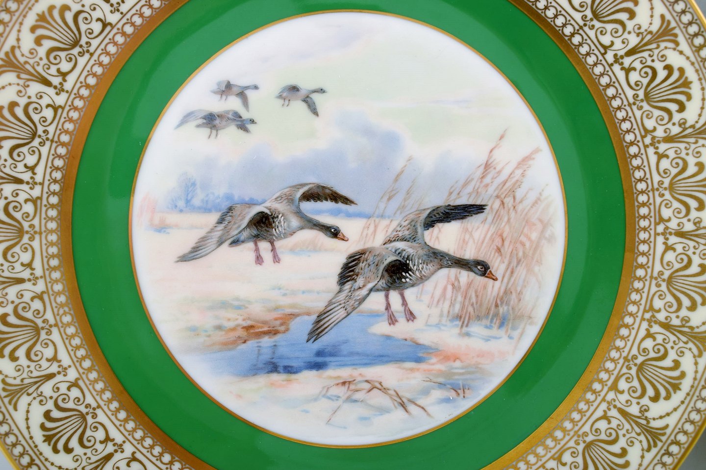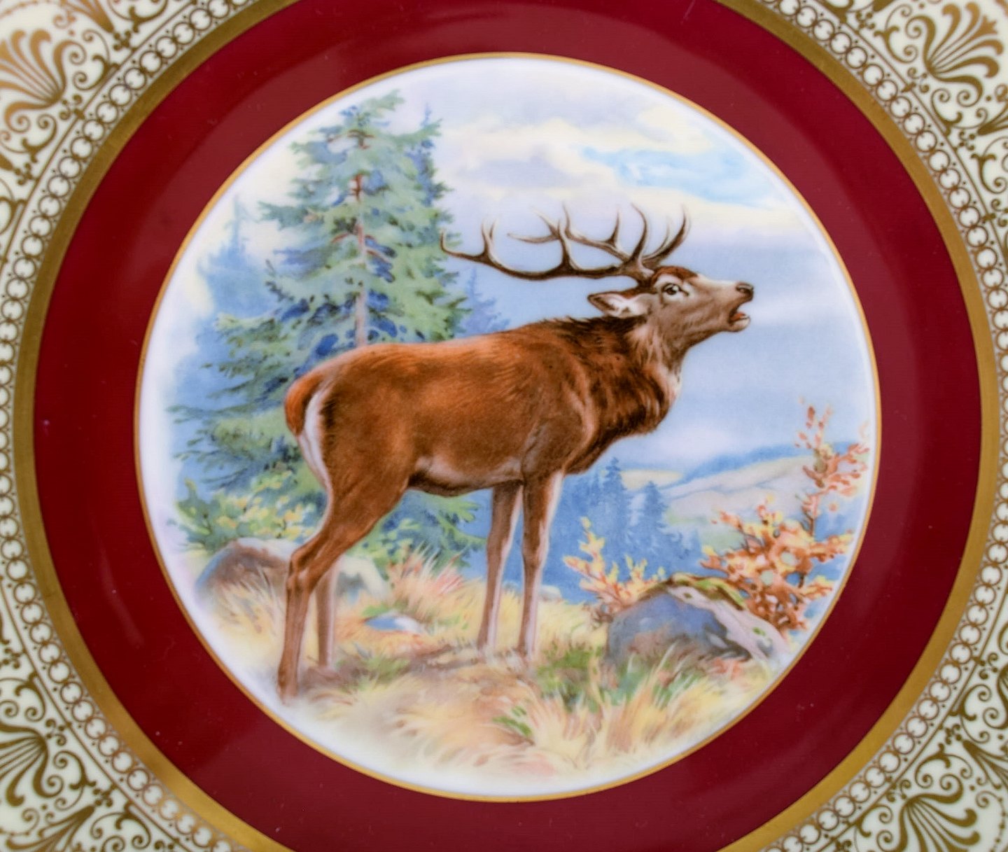 Thomas/Bavaria, Tyskland. Fem dekorationstallerkener med håndmalede jagtmotiver. 1930-50'erne. Fasaner, kronhjort, vildænder og grågæs. Måler: 27 cm. I flot stand. Stemplet.