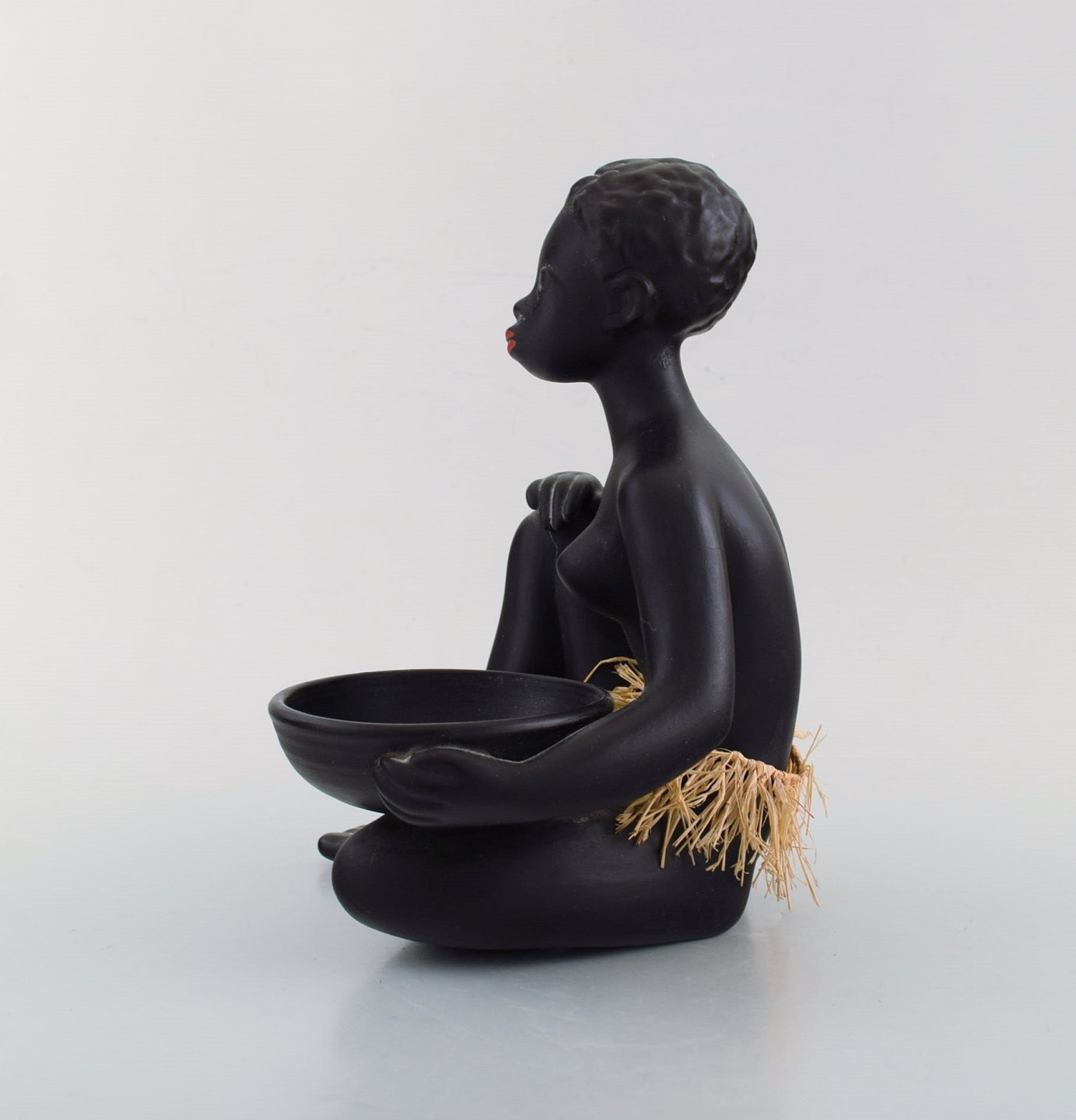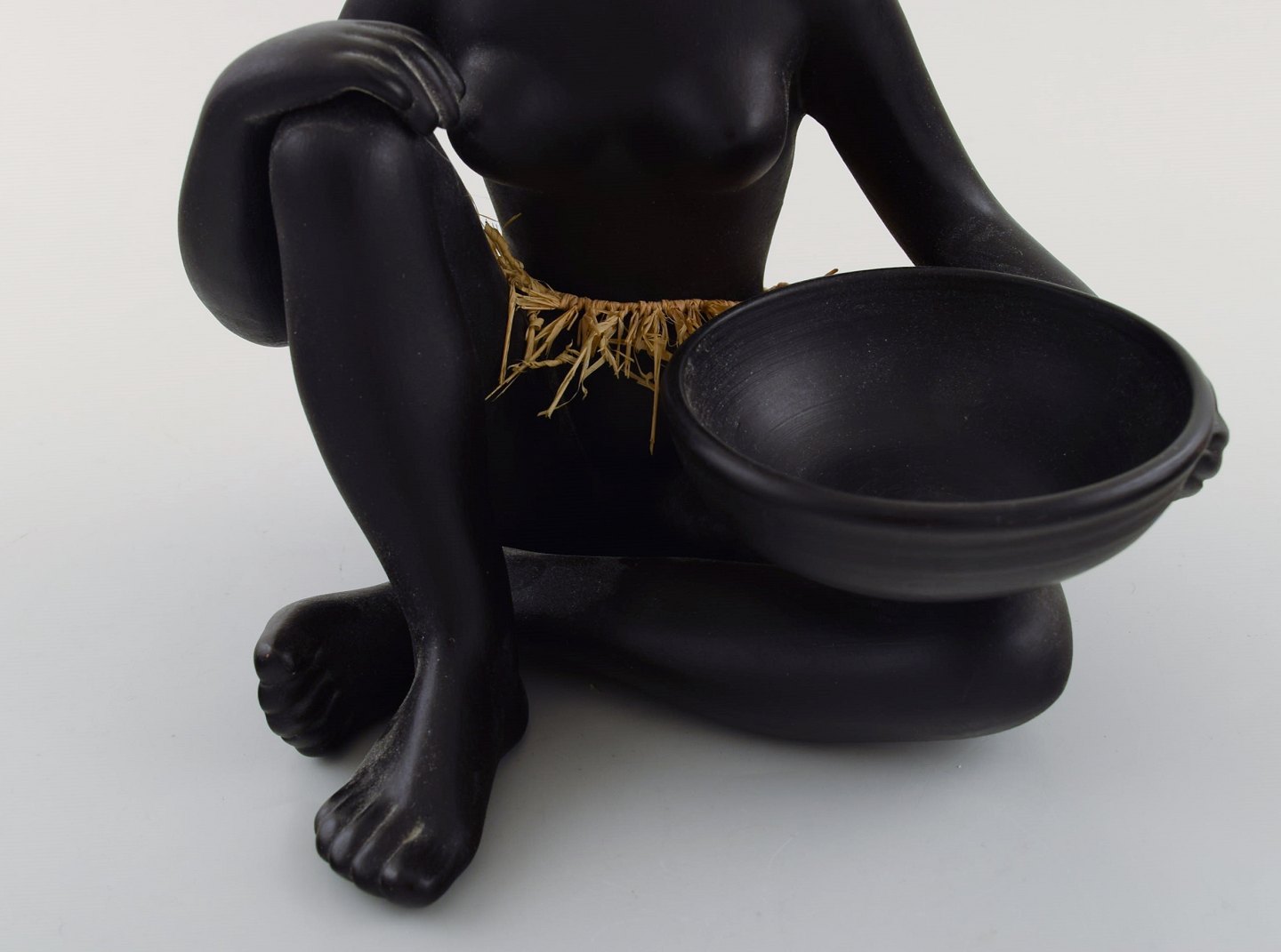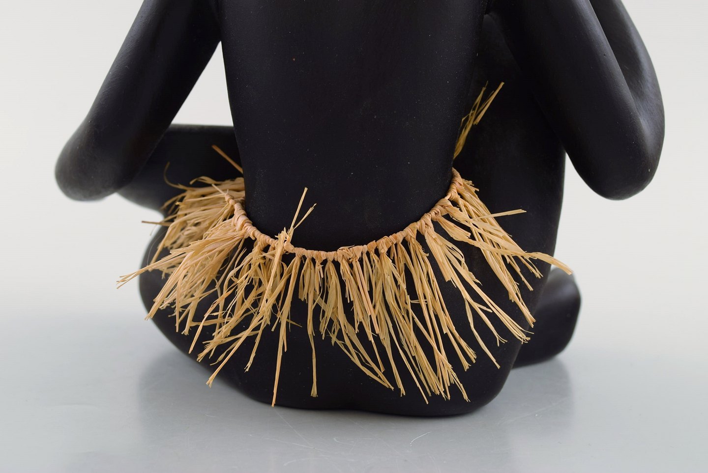 Gmunder Keramik, Østrig. Nøgen "Negresse" skulptur i sort keramik med skørt i bast. 1950'erne. Modelnummer 2220. I flot stand. Måler: 22 x 20 cm. Stemplet.