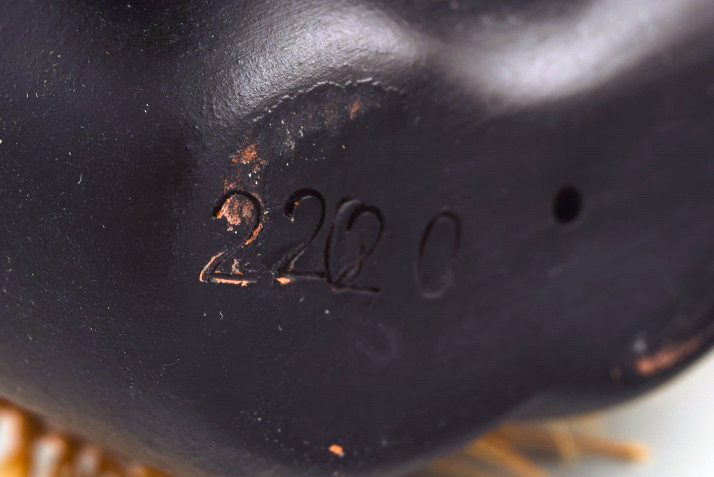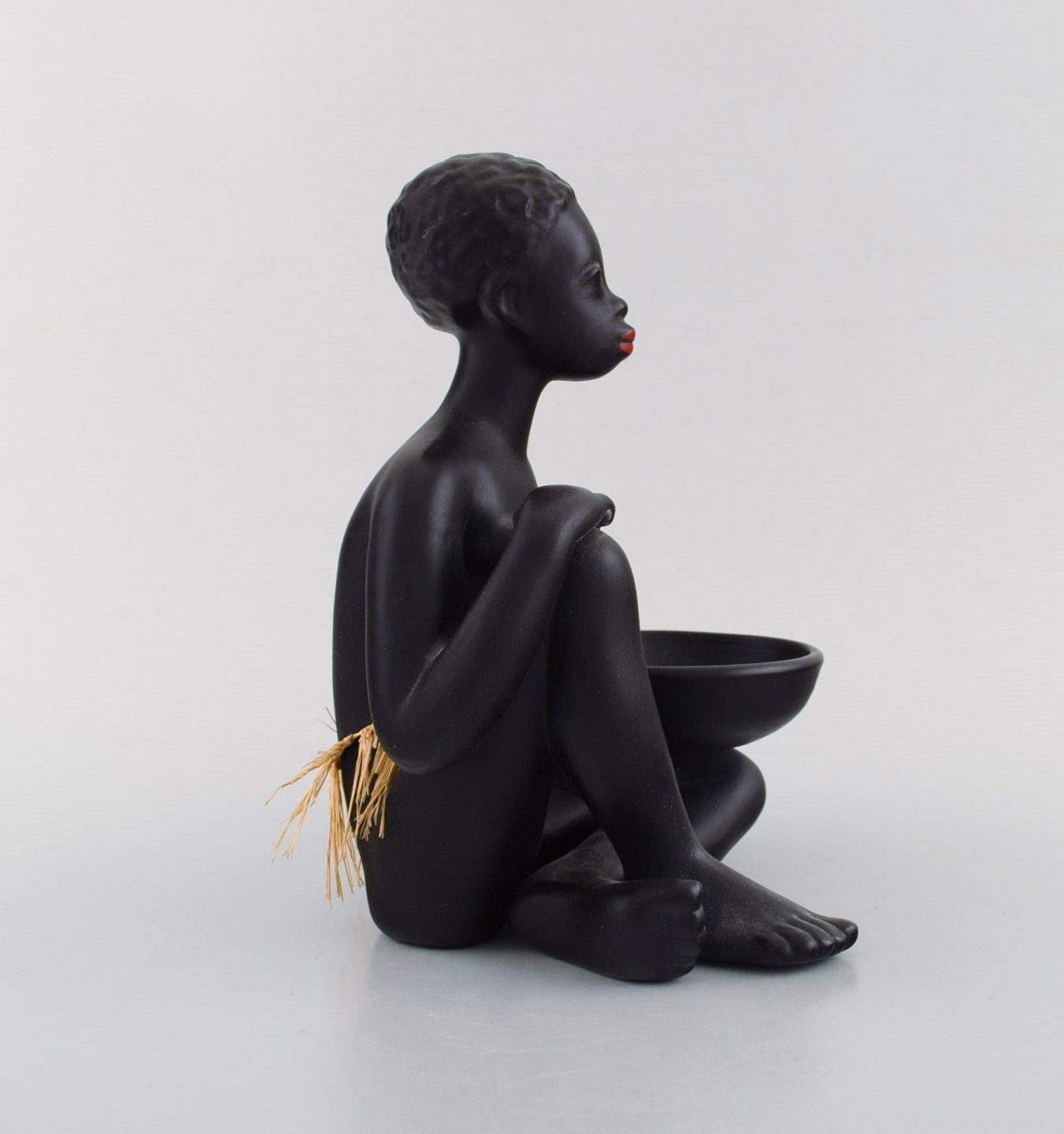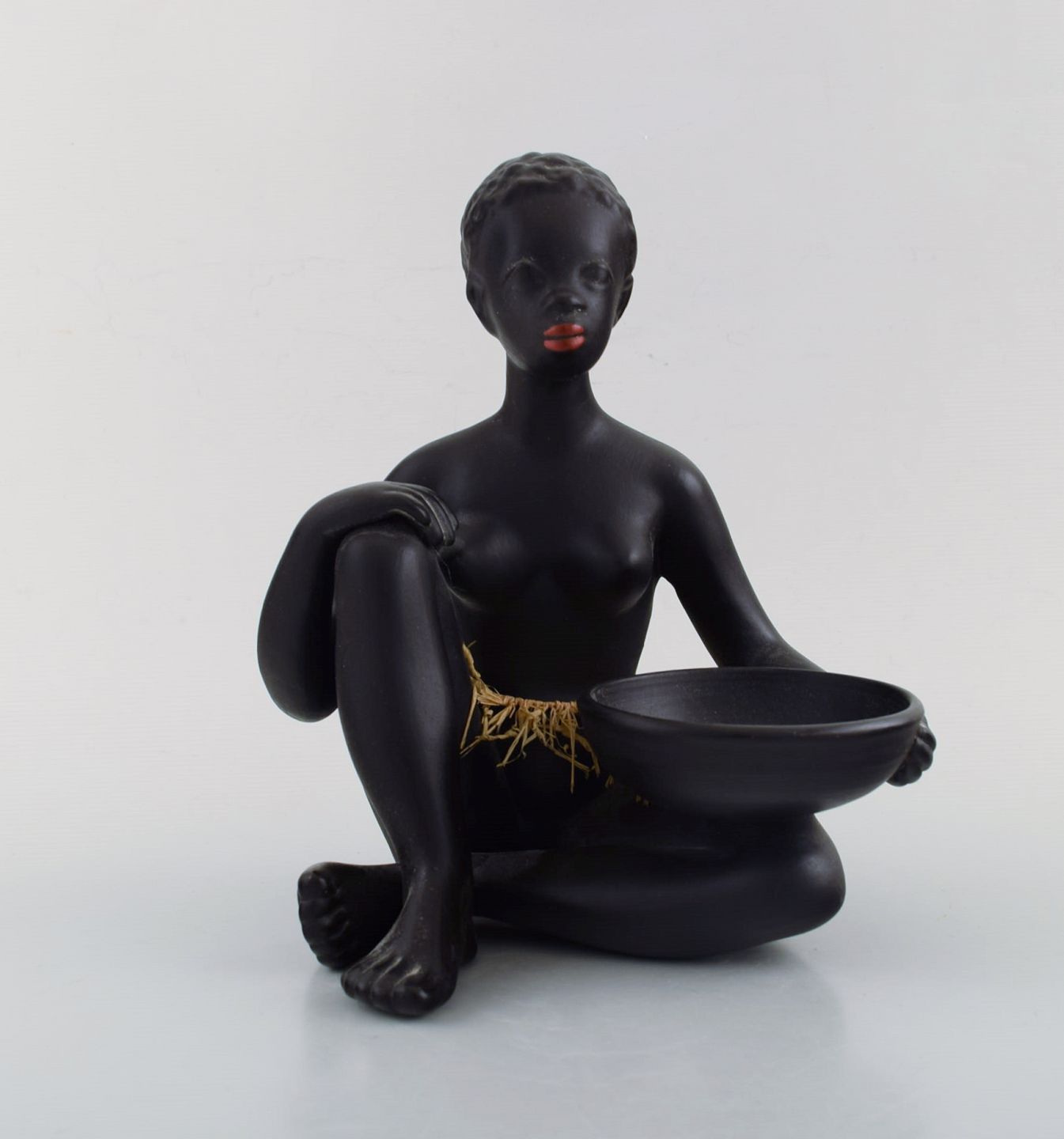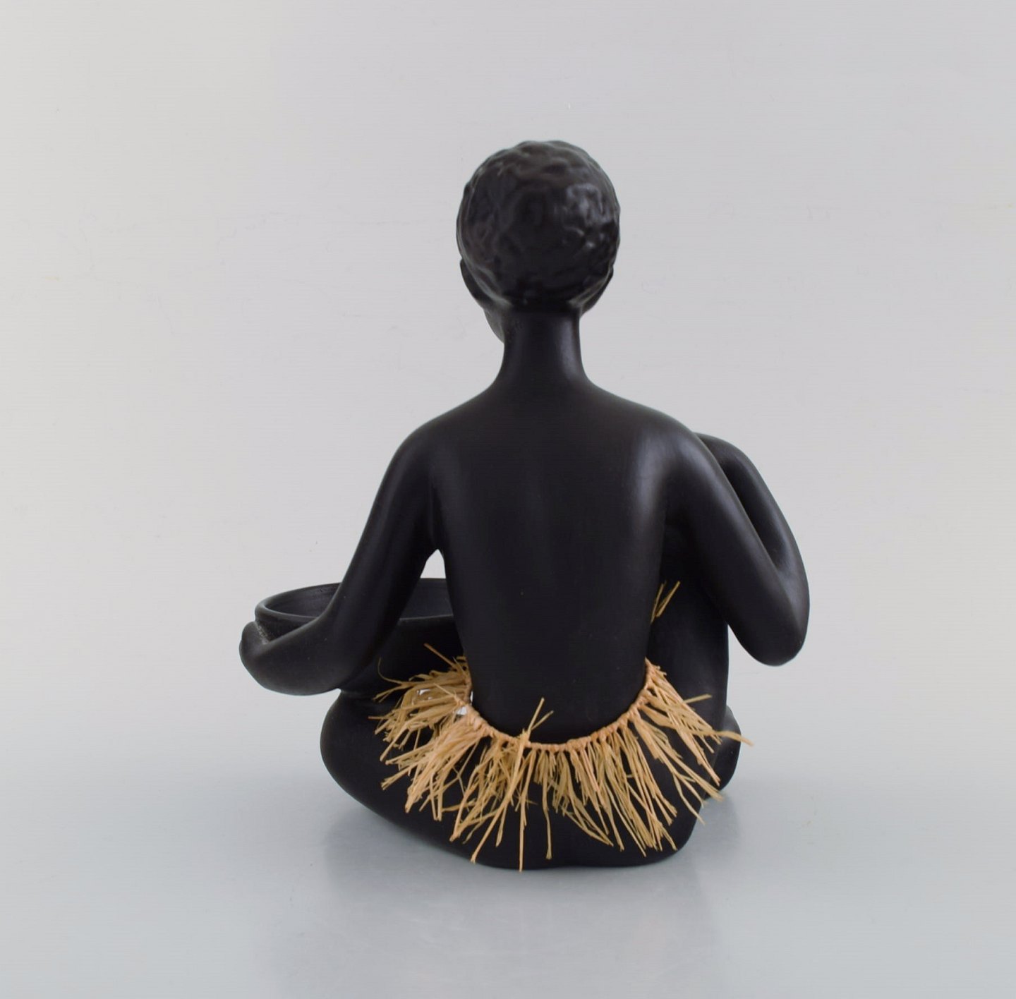 Gmunder Keramik, Østrig. Nøgen "Negresse" skulptur i sort keramik med skørt i bast. 1950'erne. Modelnummer 2220. I flot stand. Måler: 22 x 20 cm. Stemplet.